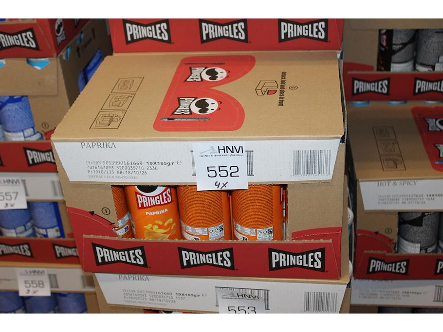Vier dozen pringles paprika. 76 bussen.