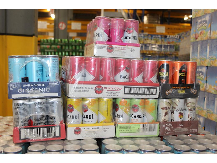 Acht verpakkingen mixdranken w.o. bacardi, malibu, passoa en captain morgan. tht vnl. 2026. totaal 108 blik...