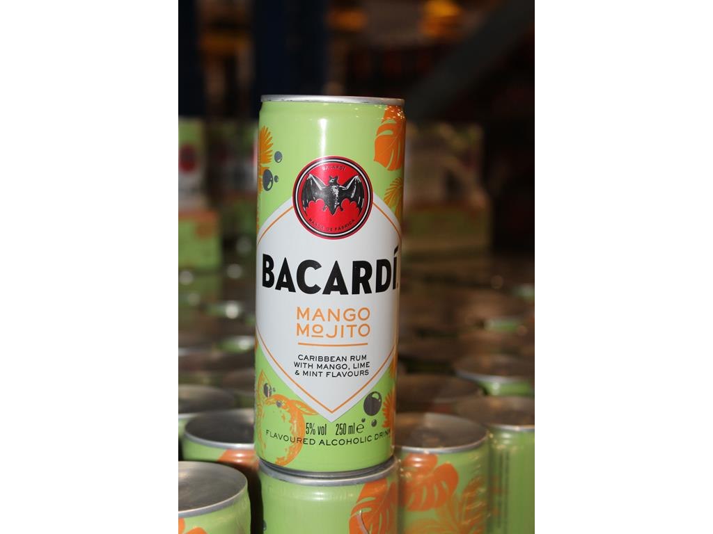 24 x 12 blikken BACARDI COLA MANGO MOJITO 0,25cl. THT 5-2026. Bod inclusief statiegeldwaarde van 43,20 euro.