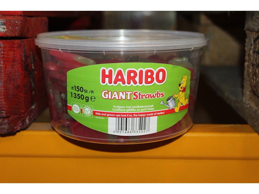 Giant strawbs haribo in 15 overdozen met 6 emmers a 1350 g. tht 6-2026.
