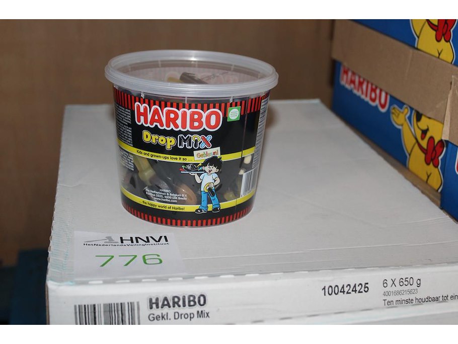 Gekleurde drop mix haribo in 3 overdozen met 6 emmers a650 g. tht 7-2026.