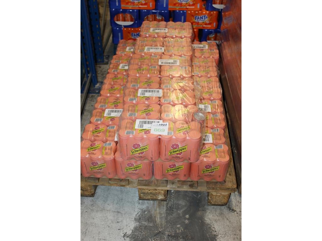 Schweppes pink grapefruit. 15 trays a 24 blikken 0,33l. totaal 360 blikken.tht 2-26. bod is inclusief 54 eu...