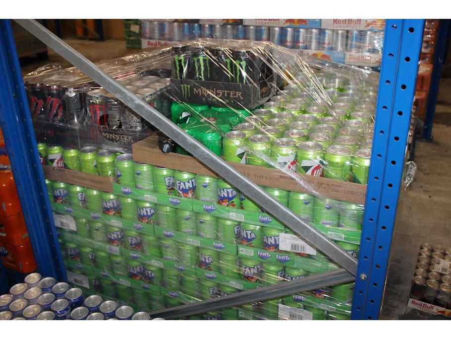 Fris en energie dranken op pallet w.o. 7UP, FANTA Exotic en MONSTER. Ca. 60 trays a 24 blikken. Totaal 1440 stuks. THT o.a. 4-26, 4-27 en 12-25.