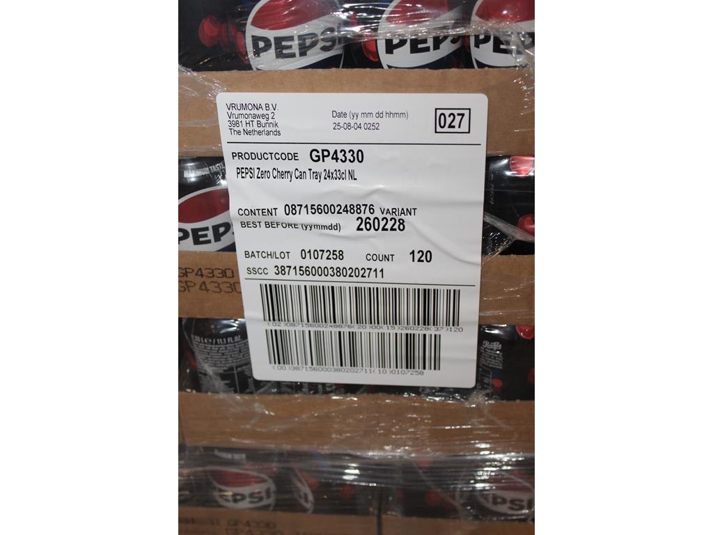 Pepsi cherry flavor. 120 trays a 24 blikken 0,33l. totaal 2880 blikken. tht 2-26. bod is inclusief 432 euro...