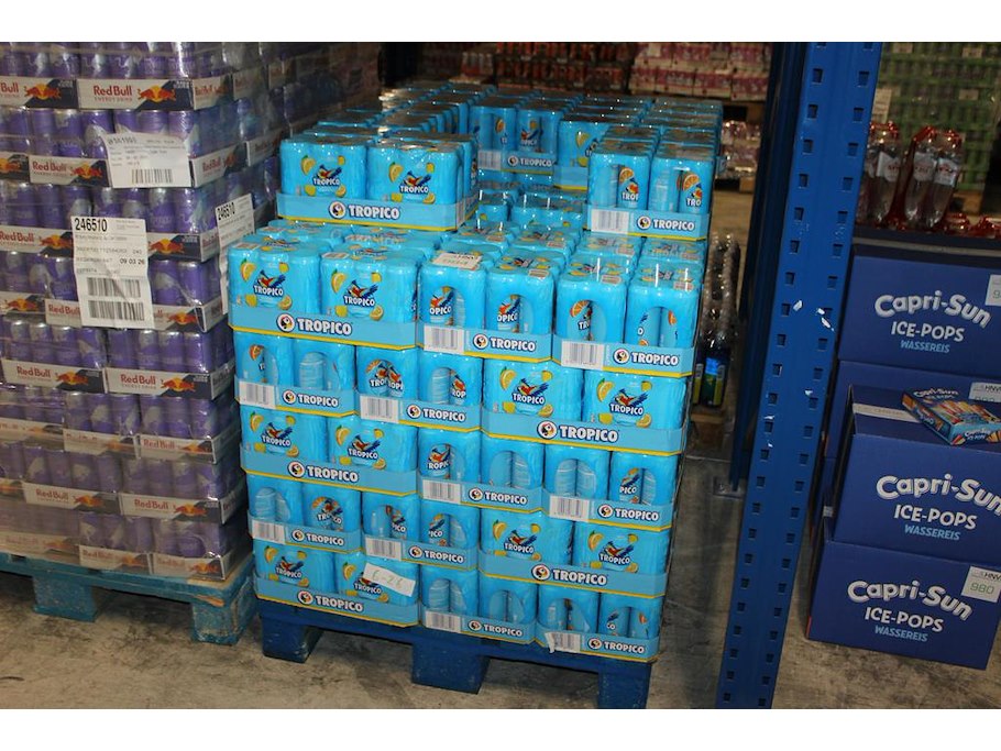 Frisdrank tropico sinaasappel ananas. 62 trays a 24 blikken 0,33l. totaal 1488 blikken. tht 6-26. bod is in...