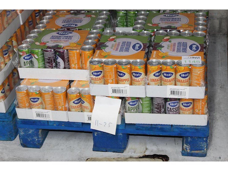 Hero frisdank mix waaronder sinaasappel, appel en cassis 288 blikken met tht 11-2025. bod is inclusief 43,2...
