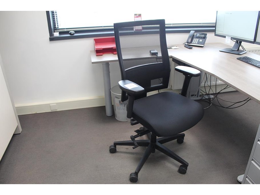 Verrijdbare bureaustoel zwart gestoffeerd. diverse ergonomische instellingen