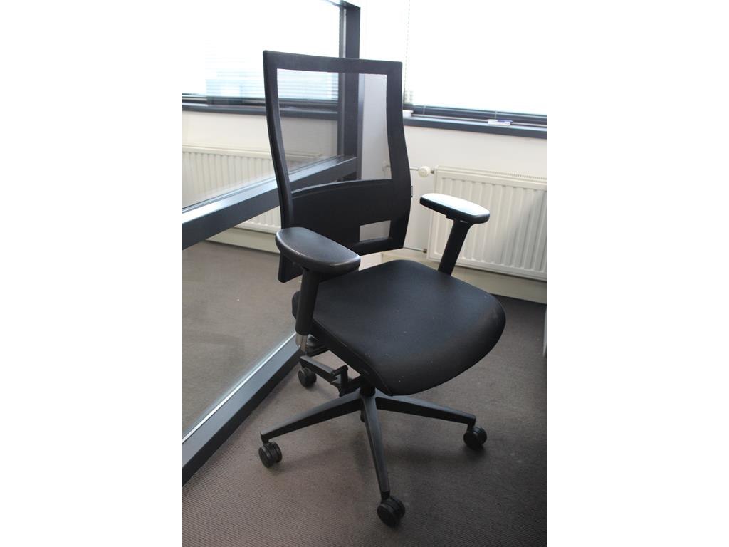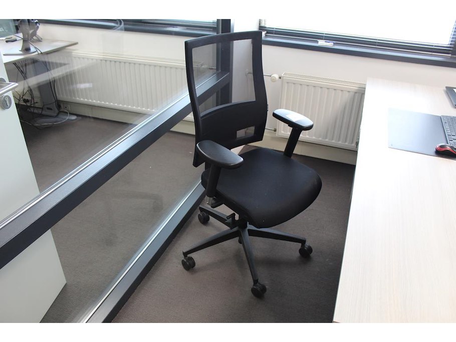 Verrijdbare bureaustoel zwart gestoffeerd. diverse ergonomische instellingen