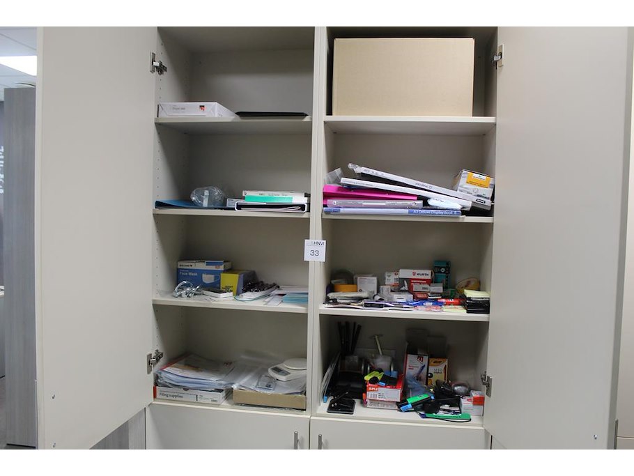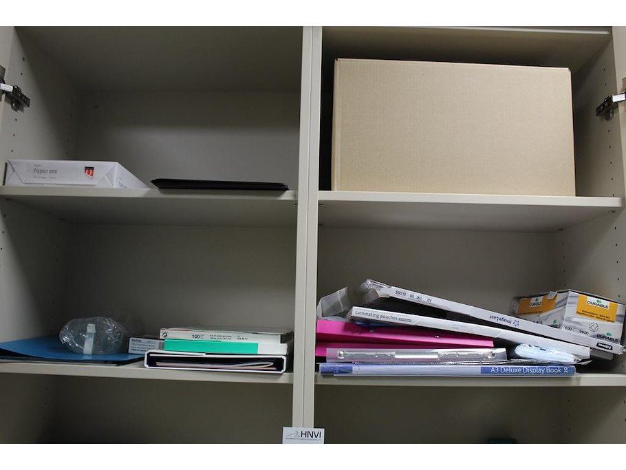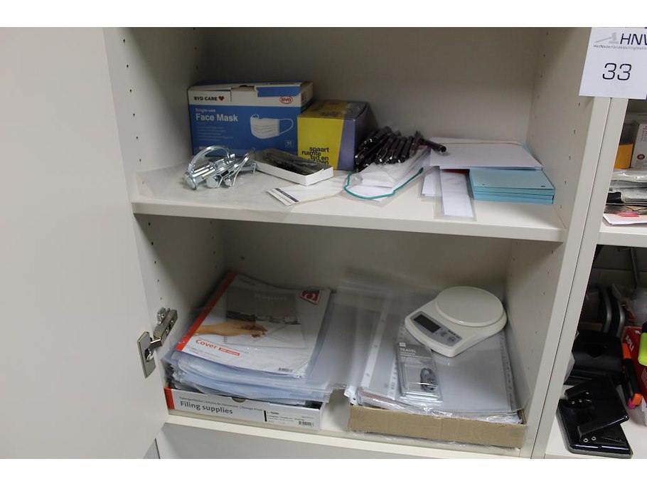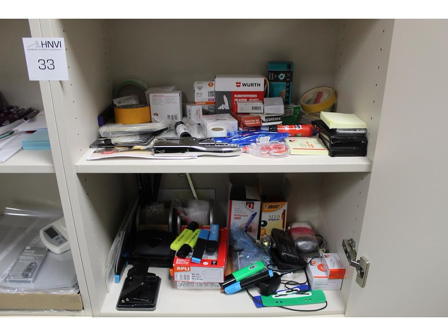 Kantoormaterialen in twee kasten w.o. schrijfgerei, lamineervellen, insteekhoezen, perforatoren, nietjes etc.
