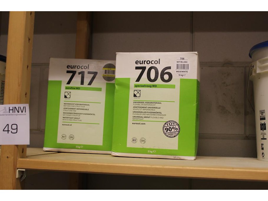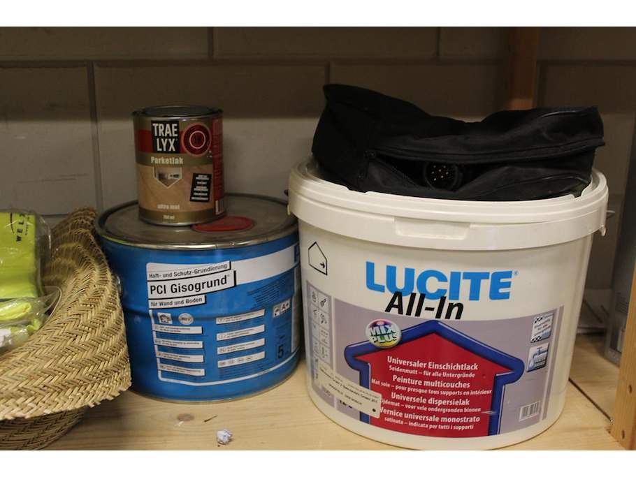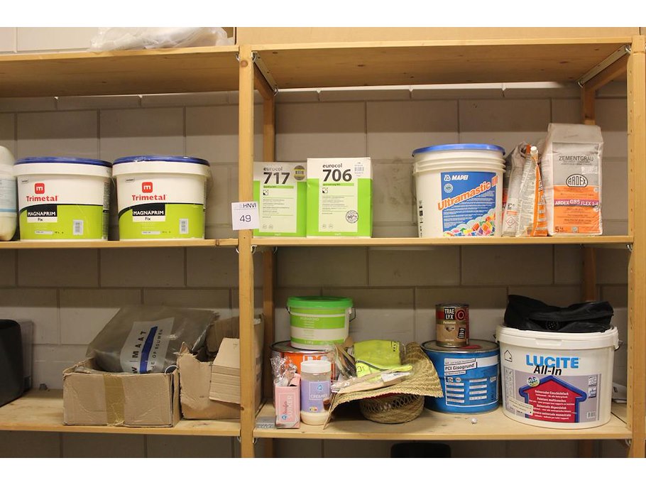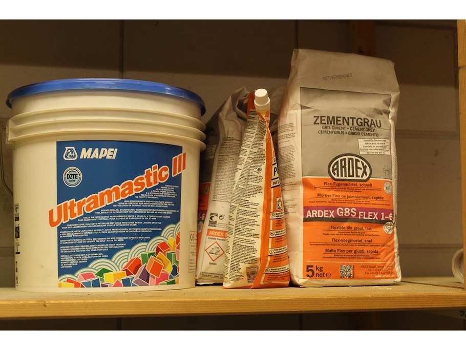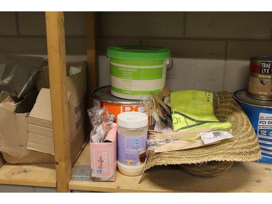 Bouwmaterialen op vier schappen w.o. magnaprim, eurofix tack plus, universeel voegmateriaal, waterdicht voegmateriaal, primer etc.
