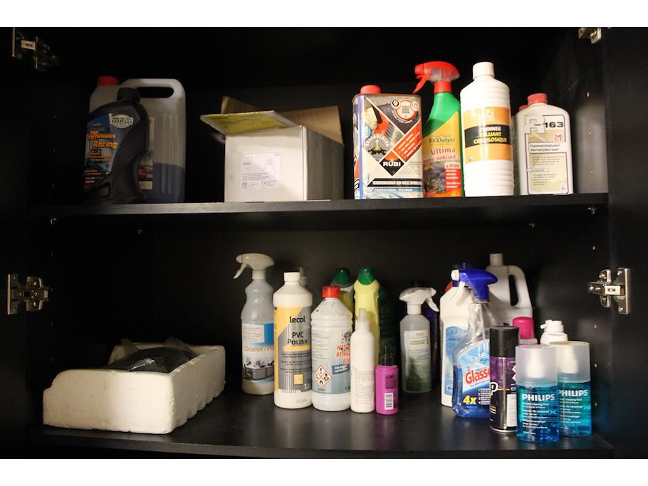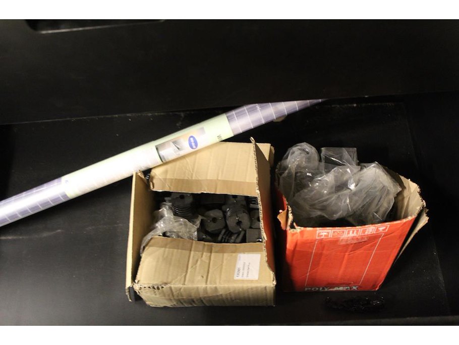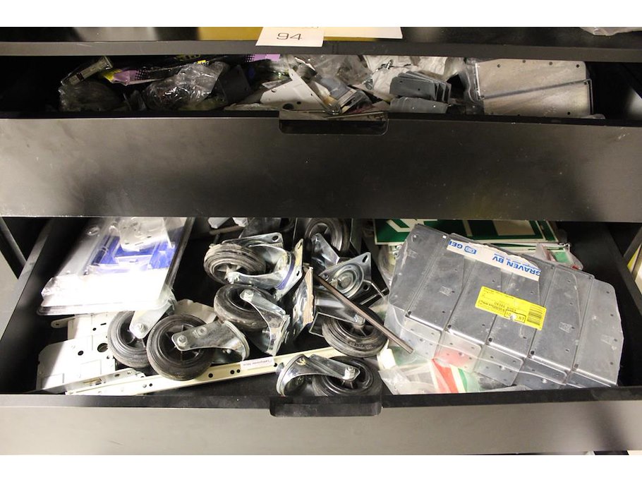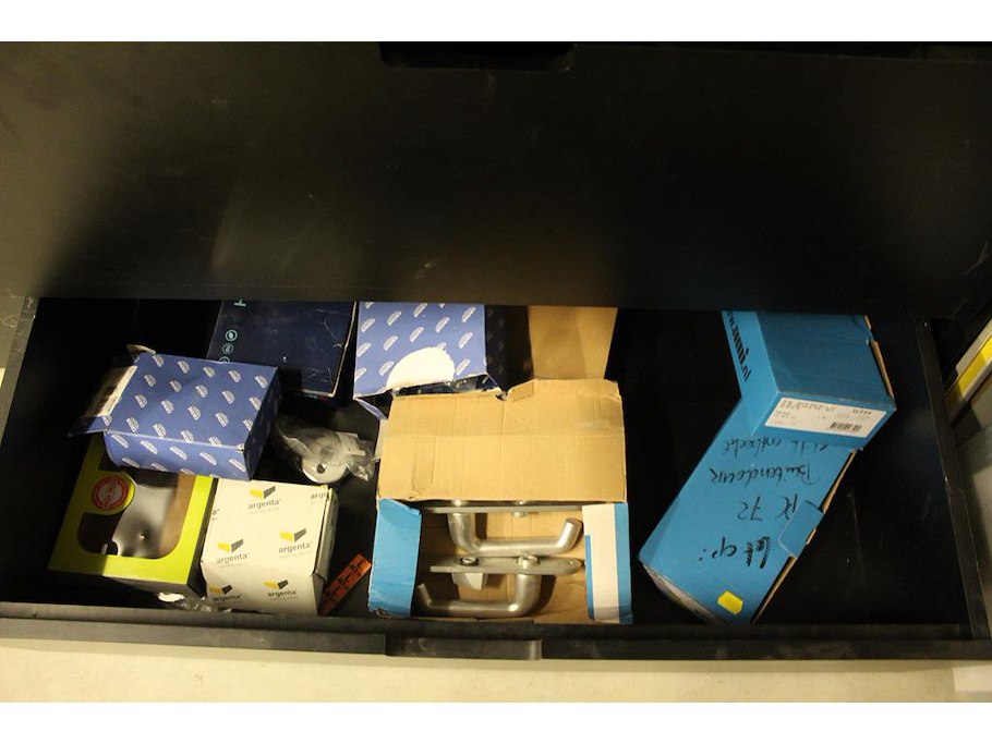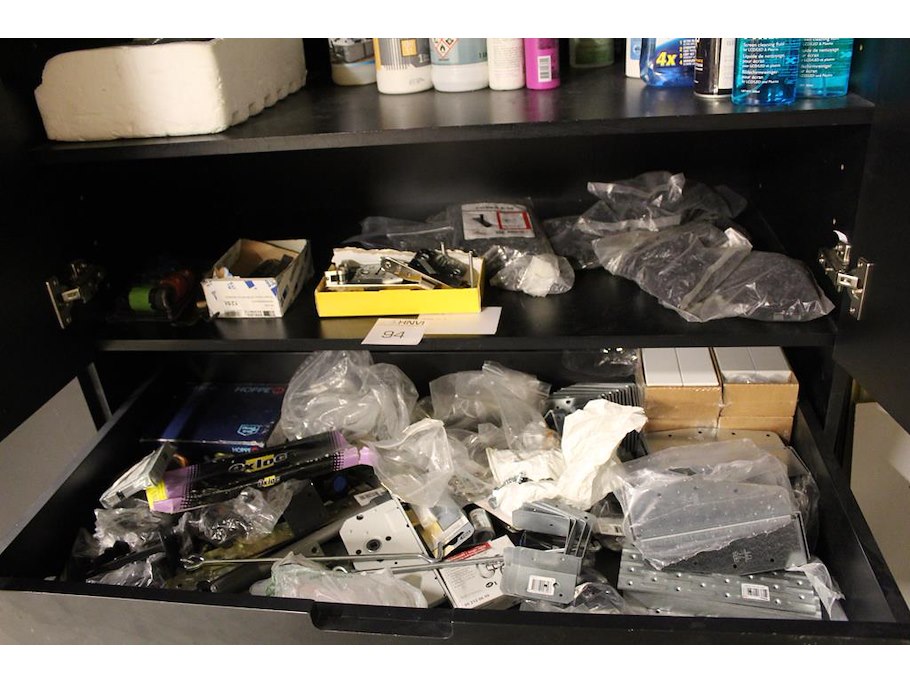 Inhoud magazijnkast w.o. hang en sluitwerk, bevestigingsmaterialen, balkdragers, schoonmaakmaterialen etc.