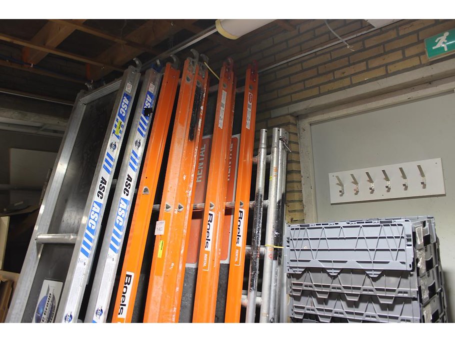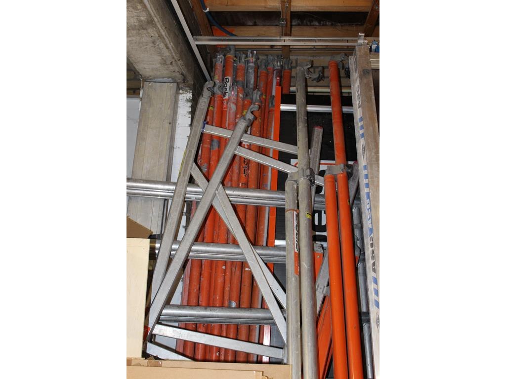 Bouwsteiger Boels bestaande uit 10 zijdelen, 7 loopplanken, 4 stutten, 2 leuningen, 4 wielen en ca. 20 schoren / diagonalen.