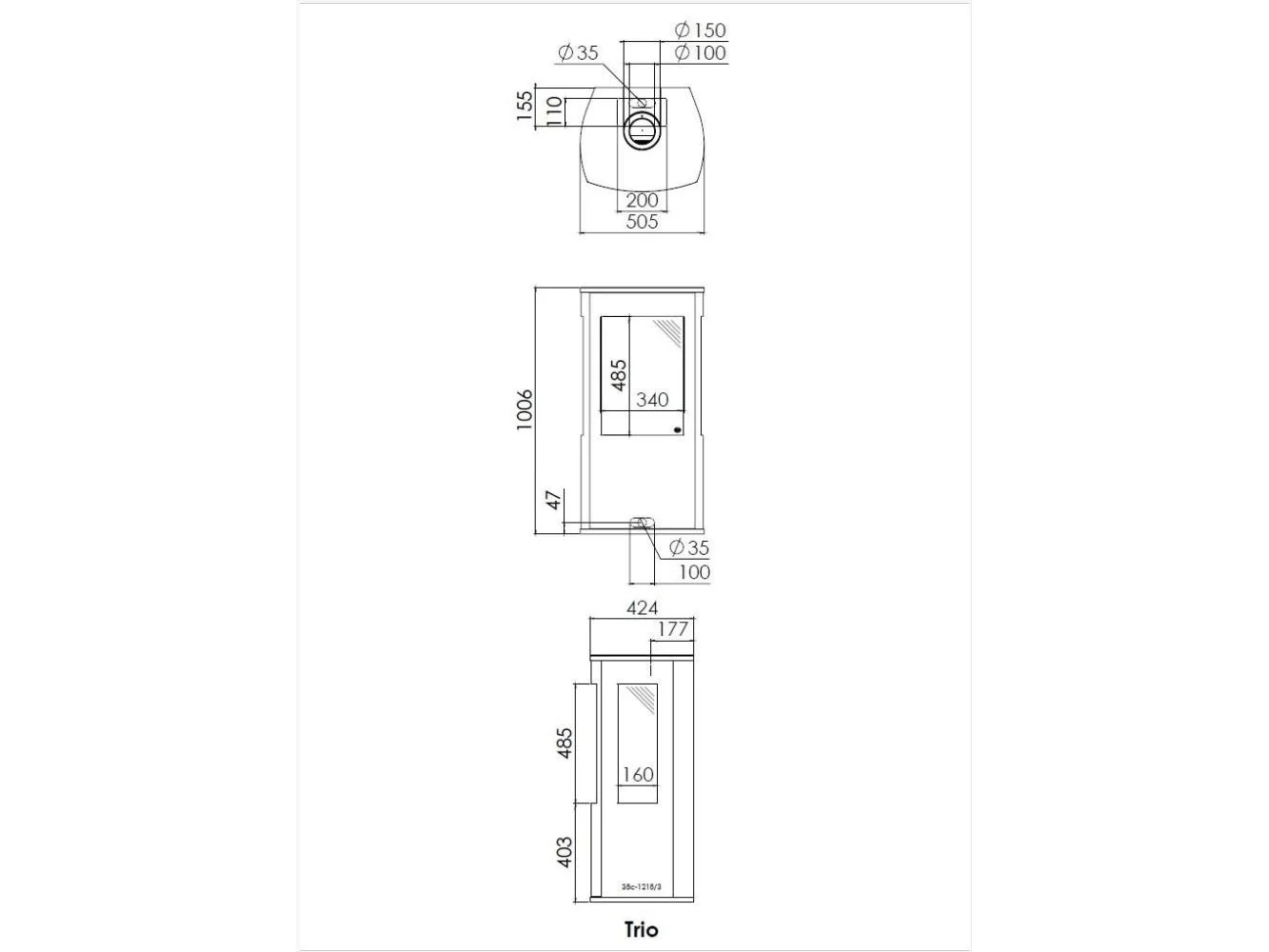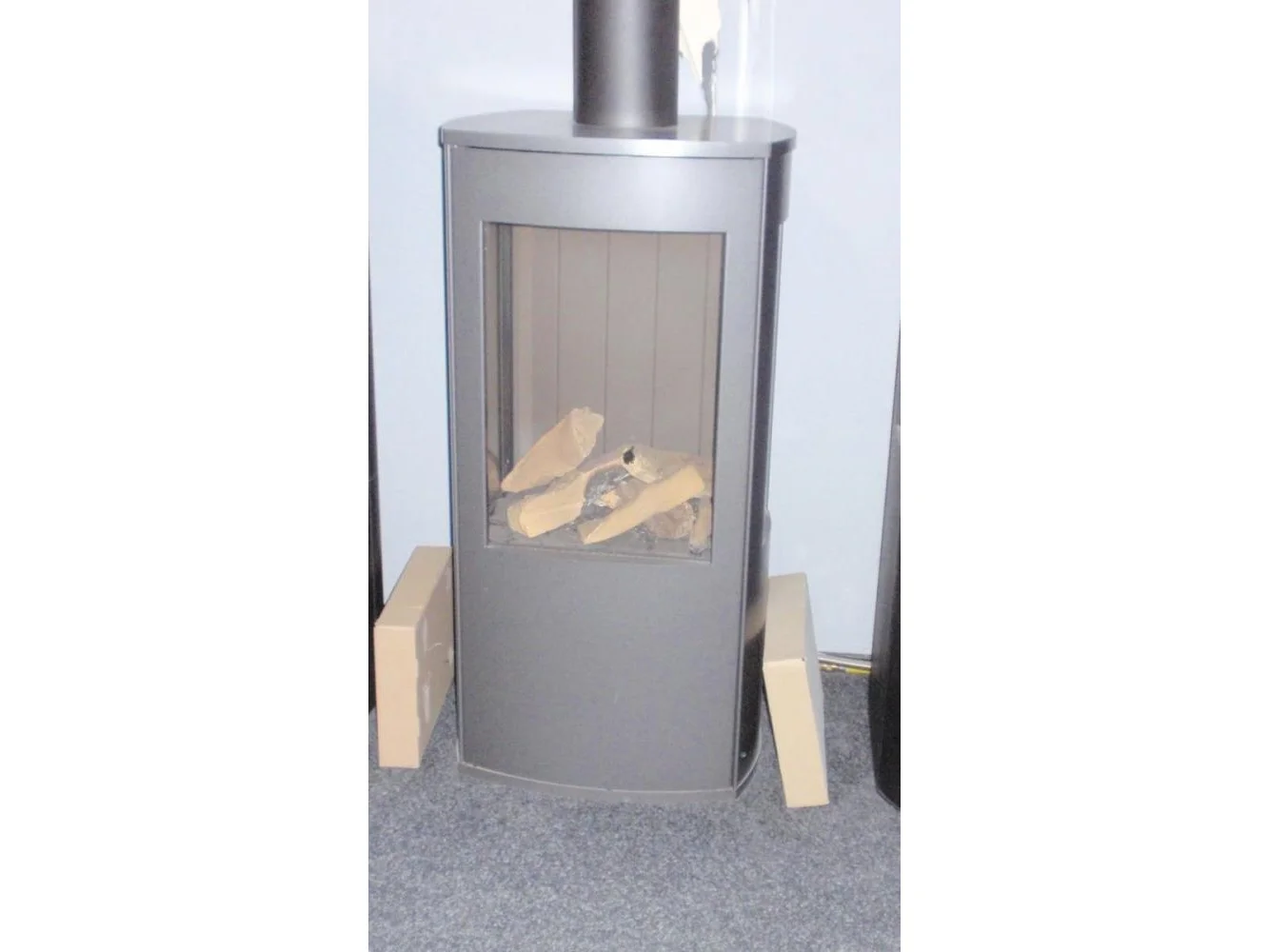 Dru vrijstaande gesloten gashaard model Trio 3-Zijdig Natural Gas Nederland, aansluitig afvoerkanaal Ø100/150, vrijstaande maten: breedte: 550mm, hoogte: 1006mm, diepte 424mm (nieuw in de verpakking)