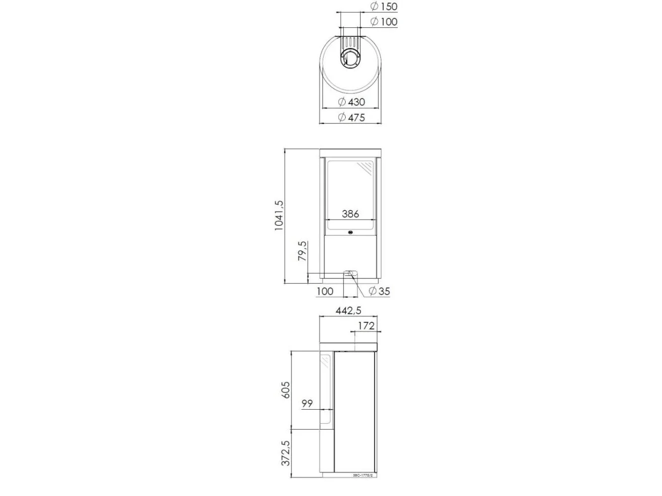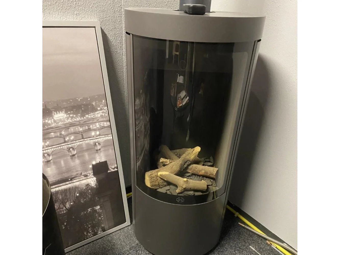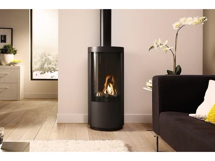 Dru vrijstaande gesloten gashaard model Circo rond model met halfrond glas Natural Gas Nederland, aansluiting afvoer kanaal Ø100/150, vrijstaande maten: breedte: 475mm, hoogte: 1041,5mm, diepte: 475mm (showroom model) (gebruikt)
