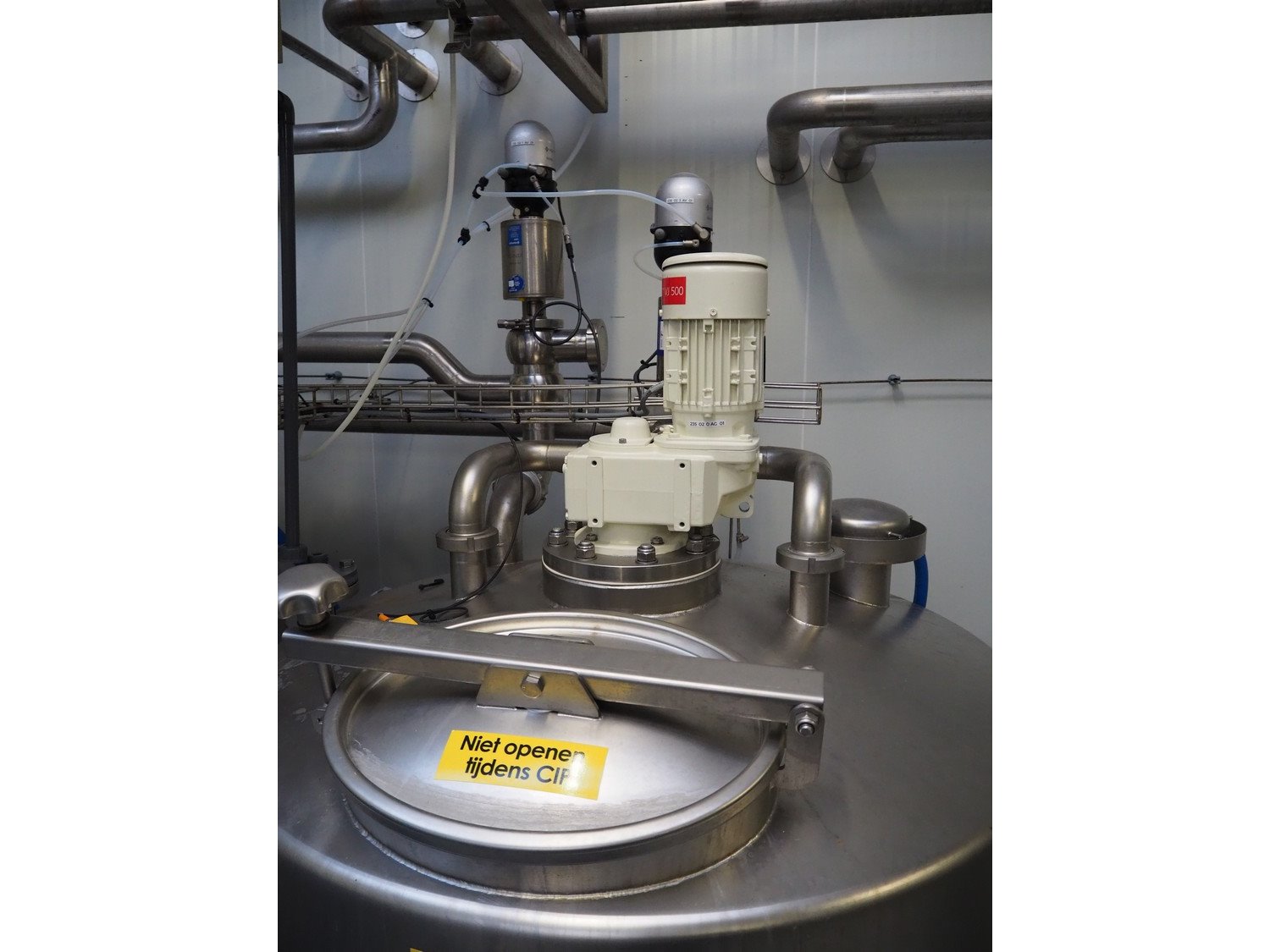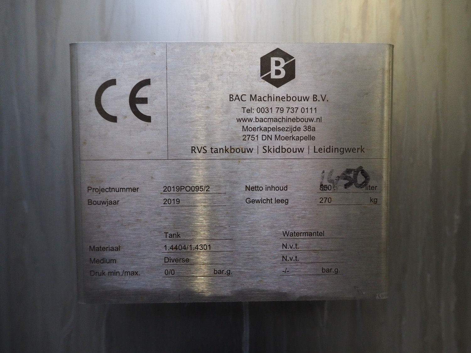 BAC Machinebouw B.V. s/s double jacketed mixing tank with agitator and 3 Pentair valves, year of construction: 2019, volume: 1450 liter, weight: 270 kg, dimensions: 1100 mm x 1100 mm x 3000 mm. Kavel locatie: Drosteweg 6-8, 8108 NB Raalte, Nederland