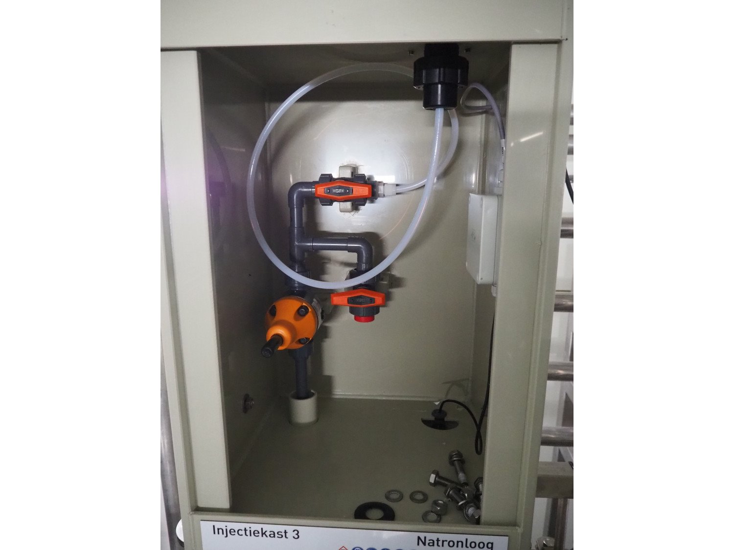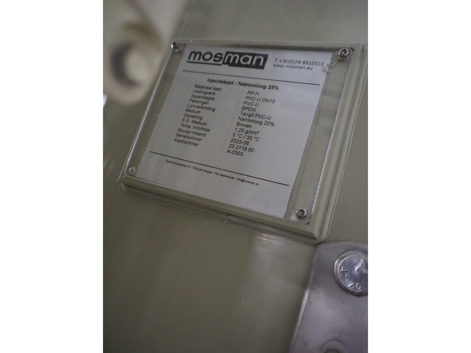 Mosman caustic soda injection cabinet, serial number: 23.2119.50, year of construction: 08/2023, dimensions: 400 mm x 450 mm x 600 mm. Kavel locatie: Drosteweg 6-8, 8108 NB Raalte, Nederland