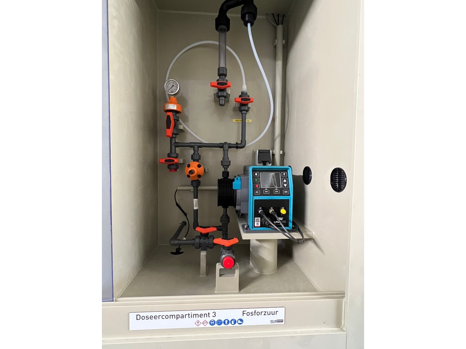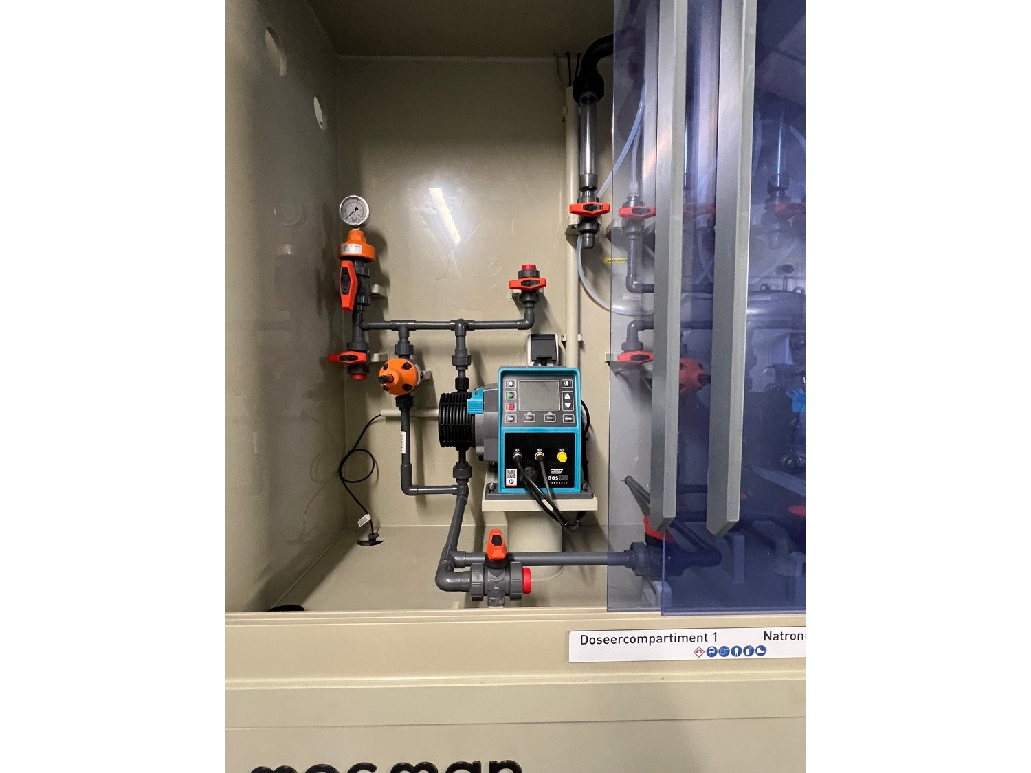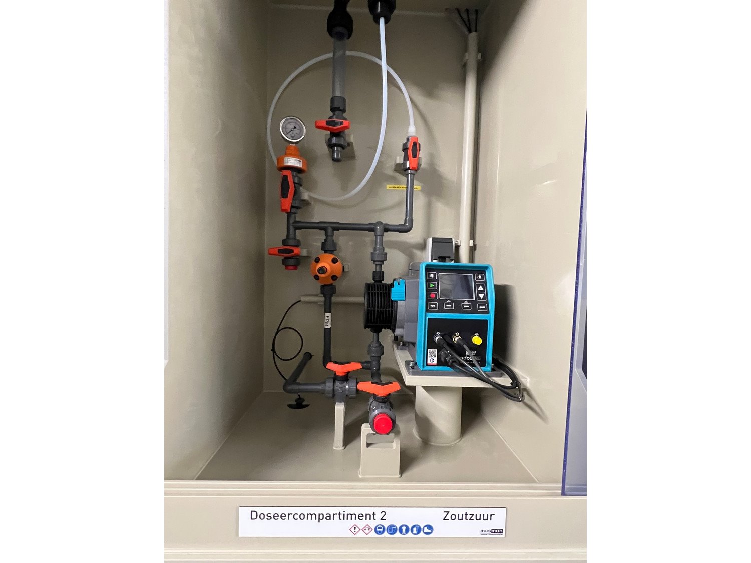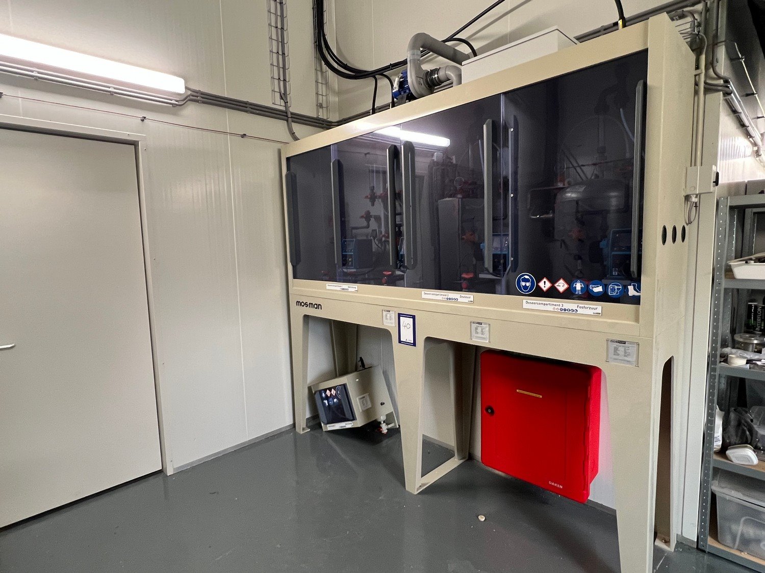 Mosman dosing cabinet for caustic soda, hydrochloric acid, and phosphoric acid, dimensions: 2600 mm x 650 mm x 2800 mm. Kavel locatie: Drosteweg 6-8, 8108 NB Raalte, Nederland