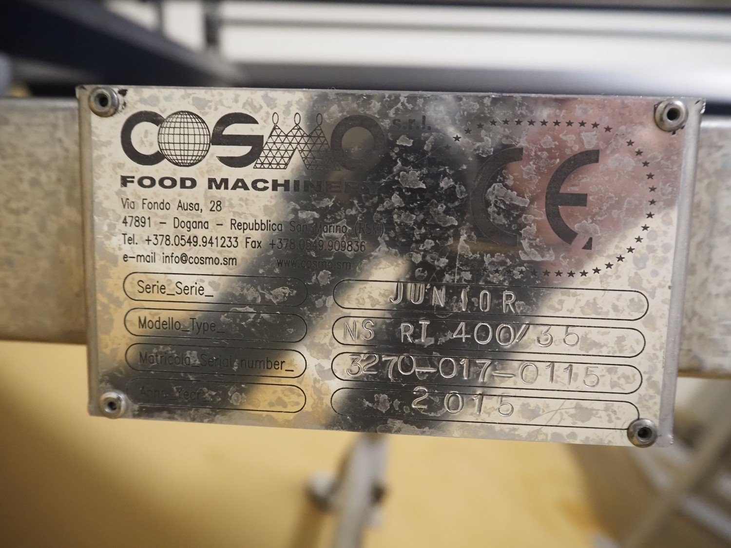 Cosmo Food Machinery s.r.l. elevating belt, type: NS RT 400/35, serial number: 3270-017-0115, year of construction: 2015, plastic mesh belt, belt width: 600 mm, elevating height: 2150 mm, total dimensions: 3600 mm x 1100 mm x 2300 mm. Kavel locatie: Via Pezze Lunghe di Sotto 11, 36026 Pojana Maggiore, Italië