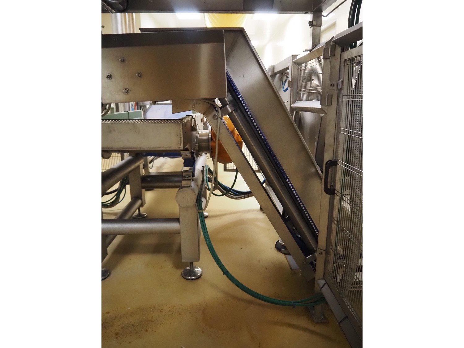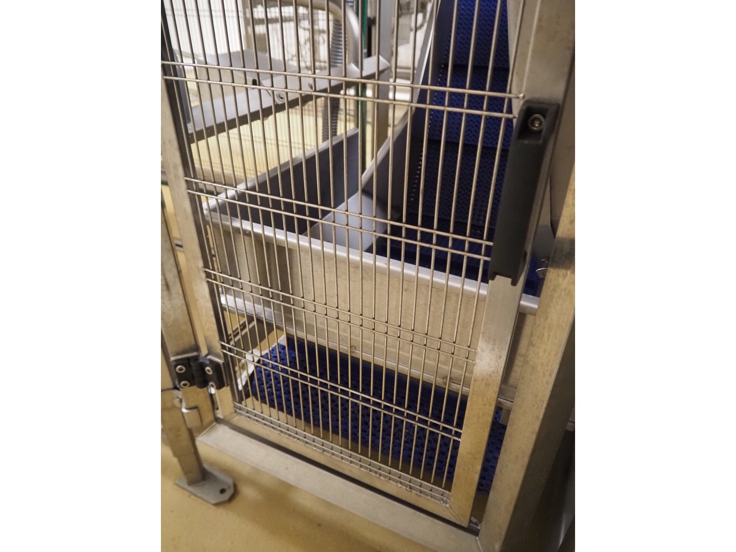 Cosmo Food Machinery s.r.l. elevating belt, plastic mesh belt with dividers, belt width: 450 mm, divider height: 25 mm, distance between dividers: 210 mm, elevating height: 1150 mm, total dimensions: 1600 mm x 700 mm x 1300 mm. Kavel locatie: Via Pezze Lunghe di Sotto 11, 36026 Pojana Maggiore, Italië