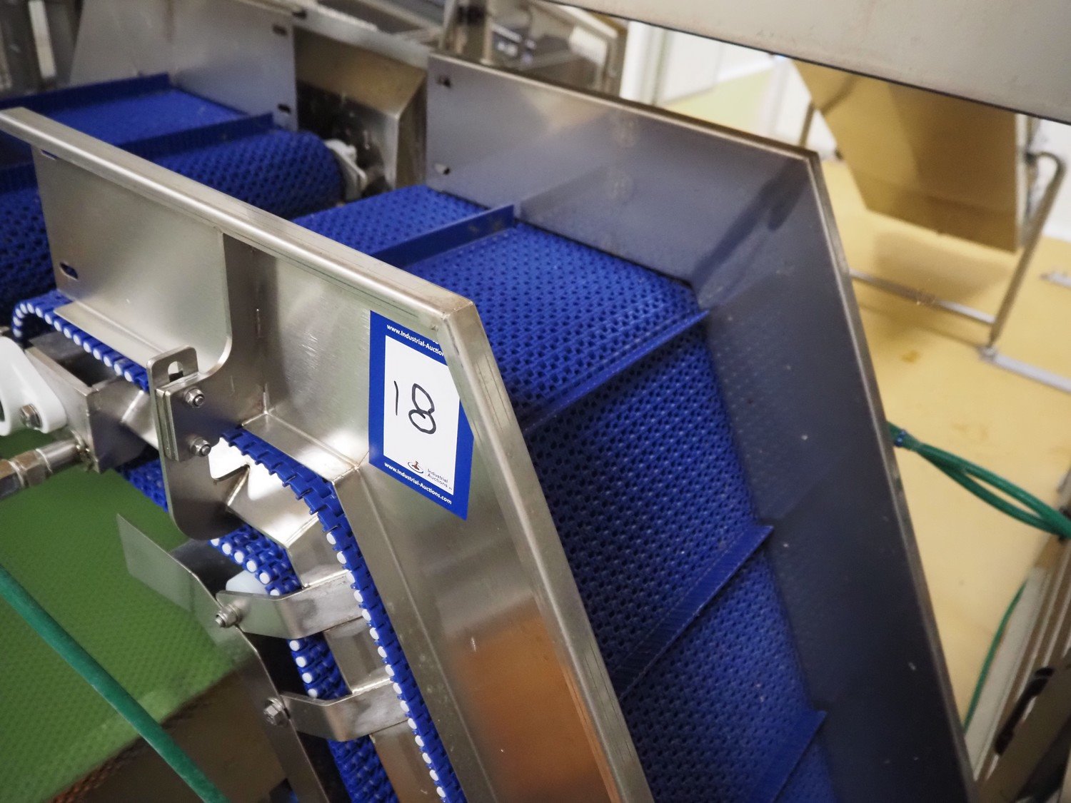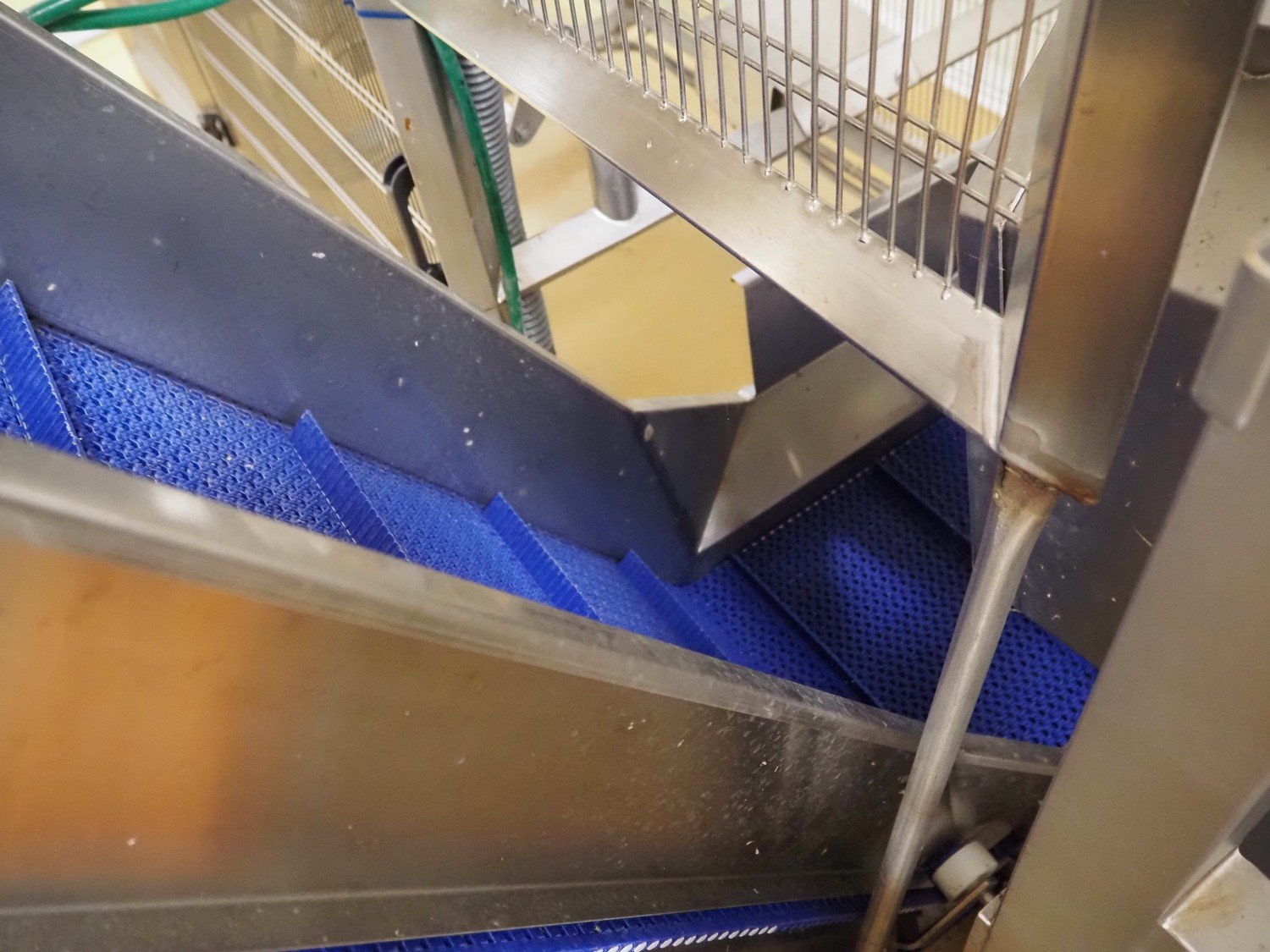 Cosmo Food Machinery s.r.l. elevating belt, plastic mesh belt width dividers, belt width: 450 mm, divider height: 25 mm, distance between dividers: 210 mm, elevating height: 1150 mm, total dimensions: 1600 mm x 700 mm x 1300 mm. Kavel locatie: Via Pezze Lunghe di Sotto 11, 36026 Pojana Maggiore, Italië