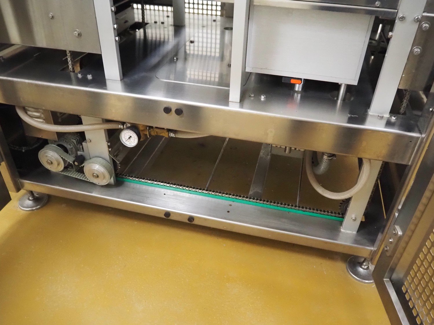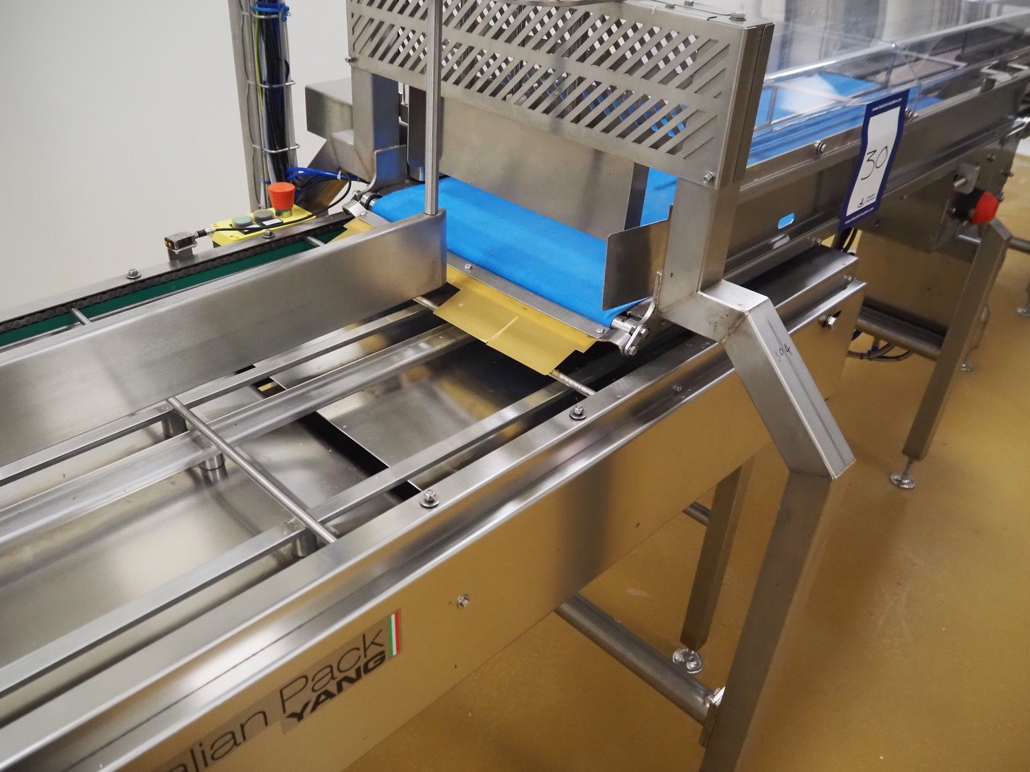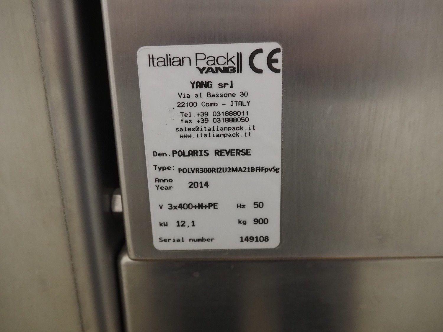 Italian Pack Yang s.r.l. traysealer, type: POLVR300RI2U2MA21BFIFpv5g, serial number: 149108, year of construction: 2014, 400 V, 3 Ph, 50 Hz, 12.1 kW, weight: 900 kg, film width: 490 mm, diameter dye: (2x) 200 mm, plastic outfeed belt, belt width: 550 mm, total dimensions: 4050 mm x 1000 mm x 1750 mm. Voor meer informatie klik op de volgende link: MANUALE_CONFEZIONATRICE_POLARIS_VAC_REVERSE_COMEK_149108.pdf Kavel locatie: Via Pezze Lunghe di Sotto 11, 36026 Pojana Maggiore, Italië