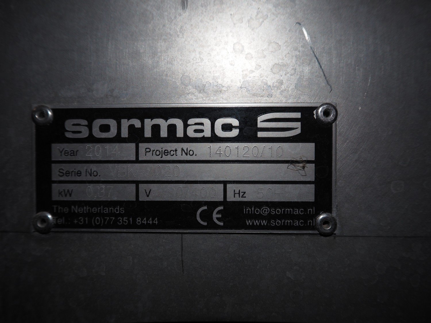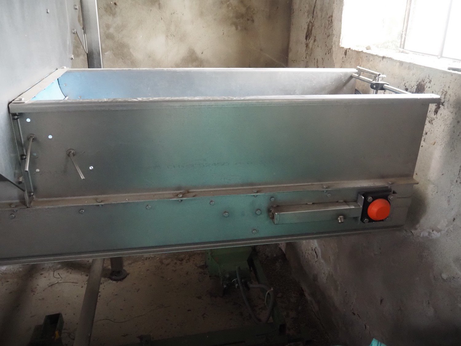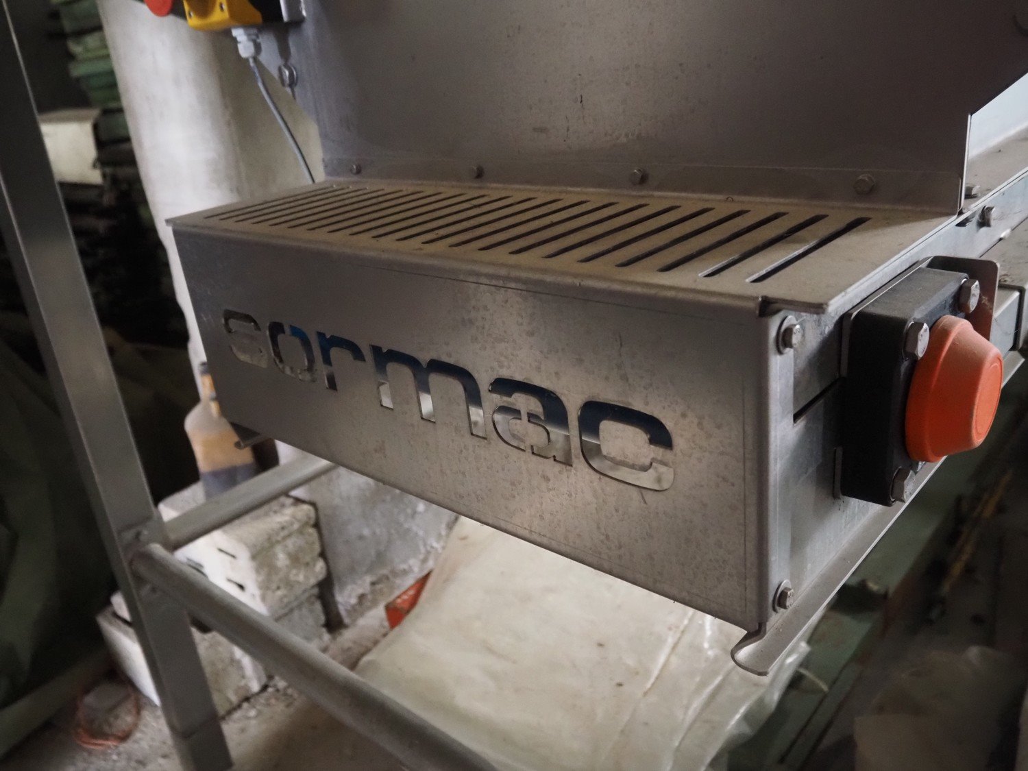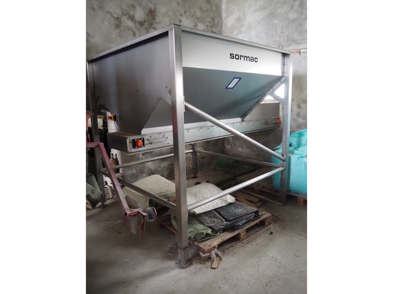 Sormac infeed bunker with outfeed belt, serial number: VBK-2020, year of construction: 2014, 230/400 V, 50 Hz, 0.37 kW, plastic belt, belt width: 500 mm, total dimensions: 3500 mm x 2200 mm x 2350 mm. Kavel locatie: Via Pezze Lunghe di Sotto 11, 36026 Pojana Maggiore, Italië