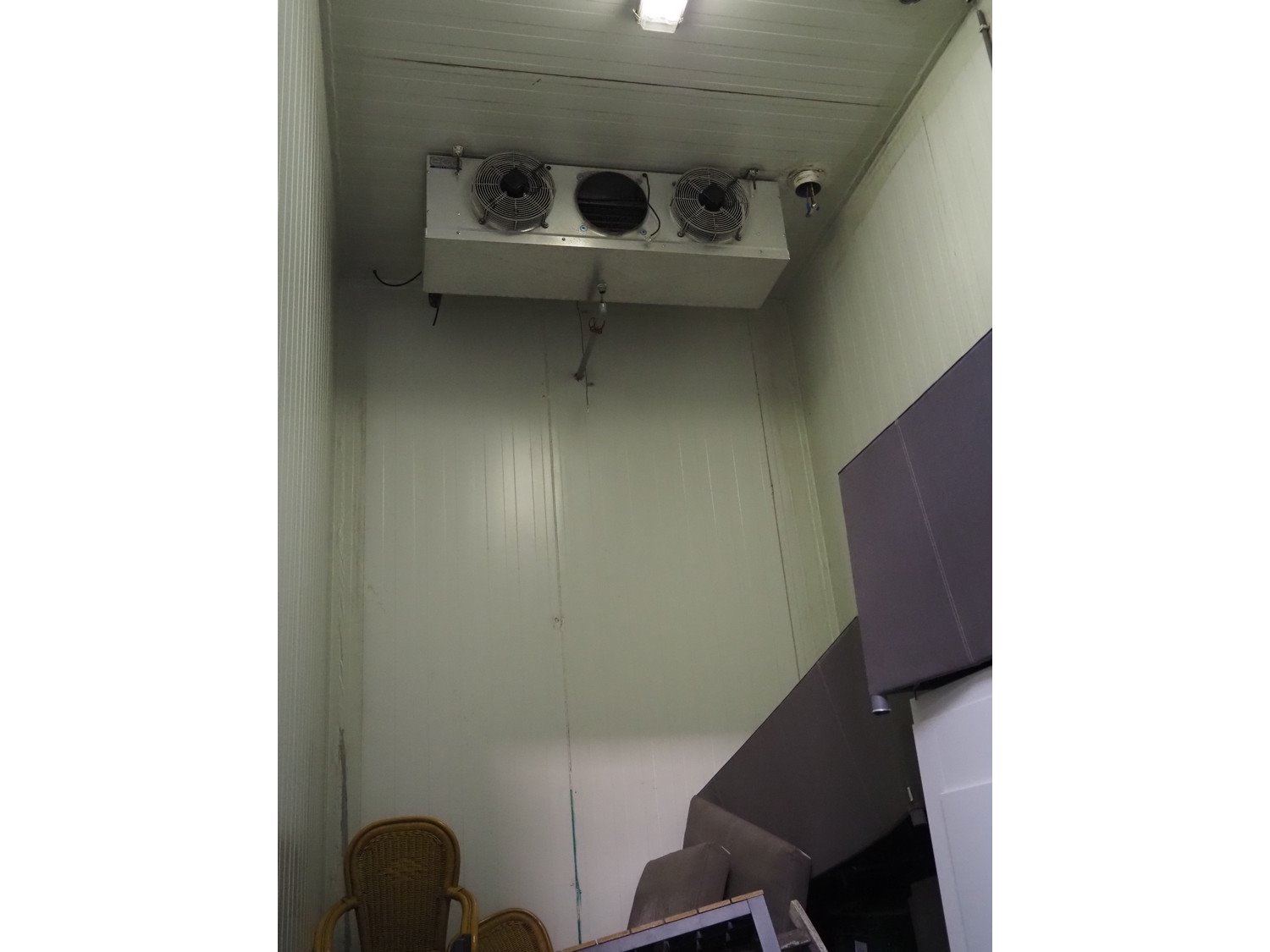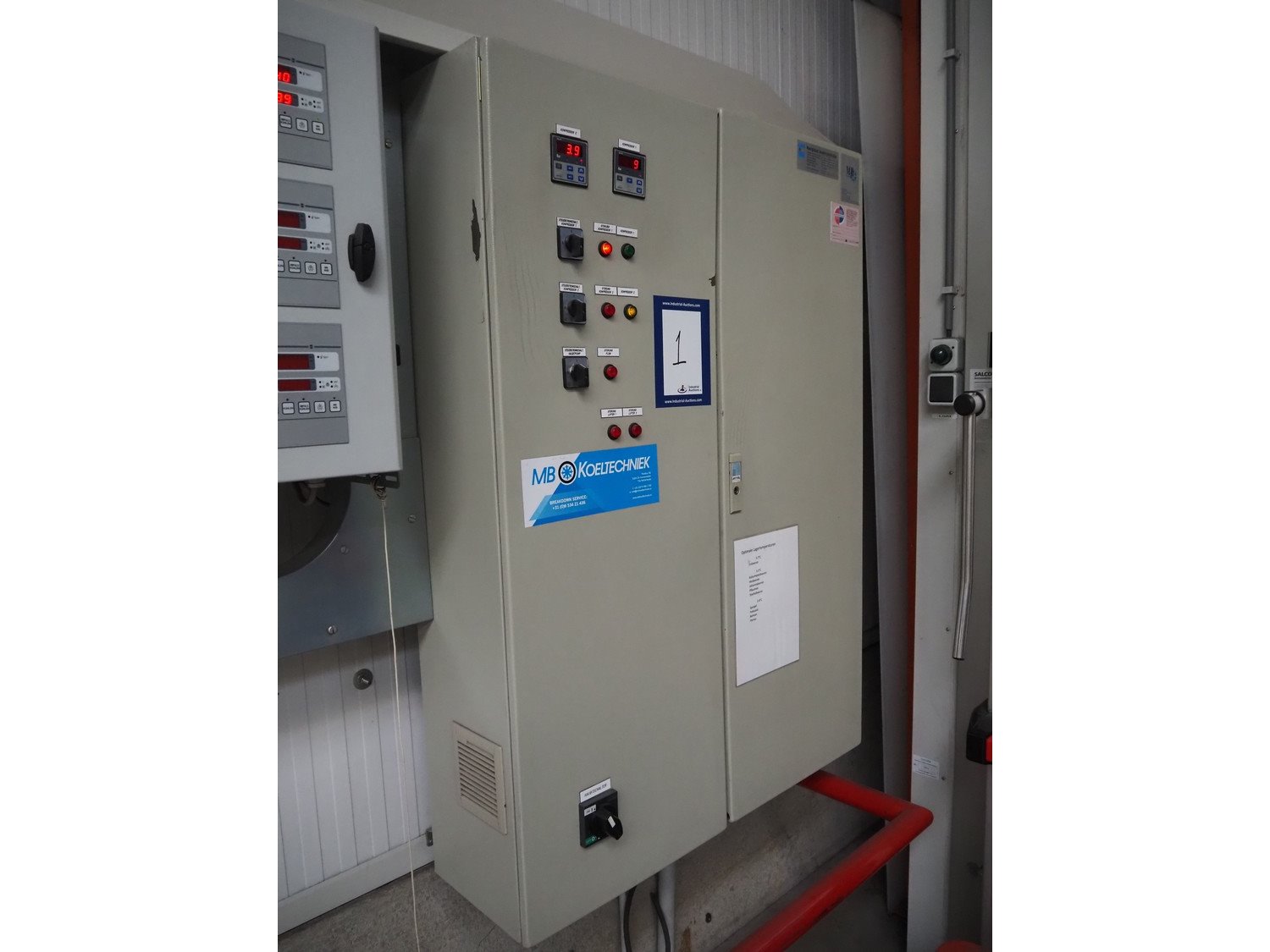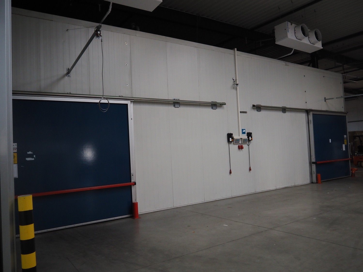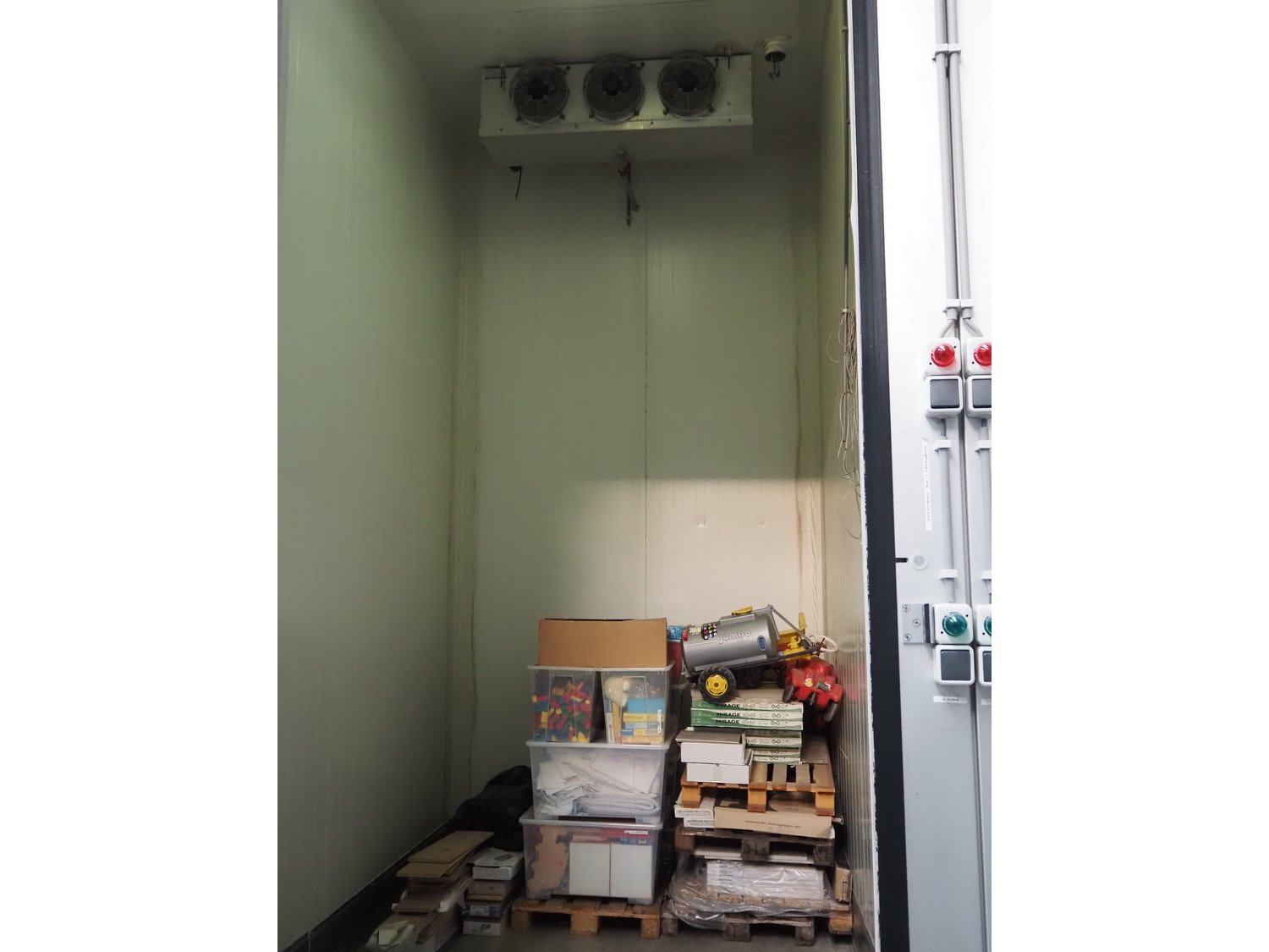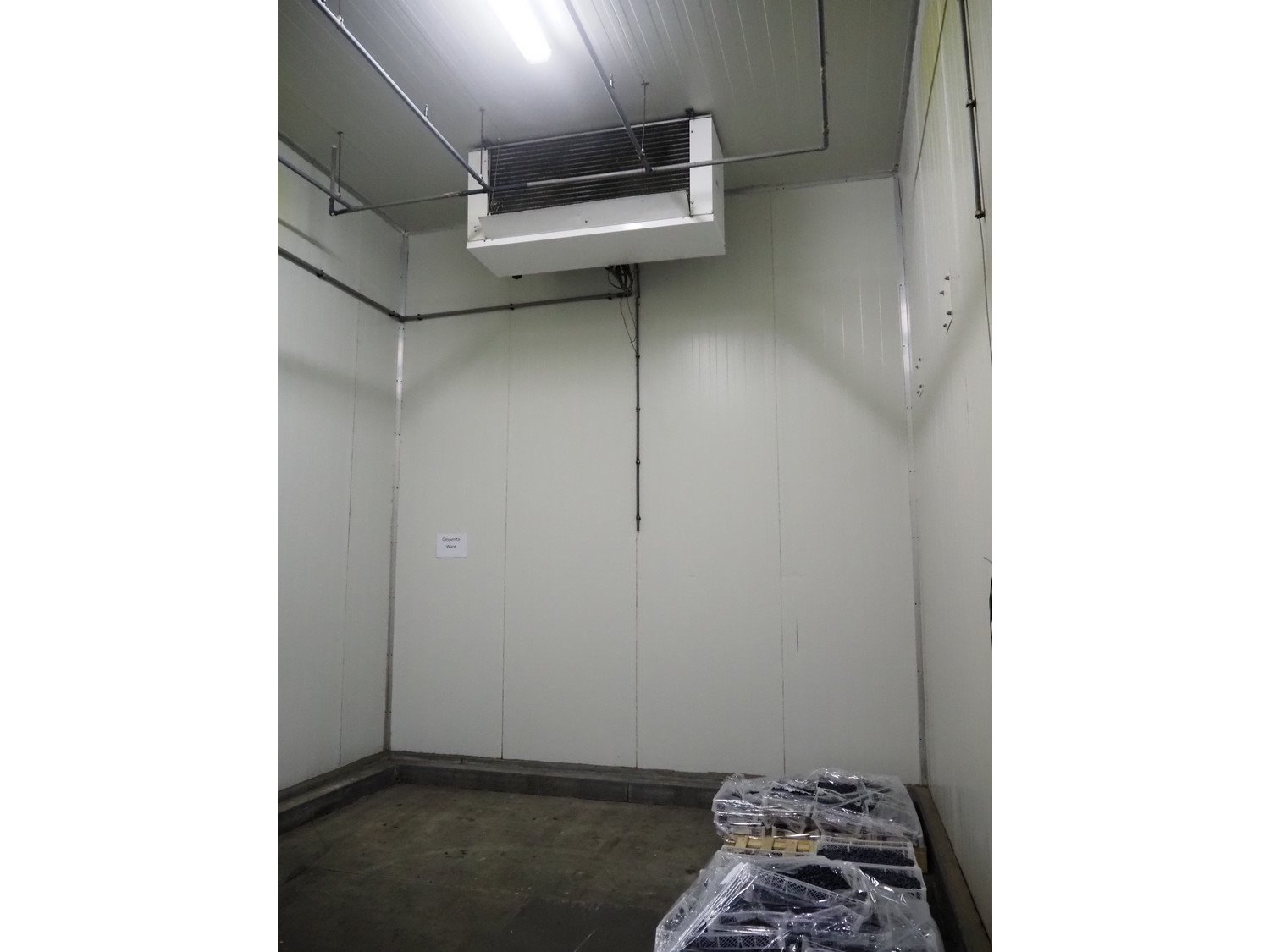 Complete cold store consisting of: 6 compartments, dimensions compartments: (2x) 7000 mm x 12500 mm x 5000 mm, (1x) 4500 mm x 6800 mm x 5000 mm and (3x) 2500 mm x 4500 mm x 5000 mm, total dimensions coldstore: 15000 mm x 17200 mm x 5300 mm, 6 pcs. Salco refrigerated sliding doors, dimensions: (3x) 3100 mm x 3050 mm / thickness: 120 mm and (3x) 1500 mm x 4100 mm / thickness: 120 mm, 2 pcs. Hӧrmann electric shutter doors, type: V5015SE, year of construction: 2005, dimensions: (2x) 3000 mm x 3000 mm, 9 pcs. evaporators, brands: Güntner / Helpman and ECO, Bock compressor rack with 2 cooling compressor, type: (1x) HGX4/650-4 S, number: AG04695-008, year of construction: 2000, capacity: 56.6 m³ per hour and (1x) HGX5/830-4 S, number: AG03608-006, year of construction: 2000, capacity: 72.2 m³ per hour, refrigerant: R404A, total dimensions compressor rack: 2350 mm x 1400 mm x 1500 mm, Helpman roof condenser, 2 fans, dimensions: 4200 mm x 1300 mm x 1300 mm, Switch cabinet for complete cooling installation. Compressor rack / roof condenser need to be removed by crane. Kavel locatie: Ferdinand-Porsche-Straße 7, 52525 Heinsberg, Duitsland