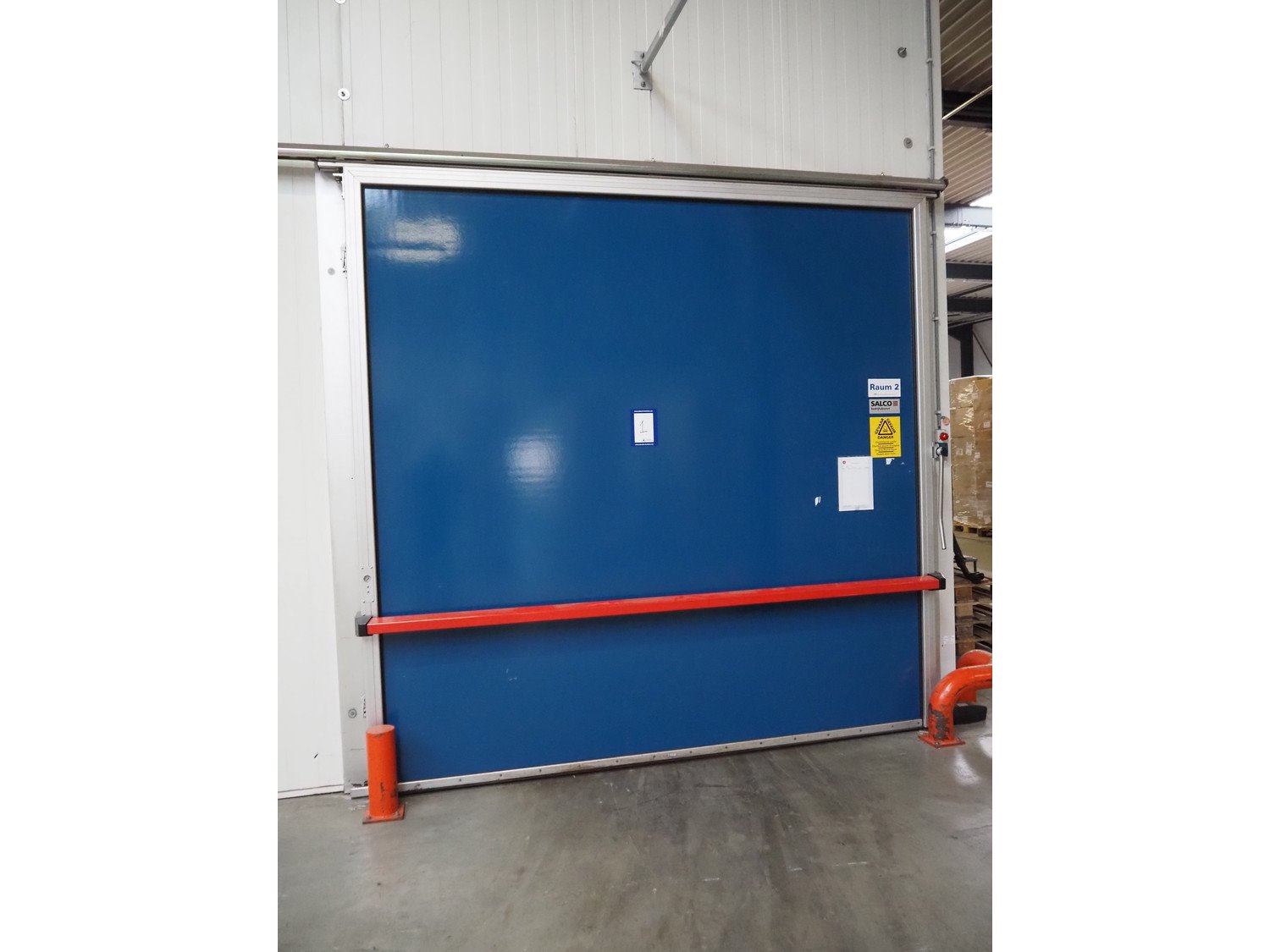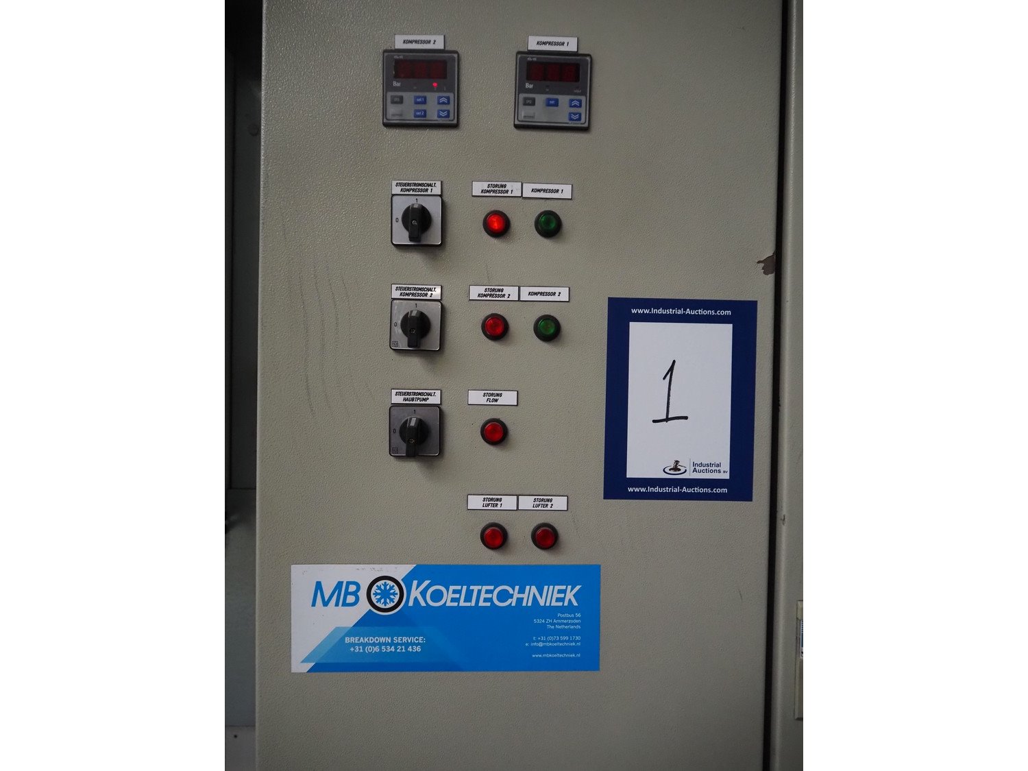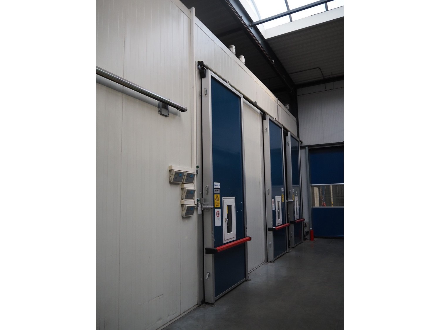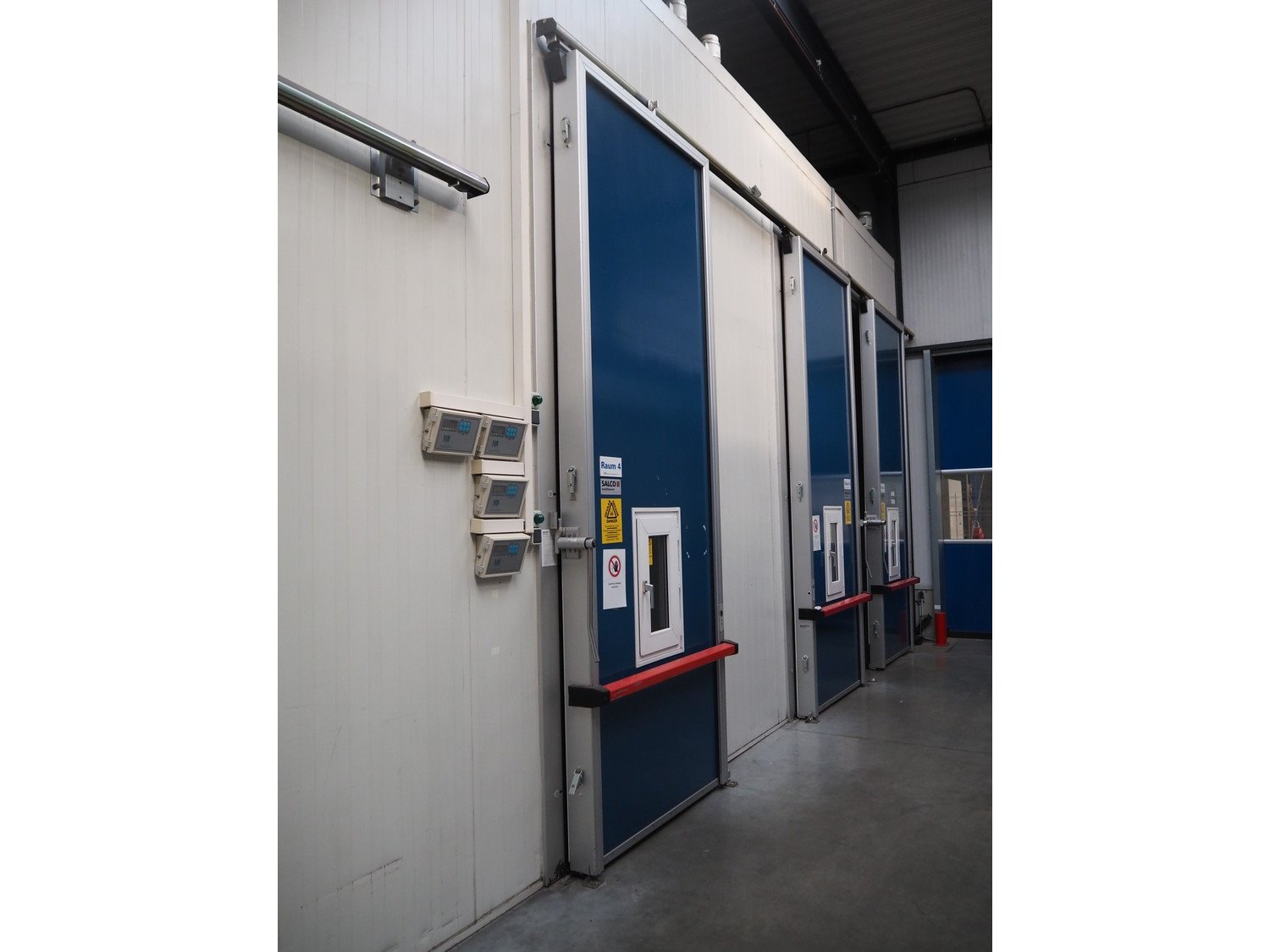 Complete cold store consisting of: 6 compartments, dimensions compartments: (2x) 7000 mm x 12500 mm x 5000 mm, (1x) 4500 mm x 6800 mm x 5000 mm and (3x) 2500 mm x 4500 mm x 5000 mm, total dimensions coldstore: 15000 mm x 17200 mm x 5300 mm, 6 pcs. Salco refrigerated sliding doors, dimensions: (3x) 3100 mm x 3050 mm / thickness: 120 mm and (3x) 1500 mm x 4100 mm / thickness: 120 mm, 2 pcs. Hӧrmann electric shutter doors, type: V5015SE, year of construction: 2005, dimensions: (2x) 3000 mm x 3000 mm, 9 pcs. evaporators, brands: Güntner / Helpman and ECO, Bock compressor rack with 2 cooling compressor, type: (1x) HGX4/650-4 S, number: AG04695-008, year of construction: 2000, capacity: 56.6 m³ per hour and (1x) HGX5/830-4 S, number: AG03608-006, year of construction: 2000, capacity: 72.2 m³ per hour, refrigerant: R404A, total dimensions compressor rack: 2350 mm x 1400 mm x 1500 mm, Helpman roof condenser, 2 fans, dimensions: 4200 mm x 1300 mm x 1300 mm, Switch cabinet for complete cooling installation. Compressor rack / roof condenser need to be removed by crane. Kavel locatie: Ferdinand-Porsche-Straße 7, 52525 Heinsberg, Duitsland