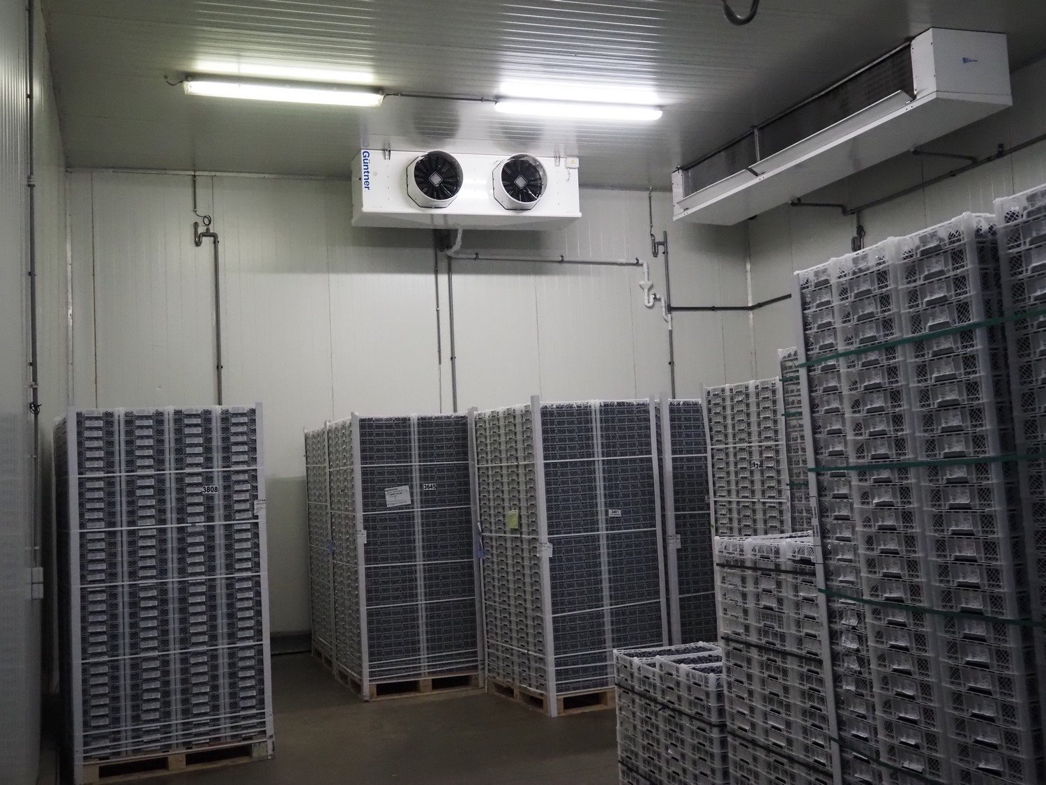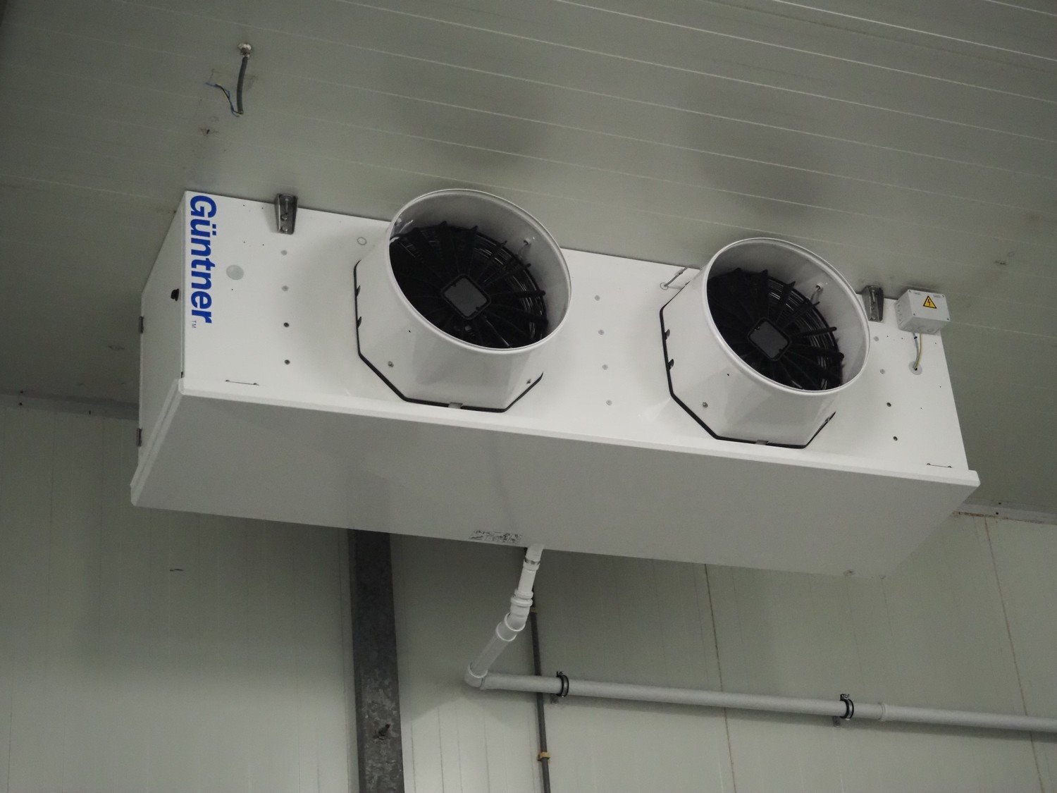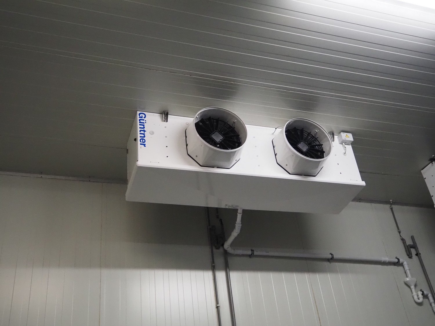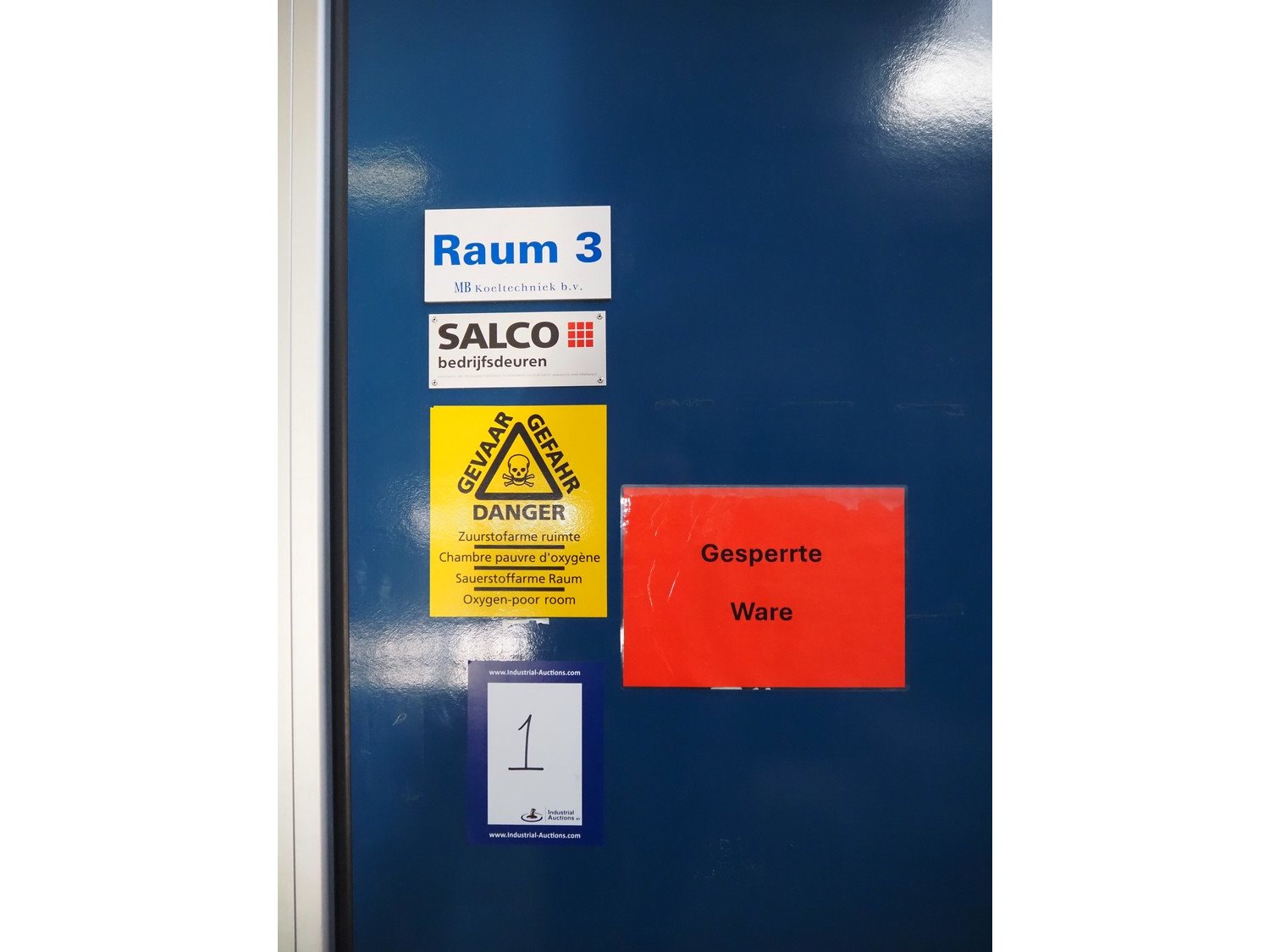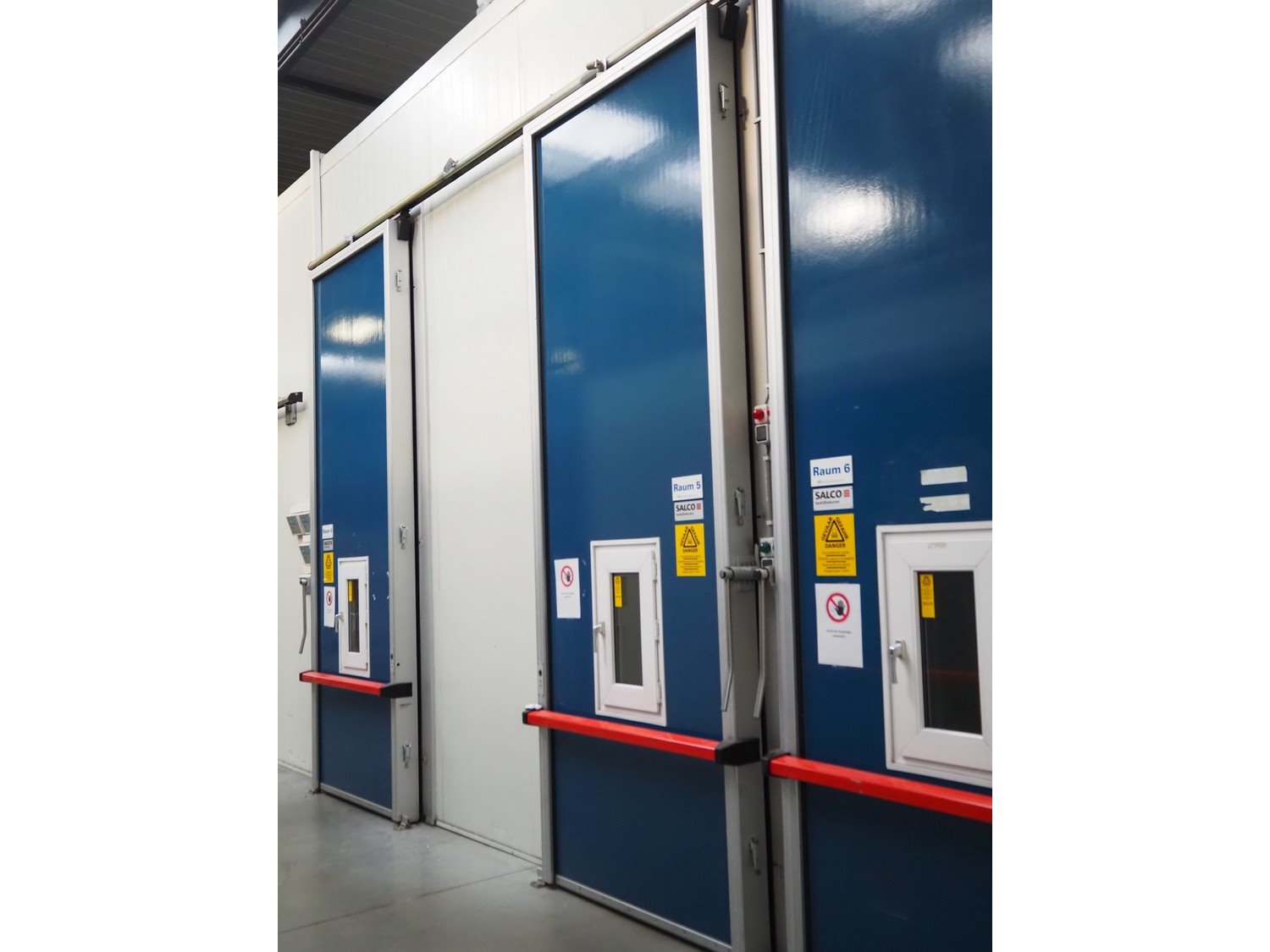 Complete cold store consisting of: 6 compartments, dimensions compartments: (2x) 7000 mm x 12500 mm x 5000 mm, (1x) 4500 mm x 6800 mm x 5000 mm and (3x) 2500 mm x 4500 mm x 5000 mm, total dimensions coldstore: 15000 mm x 17200 mm x 5300 mm, 6 pcs. Salco refrigerated sliding doors, dimensions: (3x) 3100 mm x 3050 mm / thickness: 120 mm and (3x) 1500 mm x 4100 mm / thickness: 120 mm, 2 pcs. Hӧrmann electric shutter doors, type: V5015SE, year of construction: 2005, dimensions: (2x) 3000 mm x 3000 mm, 9 pcs. evaporators, brands: Güntner / Helpman and ECO, Bock compressor rack with 2 cooling compressor, type: (1x) HGX4/650-4 S, number: AG04695-008, year of construction: 2000, capacity: 56.6 m³ per hour and (1x) HGX5/830-4 S, number: AG03608-006, year of construction: 2000, capacity: 72.2 m³ per hour, refrigerant: R404A, total dimensions compressor rack: 2350 mm x 1400 mm x 1500 mm, Helpman roof condenser, 2 fans, dimensions: 4200 mm x 1300 mm x 1300 mm, Switch cabinet for complete cooling installation. Compressor rack / roof condenser need to be removed by crane. Kavel locatie: Ferdinand-Porsche-Straße 7, 52525 Heinsberg, Duitsland