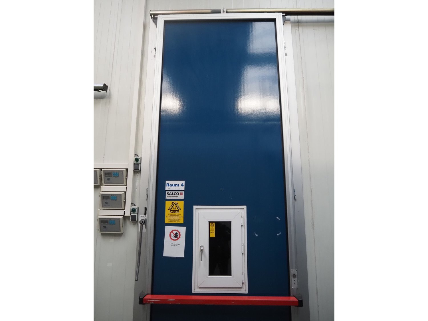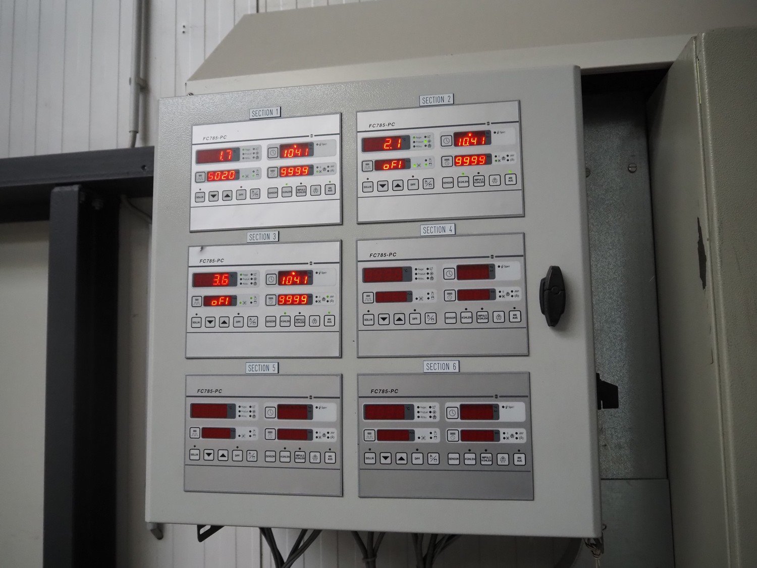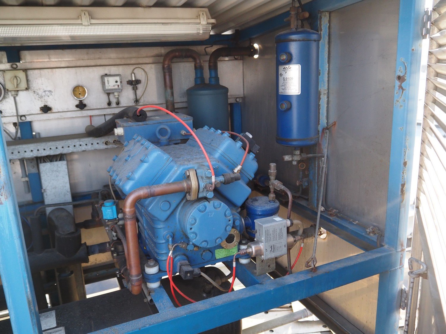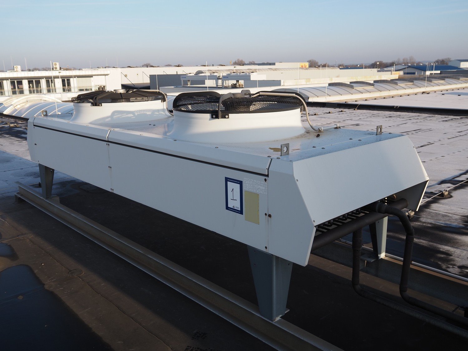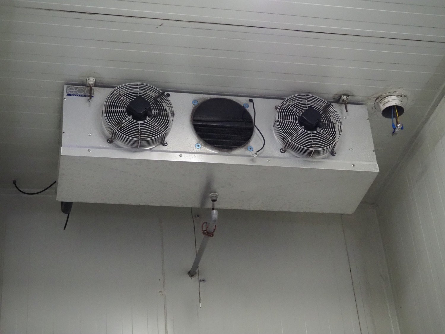 Complete cold store consisting of: 6 compartments, dimensions compartments: (2x) 7000 mm x 12500 mm x 5000 mm, (1x) 4500 mm x 6800 mm x 5000 mm and (3x) 2500 mm x 4500 mm x 5000 mm, total dimensions coldstore: 15000 mm x 17200 mm x 5300 mm, 6 pcs. Salco refrigerated sliding doors, dimensions: (3x) 3100 mm x 3050 mm / thickness: 120 mm and (3x) 1500 mm x 4100 mm / thickness: 120 mm, 2 pcs. Hӧrmann electric shutter doors, type: V5015SE, year of construction: 2005, dimensions: (2x) 3000 mm x 3000 mm, 9 pcs. evaporators, brands: Güntner / Helpman and ECO, Bock compressor rack with 2 cooling compressor, type: (1x) HGX4/650-4 S, number: AG04695-008, year of construction: 2000, capacity: 56.6 m³ per hour and (1x) HGX5/830-4 S, number: AG03608-006, year of construction: 2000, capacity: 72.2 m³ per hour, refrigerant: R404A, total dimensions compressor rack: 2350 mm x 1400 mm x 1500 mm, Helpman roof condenser, 2 fans, dimensions: 4200 mm x 1300 mm x 1300 mm, Switch cabinet for complete cooling installation. Compressor rack / roof condenser need to be removed by crane. Kavel locatie: Ferdinand-Porsche-Straße 7, 52525 Heinsberg, Duitsland