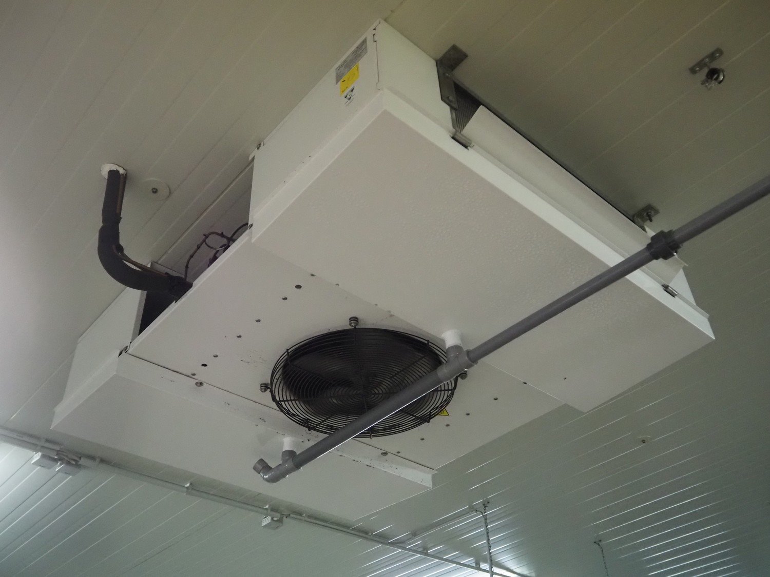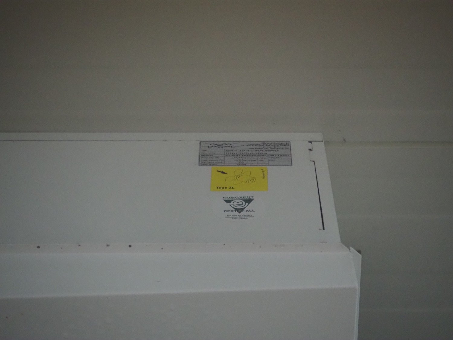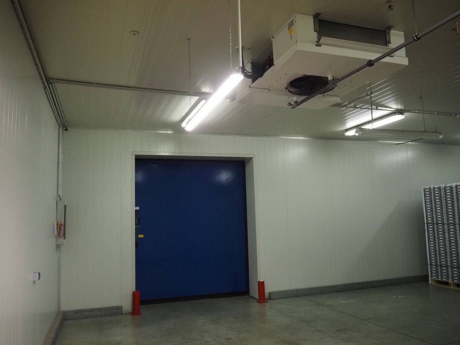 Complete cold store, inside dimensions: 8200 mm x 11500 mm x 3500 mm, total dimensions: 8900 mm x 12000 mm x 3600 mm, consisting of: 2 pcs. Salco refrigerated sliding doors, dimensions: (2x) 2600 mm x 3050 mm / thickness door: 100 mm, 2 pcs. Helpman / Alfa Laval evaporator, year of construction: 2010, 1 fan, dimensions: (2x) 1200 mm x 1500 mm x 500 mm, Frascold compressor / condensing unit, type: Q 5 19.1 Y 1000, number: 0D000099, 3 Ph, 50/60 Hz, 19.12 / 22.95 m³ per hour, dimensions compressor / condensing unit: 1200 mm x 1000 mm x 800 mm. Including steel construction and wooden floor. Compressor / condensing unit need to removed by crane. Kavel locatie: Ferdinand-Porsche-Straße 7, 52525 Heinsberg, Duitsland