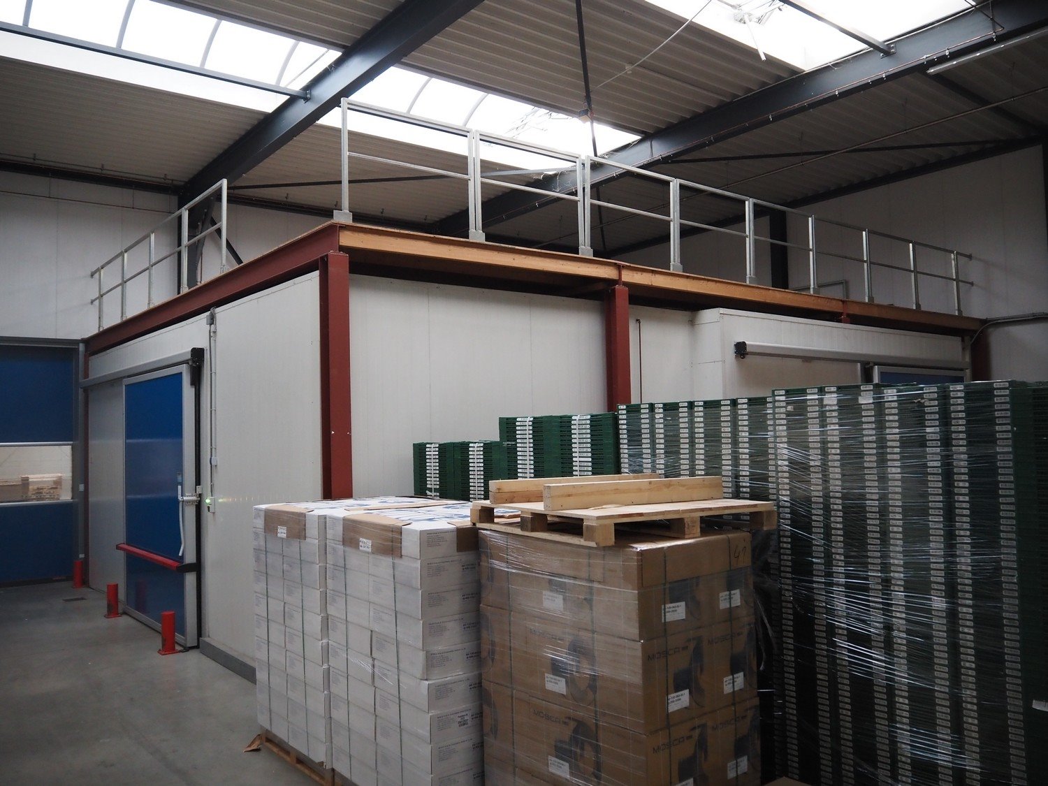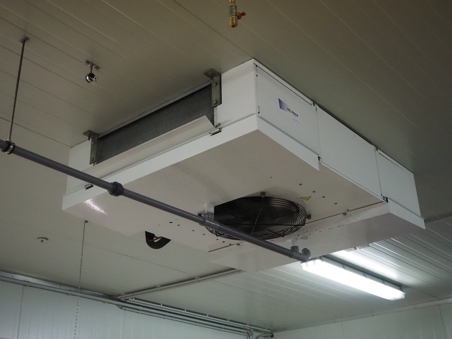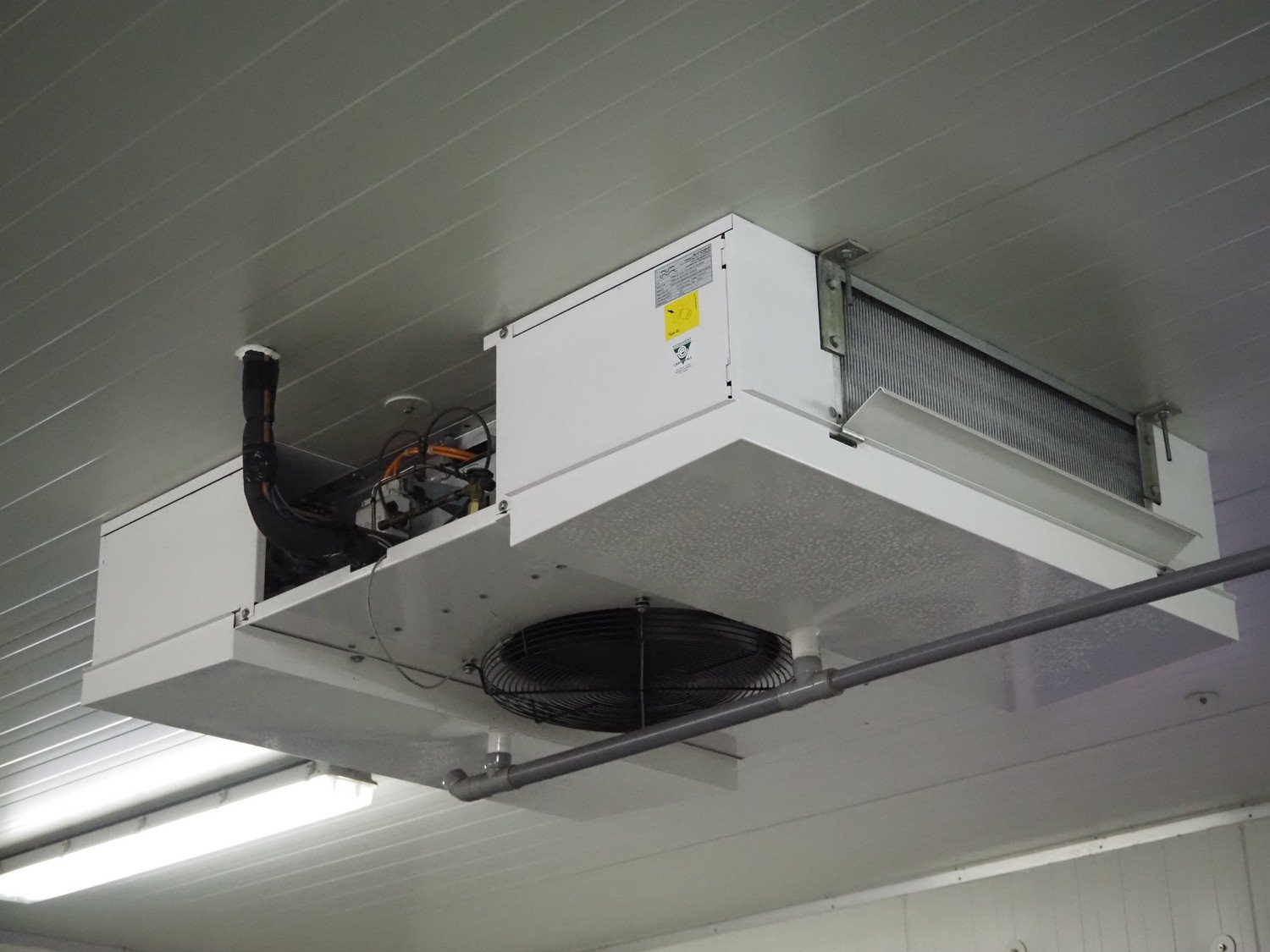 Complete cold store, inside dimensions: 8200 mm x 11500 mm x 3500 mm, total dimensions: 8900 mm x 12000 mm x 3600 mm, consisting of: 2 pcs. Salco refrigerated sliding doors, dimensions: (2x) 2600 mm x 3050 mm / thickness door: 100 mm, 2 pcs. Helpman / Alfa Laval evaporator, year of construction: 2010, 1 fan, dimensions: (2x) 1200 mm x 1500 mm x 500 mm, Frascold compressor / condensing unit, type: Q 5 19.1 Y 1000, number: 0D000099, 3 Ph, 50/60 Hz, 19.12 / 22.95 m³ per hour, dimensions compressor / condensing unit: 1200 mm x 1000 mm x 800 mm. Including steel construction and wooden floor. Compressor / condensing unit need to removed by crane. Kavel locatie: Ferdinand-Porsche-Straße 7, 52525 Heinsberg, Duitsland