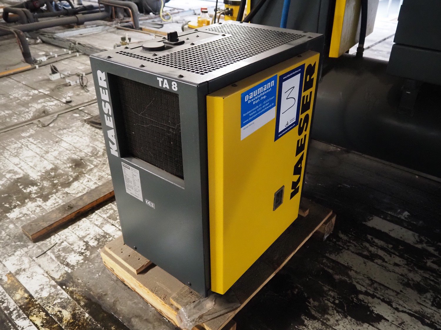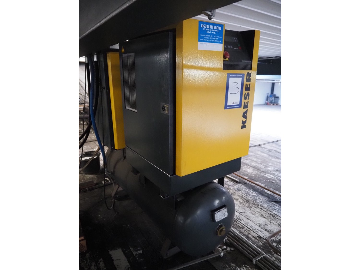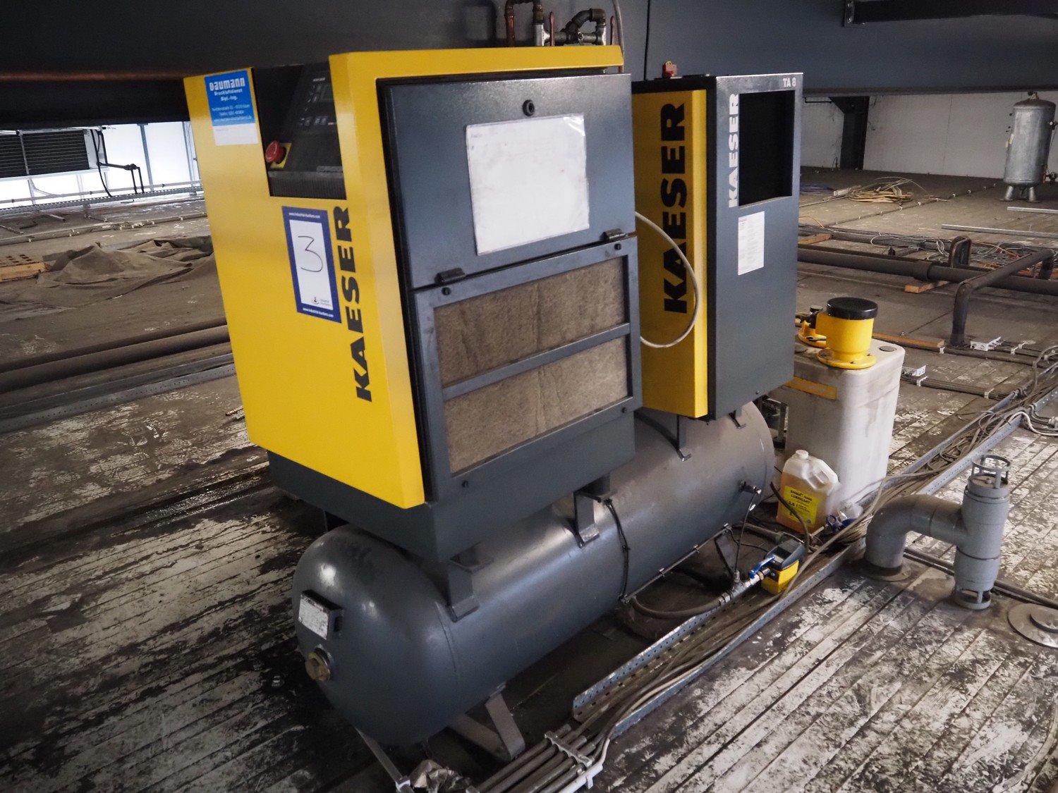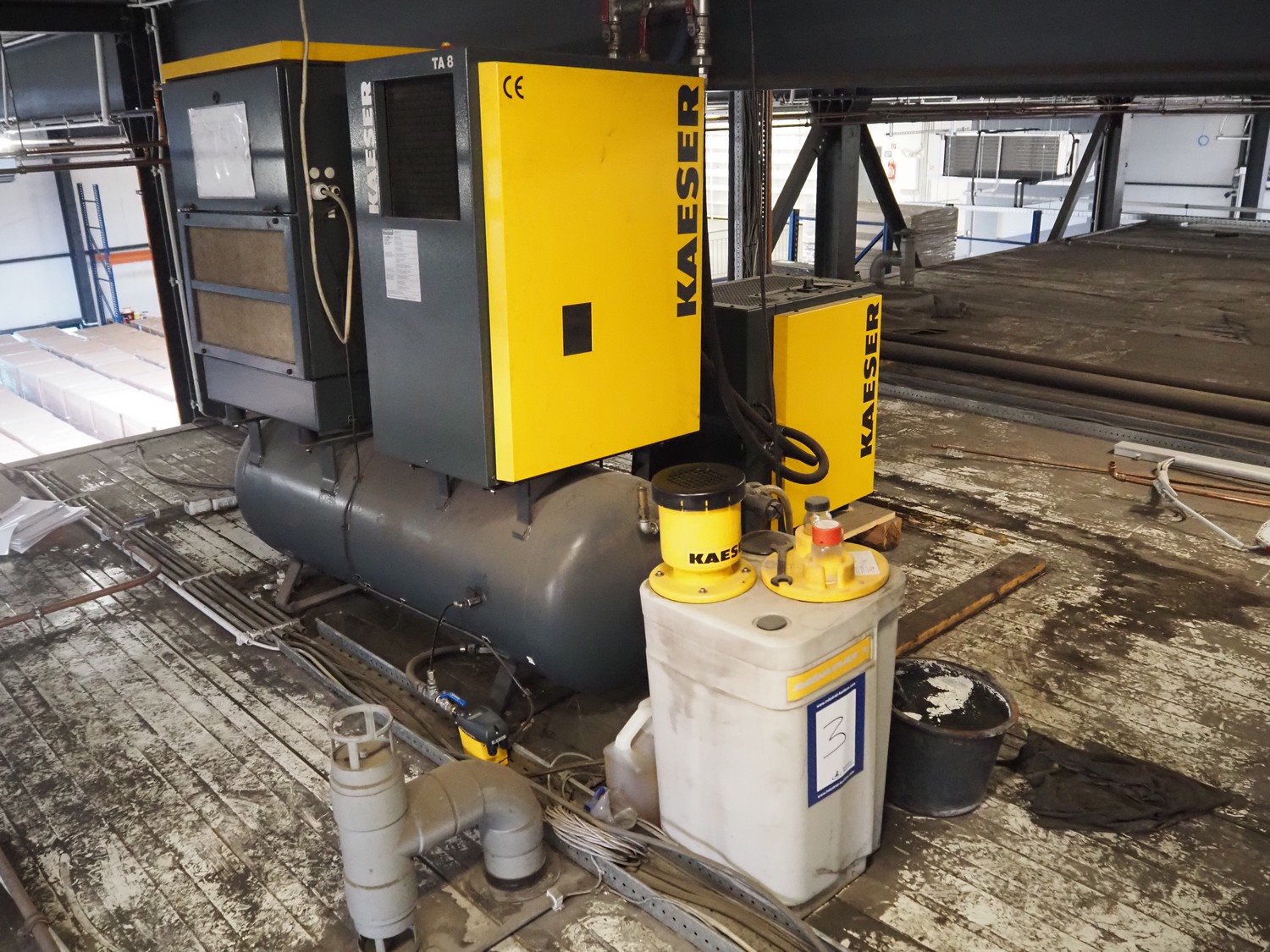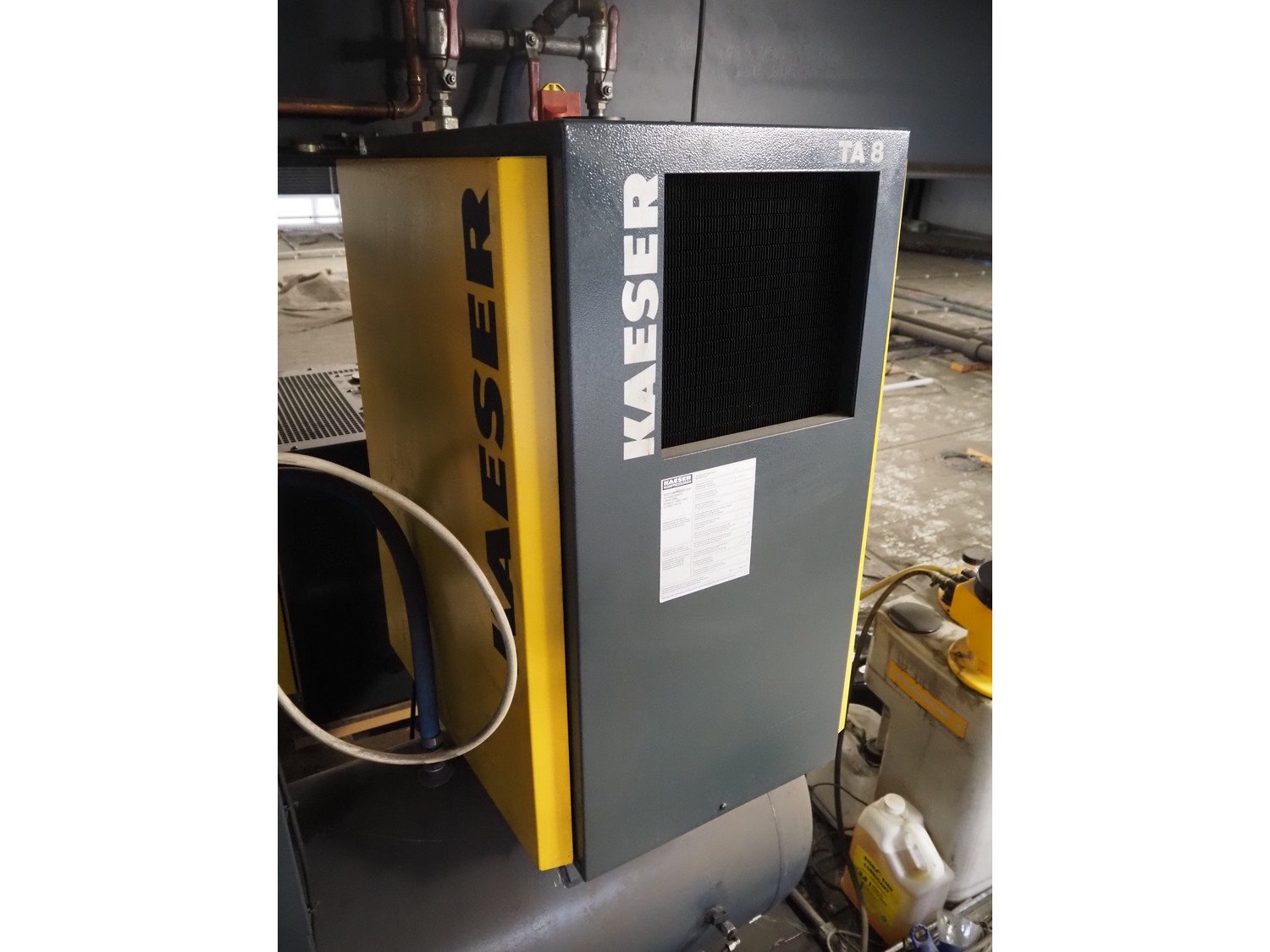 Kaeser Kompressoren air compressor installation consisting of: Kaeser Kompressoren air compressor, Kaeser Kompressoren air dryer, type: TA 8, serial number: 1.7902.30010, year of construction: 2000, refrigerant: R 134 A, quantity of refrigerant: 0.260 kg, 230 V, 1 Ph, 50 Hz, Sicc pressure vessel, volume: 280 liter, dimensions: 1200 mm x 500 mm x 1800 mm, Kaeser Kompressoren air dryer, type: TA 8, serial number: 1640, year of construction: 2014, 230 V, 1 Ph, 50 Hz, refrigerant: R134a / 0.22 kg, dimensions: 600 mm x 600 mm x 800 mm, Kaeser Kompressoren oil-water-separator, model: AQUAMAT 2, dimensions: 500 mm x 500 mm x 1200 mm. Kavel locatie: Ferdinand-Porsche-Straße 7, 52525 Heinsberg, Duitsland