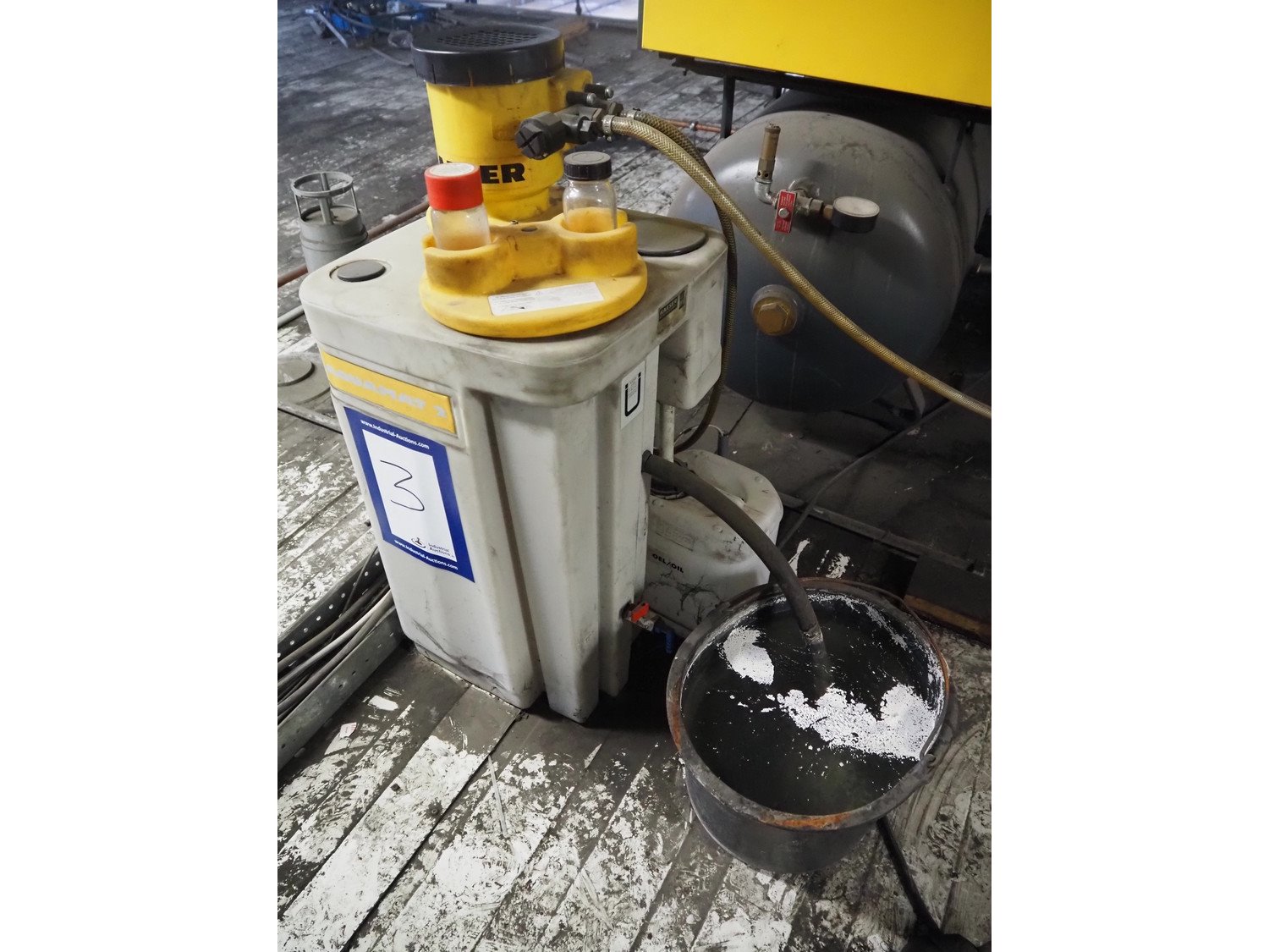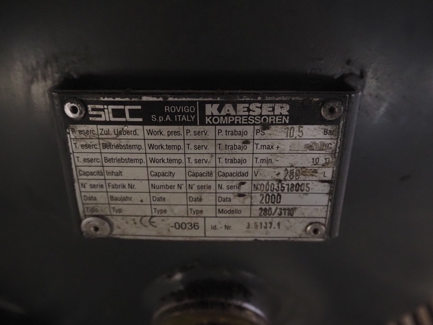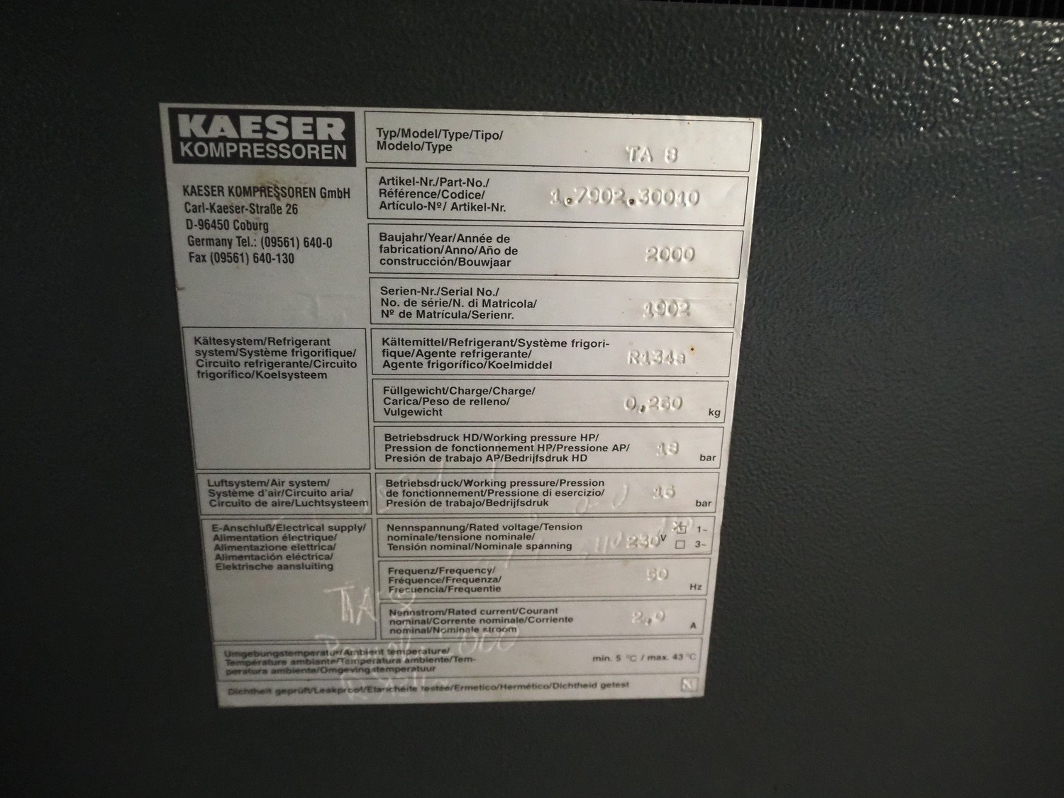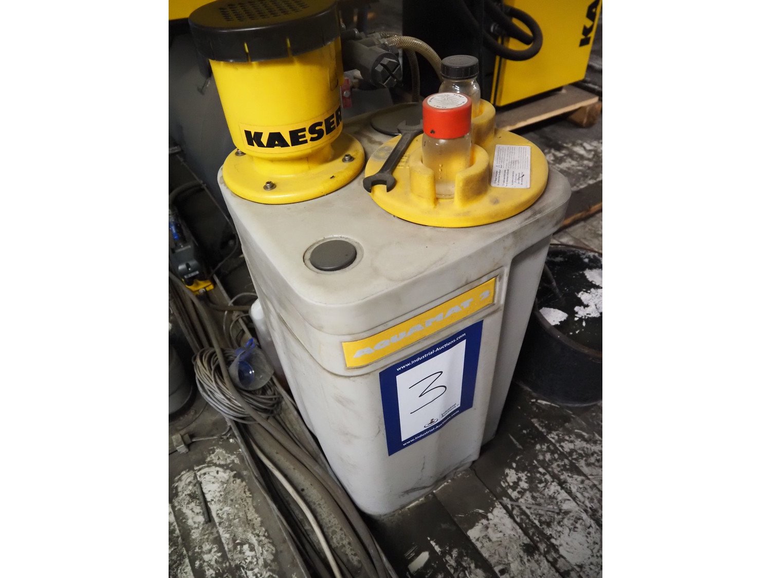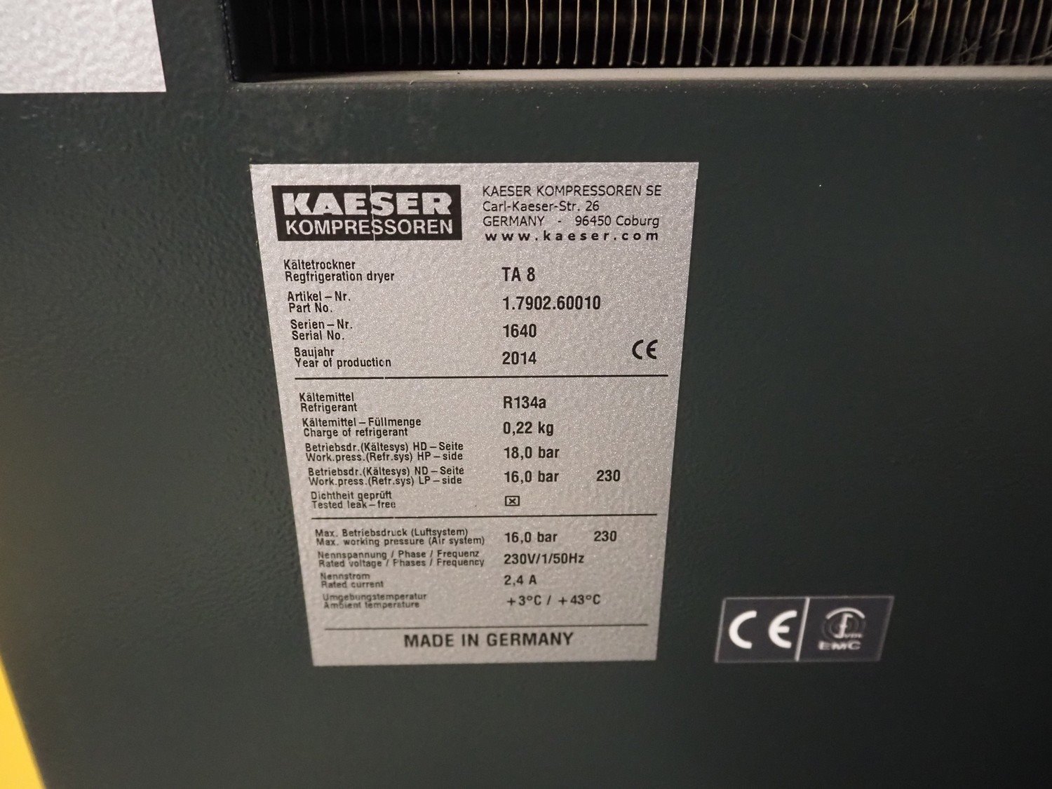 Kaeser Kompressoren air compressor installation consisting of: Kaeser Kompressoren air compressor, Kaeser Kompressoren air dryer, type: TA 8, serial number: 1.7902.30010, year of construction: 2000, refrigerant: R 134 A, quantity of refrigerant: 0.260 kg, 230 V, 1 Ph, 50 Hz, Sicc pressure vessel, volume: 280 liter, dimensions: 1200 mm x 500 mm x 1800 mm, Kaeser Kompressoren air dryer, type: TA 8, serial number: 1640, year of construction: 2014, 230 V, 1 Ph, 50 Hz, refrigerant: R134a / 0.22 kg, dimensions: 600 mm x 600 mm x 800 mm, Kaeser Kompressoren oil-water-separator, model: AQUAMAT 2, dimensions: 500 mm x 500 mm x 1200 mm. Kavel locatie: Ferdinand-Porsche-Straße 7, 52525 Heinsberg, Duitsland