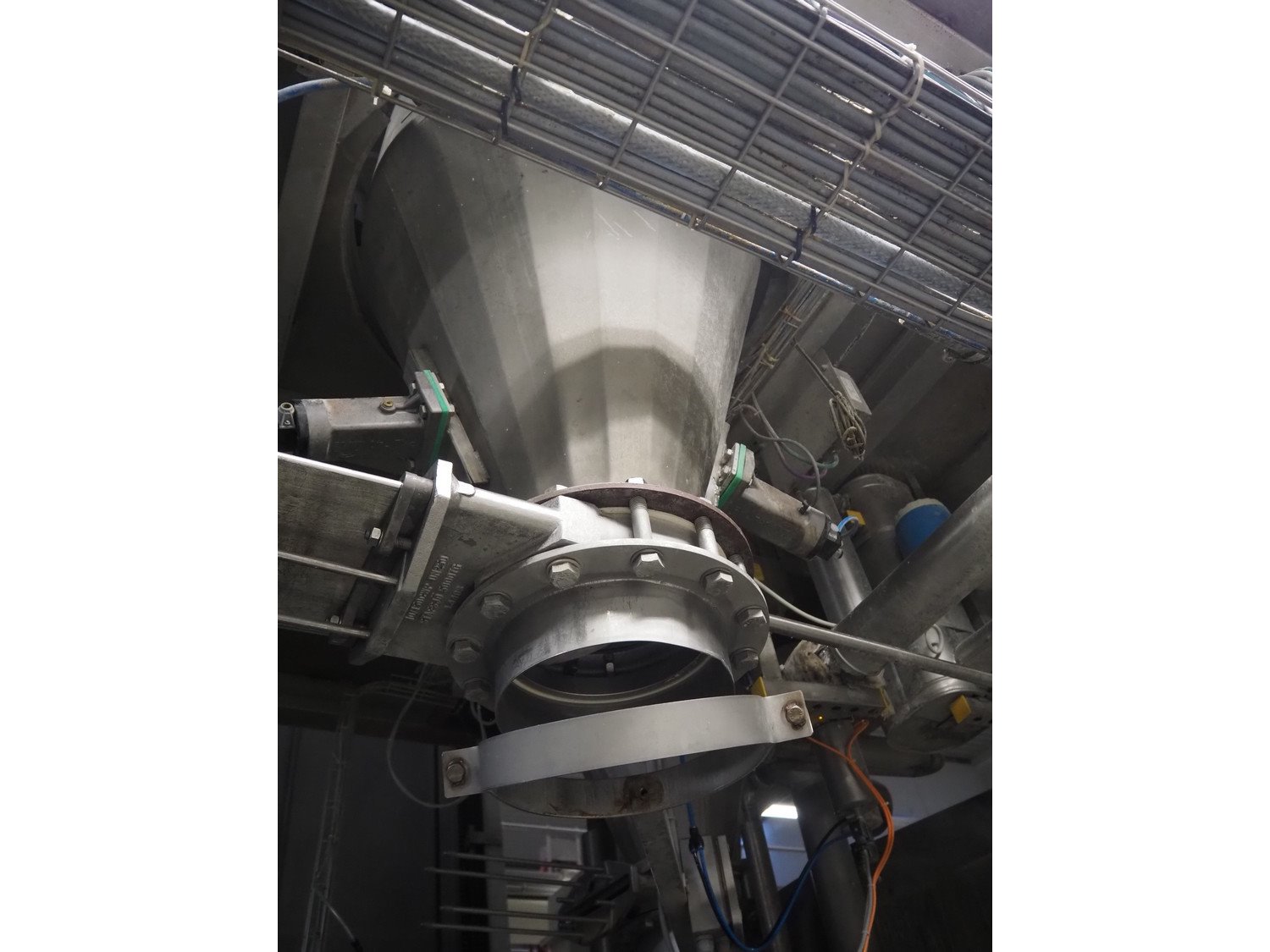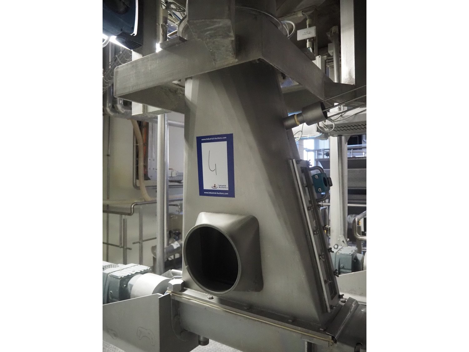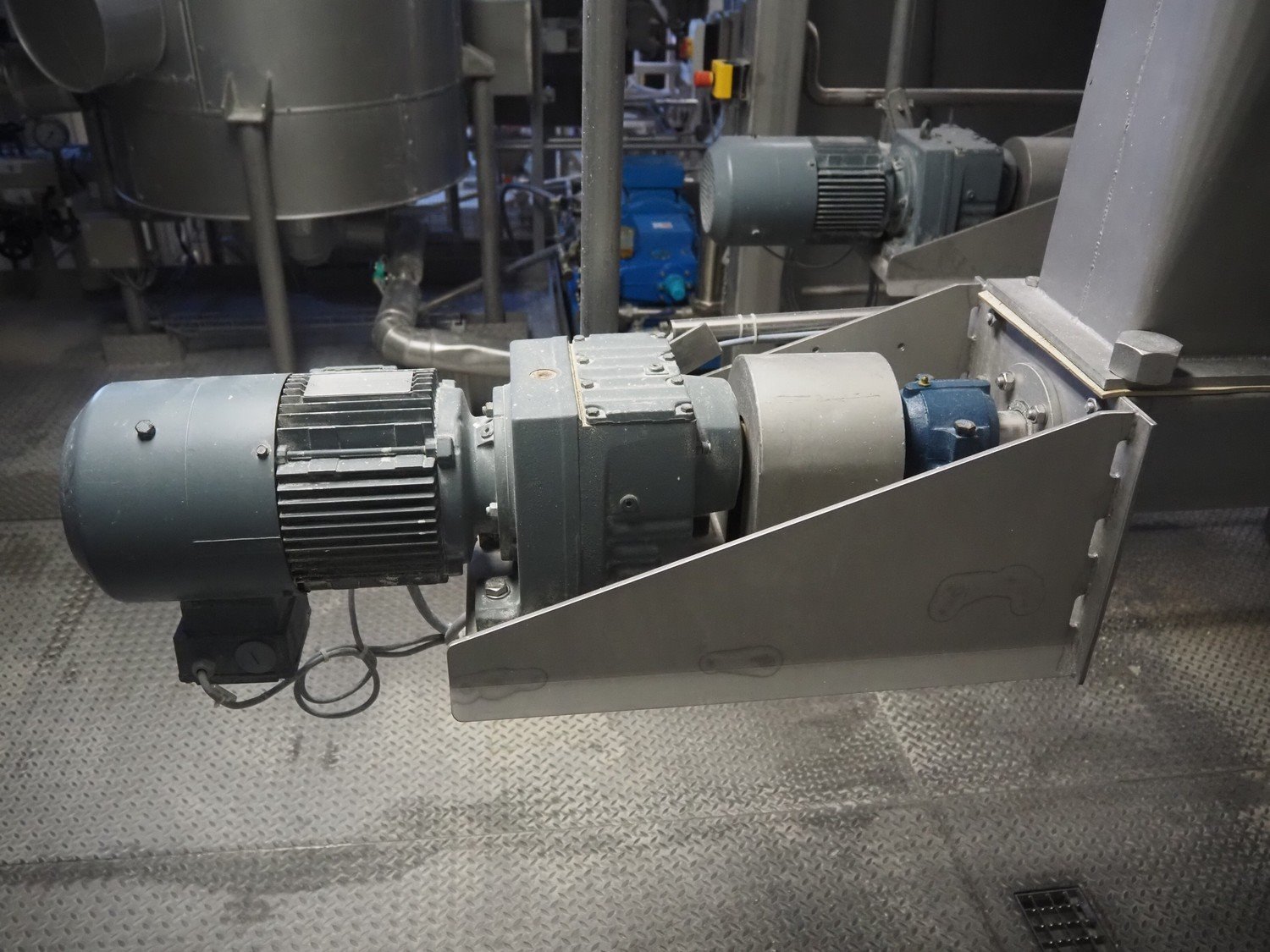 Eima GmbH infeed hopper with transport screw and outfeed hopper on weighing cells with valve, s/s screw, diameter: 180 mm, tier: 120 mm, dimensions infeed hopper with transport screw: 2500 mm x 800 mm x 2500 mm, dimensions outfeed hopper: 1300 mm x 1300 mm x 2000 mm. Kavel locatie: Schultetusstraße 37, 17153 Stavenhagen, Duitsland