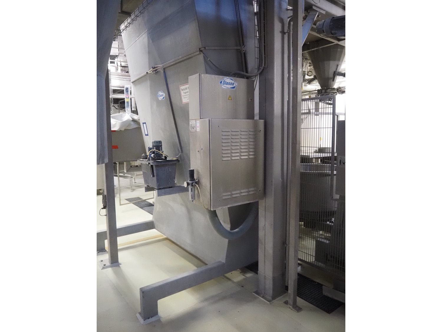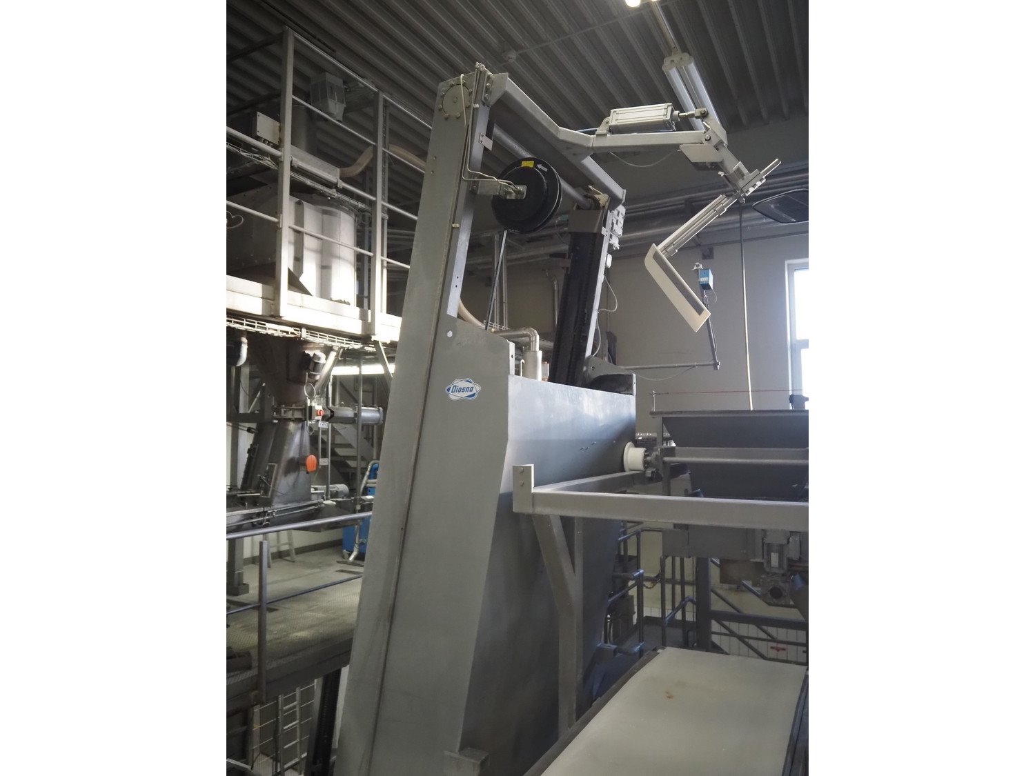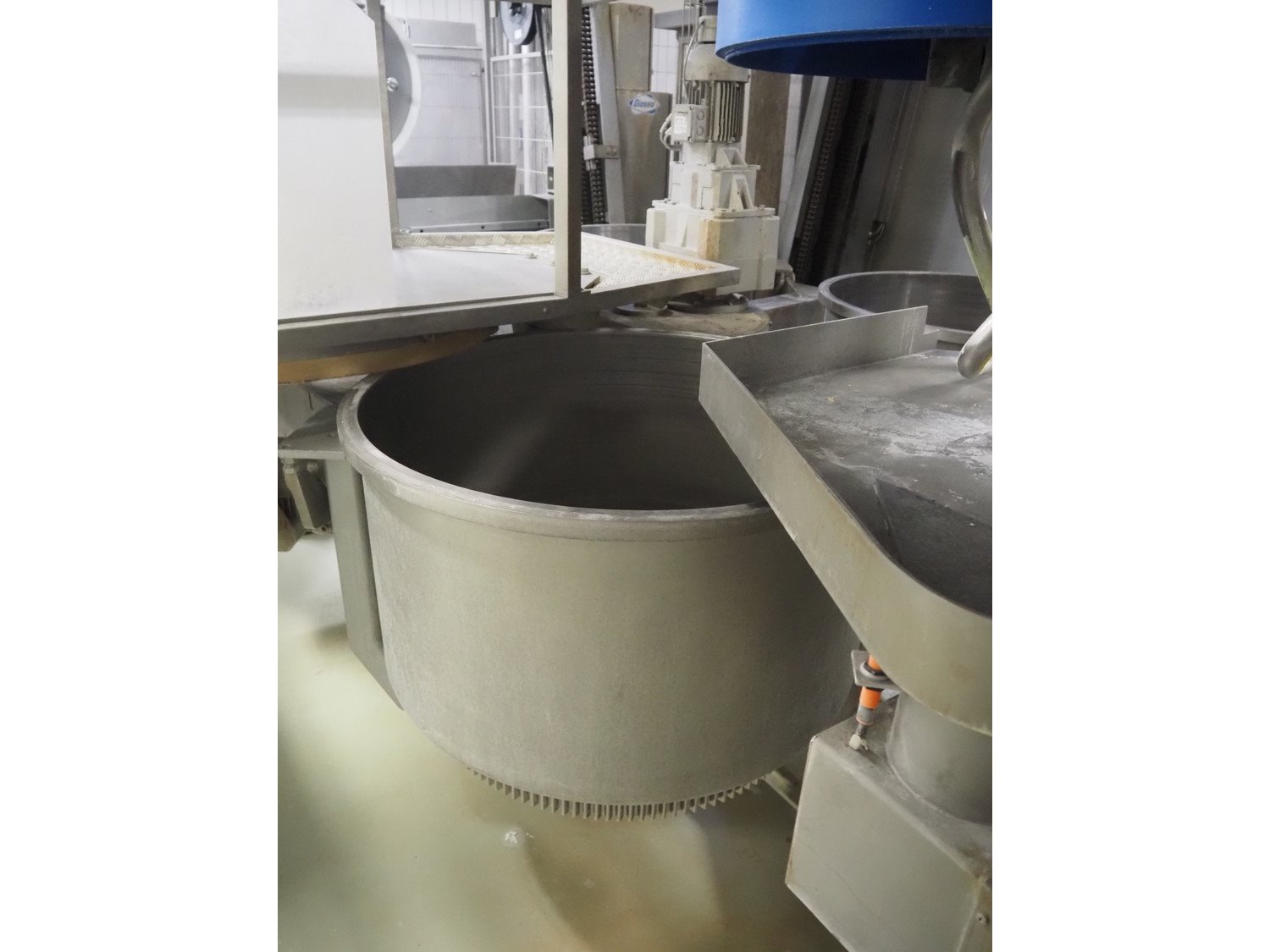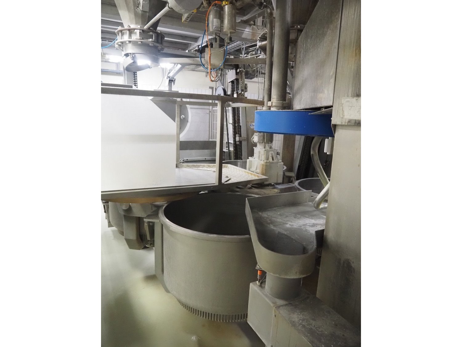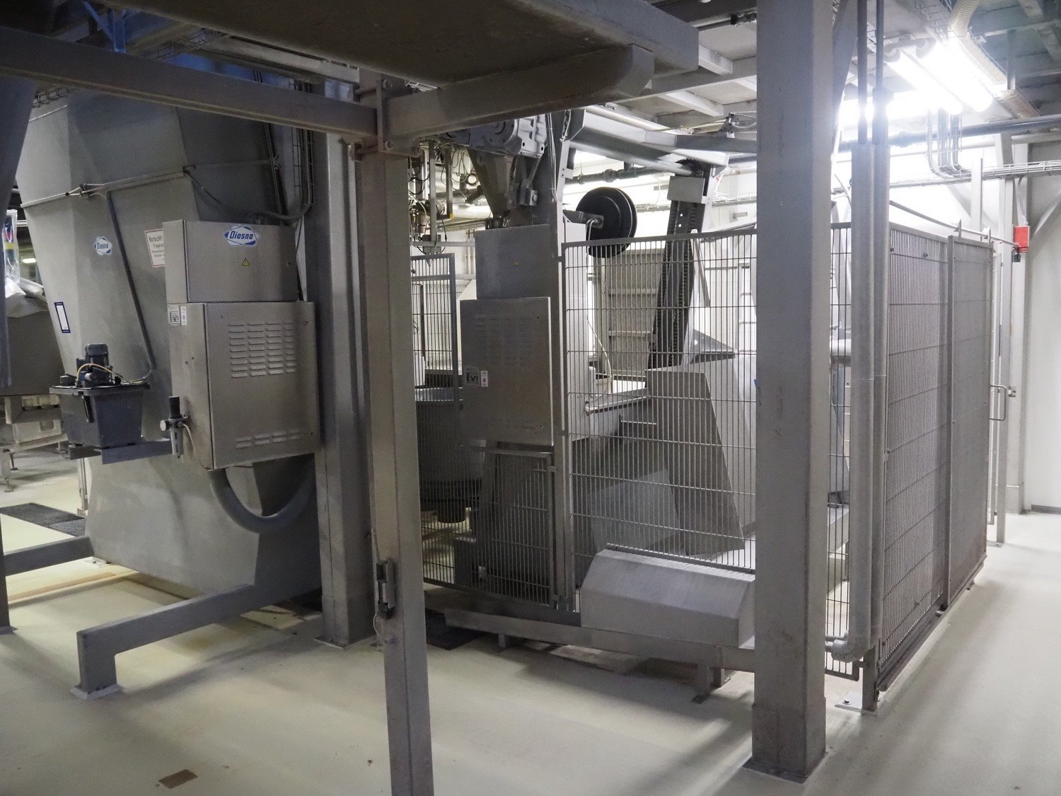 Diosna Dierks & Söhne GmbH carousel dough kneading installation consisting of: Diosna Dierks & Söhne GmbH wendel mixer with rotating carousel, type: WV 240 A, number: 974-056, 400 V, 3 Ph, 50 Hz, 34 kW, 63 A, 4 s/s tubs, inside dimensions: (4x) Ø 1000 mm x 500 mm, volume each tub: 370 liter / 240 kg, total dimensions: 3900 mm x 3100 mm x 2550 mm, Diosna Dierks & Söhne GmbH lifter with mobile outfeed hopper, type: HK 300, number: 3400-286, year of construction: 2006, 400 V, 3 Ph, 50 Hz, 7.9 A, 3.15 kW, dimensions: 2100 mm x 2300 mm x 7000 mm, Diosna Dierks & Söhne GmbH washing station, type: HK-300, number: 3400-291, year of construction: 2006, 400 V, 3 Ph, 50 Hz, 4.4 A, 2.8 kW, dimensions: 2700 mm x 2400 mm x 2900 mm, Rosoma water preparation unit for washing station, Diosna Dierks & Söhne GmbH outfeed belt, plastic belt, belt width: 850 mm, total dimensions: 6500 mm x 900 mm x 400 mm, Diosna Dierks & Söhne GmbH mobile outfeed dividing belt, plastic belt, belt width: 850 mm, total dimensions: 3500 mm x 1350 mm x 900 mm, S/s platform, dimensions: 11000 mm x 11000 mm x 7150 mm, S/s switch cabinet, dimensions: 3650 mm x 550 mm x 2300 mm. Kavel locatie: Schultetusstraße 37, 17153 Stavenhagen, Duitsland