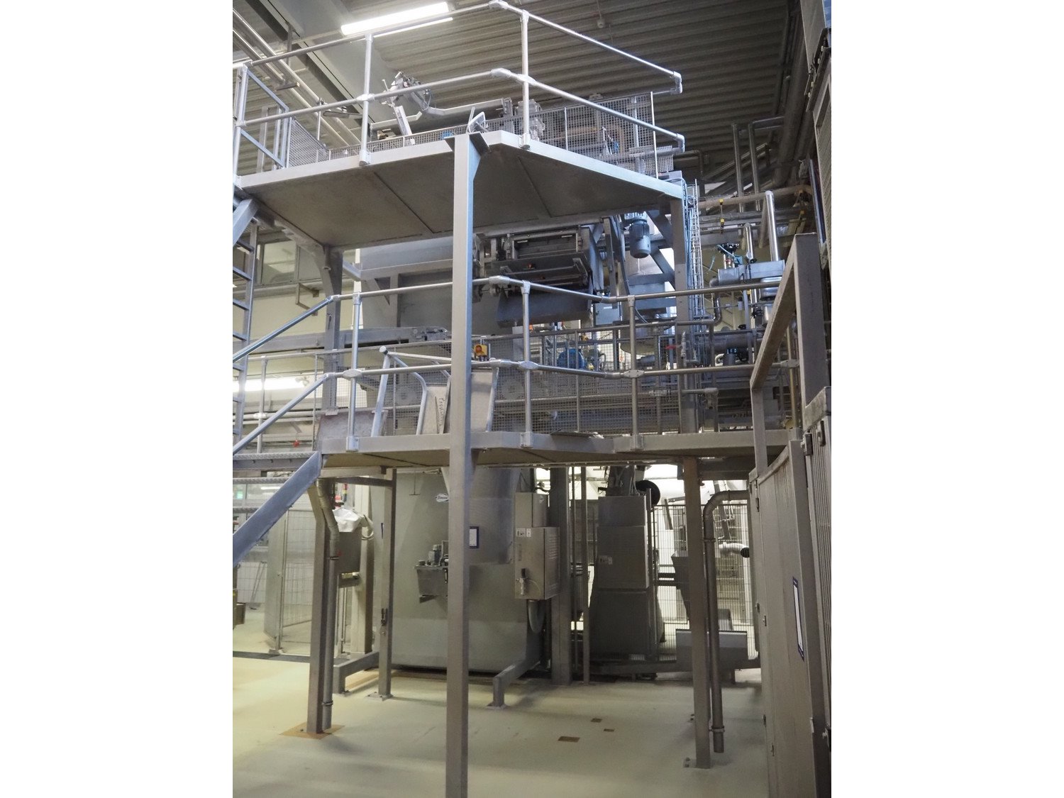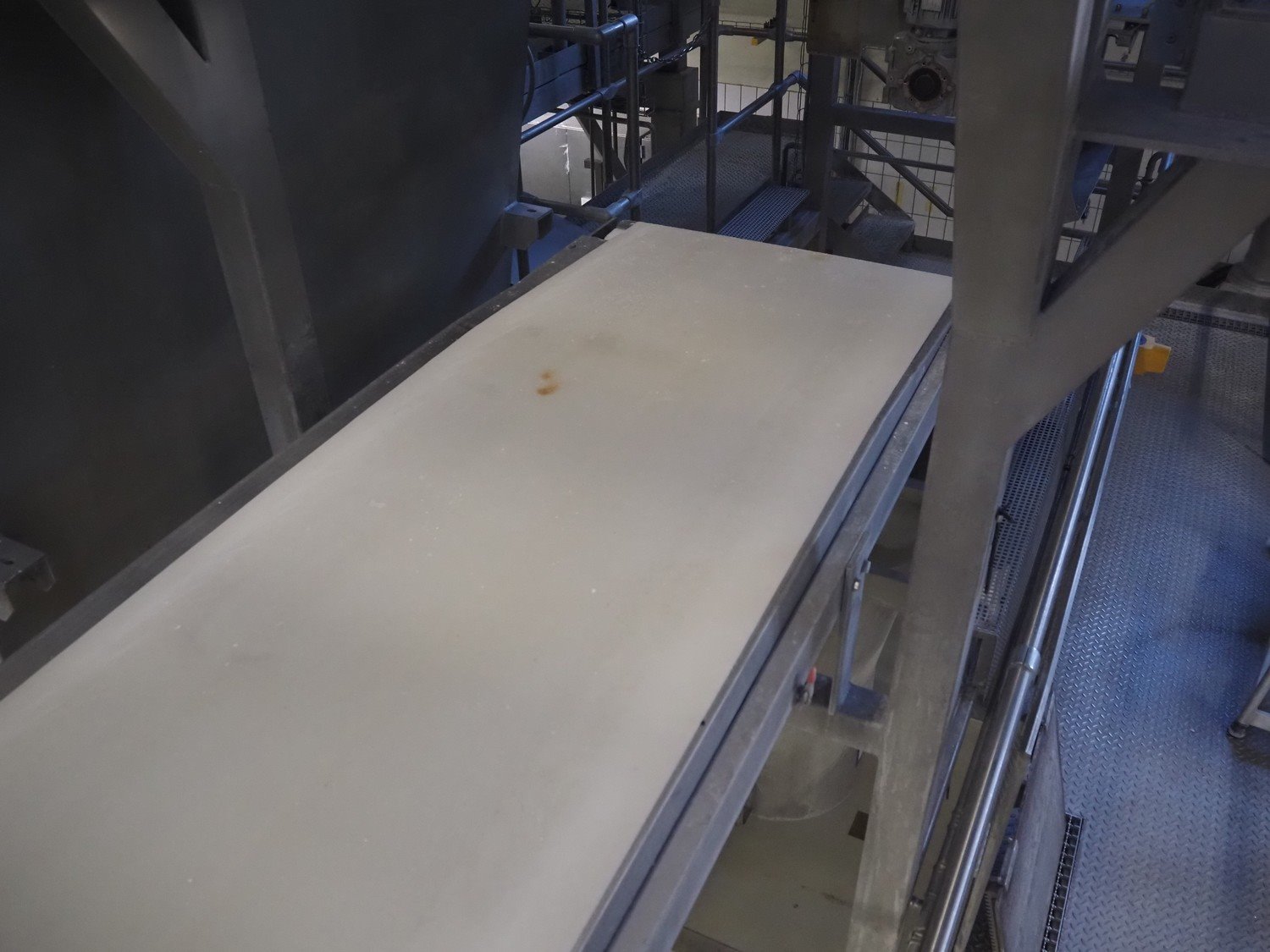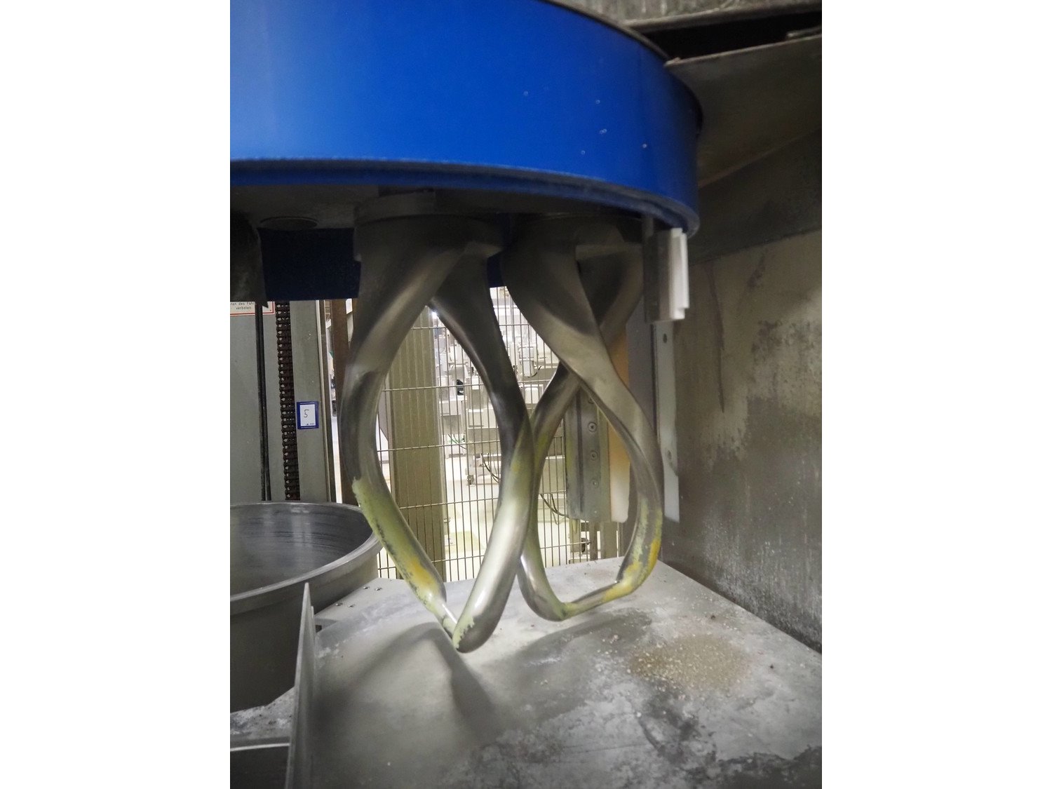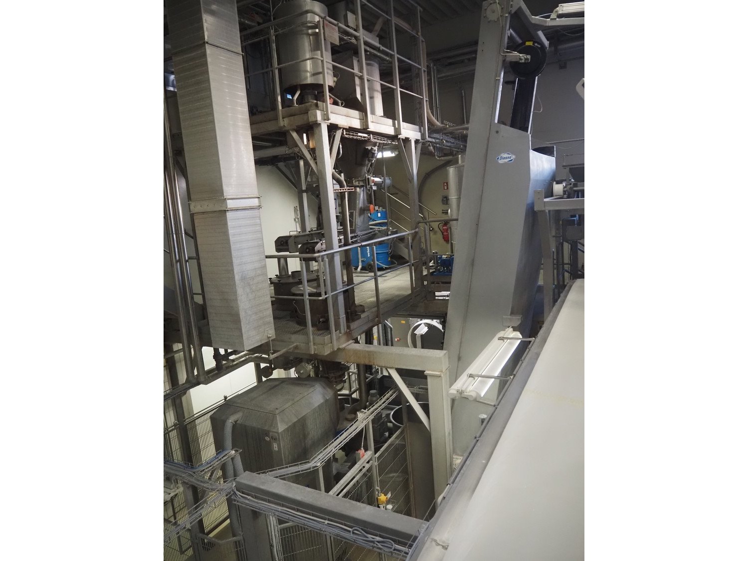 Diosna Dierks & Söhne GmbH carousel dough kneading installation consisting of: Diosna Dierks & Söhne GmbH wendel mixer with rotating carousel, type: WV 240 A, number: 974-056, 400 V, 3 Ph, 50 Hz, 34 kW, 63 A, 4 s/s tubs, inside dimensions: (4x) Ø 1000 mm x 500 mm, volume each tub: 370 liter / 240 kg, total dimensions: 3900 mm x 3100 mm x 2550 mm, Diosna Dierks & Söhne GmbH lifter with mobile outfeed hopper, type: HK 300, number: 3400-286, year of construction: 2006, 400 V, 3 Ph, 50 Hz, 7.9 A, 3.15 kW, dimensions: 2100 mm x 2300 mm x 7000 mm, Diosna Dierks & Söhne GmbH washing station, type: HK-300, number: 3400-291, year of construction: 2006, 400 V, 3 Ph, 50 Hz, 4.4 A, 2.8 kW, dimensions: 2700 mm x 2400 mm x 2900 mm, Rosoma water preparation unit for washing station, Diosna Dierks & Söhne GmbH outfeed belt, plastic belt, belt width: 850 mm, total dimensions: 6500 mm x 900 mm x 400 mm, Diosna Dierks & Söhne GmbH mobile outfeed dividing belt, plastic belt, belt width: 850 mm, total dimensions: 3500 mm x 1350 mm x 900 mm, S/s platform, dimensions: 11000 mm x 11000 mm x 7150 mm, S/s switch cabinet, dimensions: 3650 mm x 550 mm x 2300 mm. Kavel locatie: Schultetusstraße 37, 17153 Stavenhagen, Duitsland