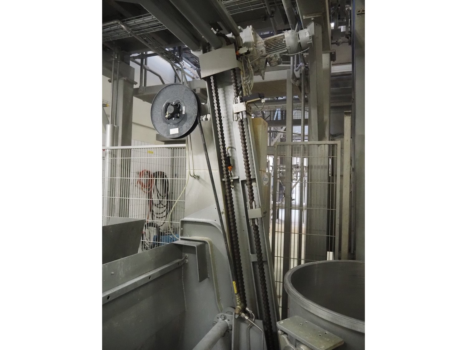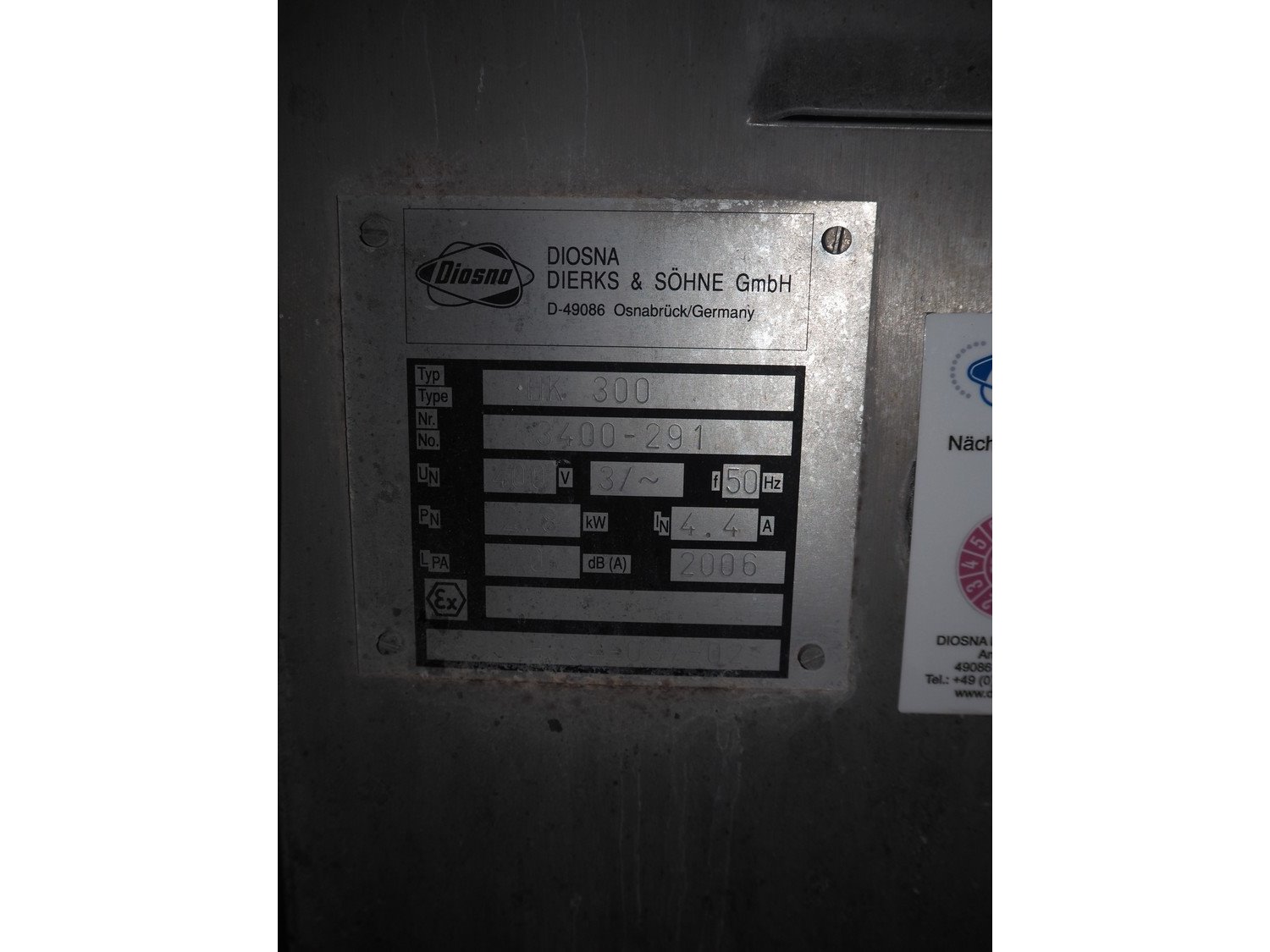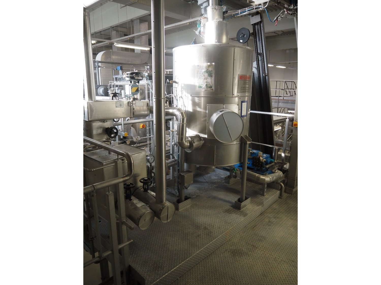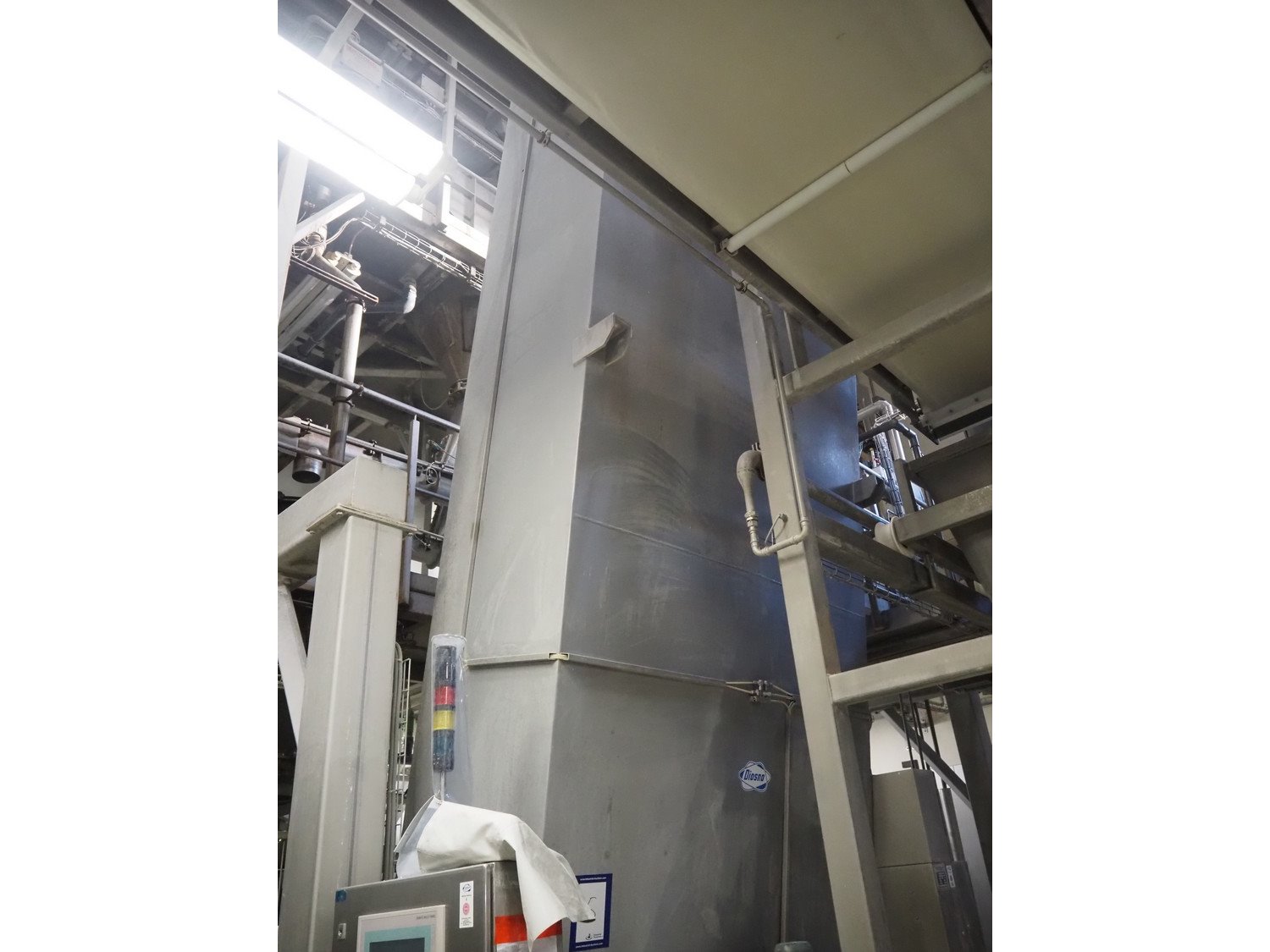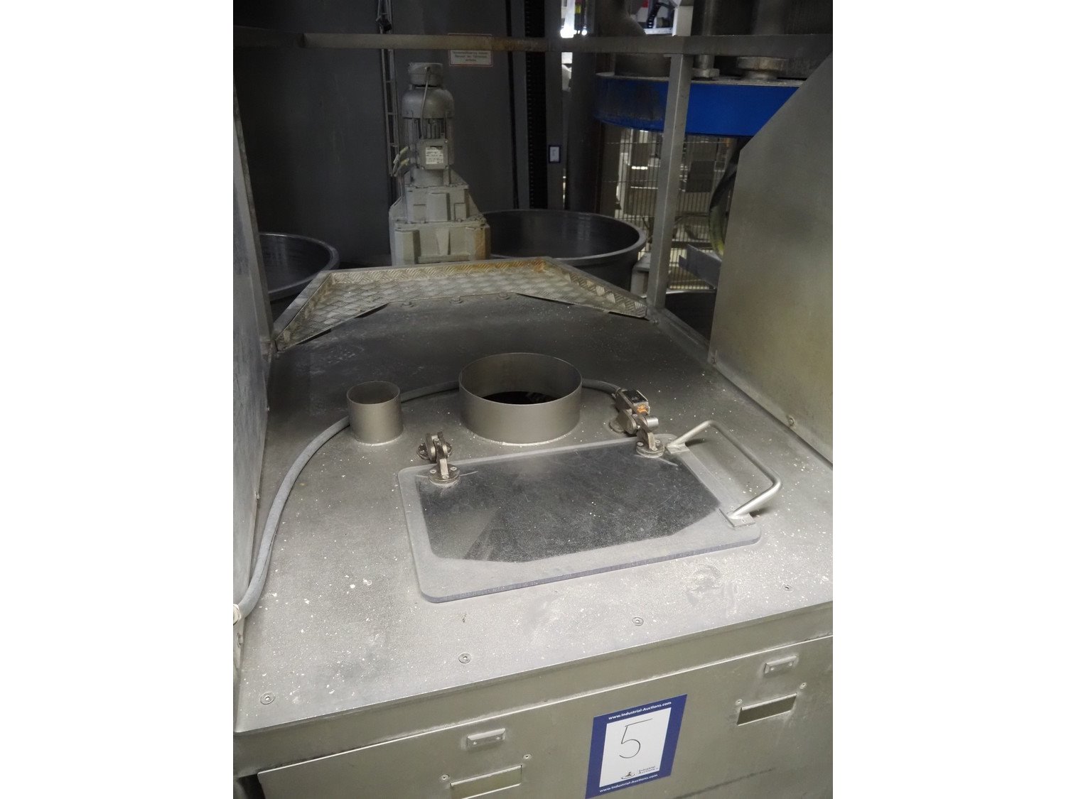 Diosna Dierks & Söhne GmbH carousel dough kneading installation consisting of: Diosna Dierks & Söhne GmbH wendel mixer with rotating carousel, type: WV 240 A, number: 974-056, 400 V, 3 Ph, 50 Hz, 34 kW, 63 A, 4 s/s tubs, inside dimensions: (4x) Ø 1000 mm x 500 mm, volume each tub: 370 liter / 240 kg, total dimensions: 3900 mm x 3100 mm x 2550 mm, Diosna Dierks & Söhne GmbH lifter with mobile outfeed hopper, type: HK 300, number: 3400-286, year of construction: 2006, 400 V, 3 Ph, 50 Hz, 7.9 A, 3.15 kW, dimensions: 2100 mm x 2300 mm x 7000 mm, Diosna Dierks & Söhne GmbH washing station, type: HK-300, number: 3400-291, year of construction: 2006, 400 V, 3 Ph, 50 Hz, 4.4 A, 2.8 kW, dimensions: 2700 mm x 2400 mm x 2900 mm, Rosoma water preparation unit for washing station, Diosna Dierks & Söhne GmbH outfeed belt, plastic belt, belt width: 850 mm, total dimensions: 6500 mm x 900 mm x 400 mm, Diosna Dierks & Söhne GmbH mobile outfeed dividing belt, plastic belt, belt width: 850 mm, total dimensions: 3500 mm x 1350 mm x 900 mm, S/s platform, dimensions: 11000 mm x 11000 mm x 7150 mm, S/s switch cabinet, dimensions: 3650 mm x 550 mm x 2300 mm. Kavel locatie: Schultetusstraße 37, 17153 Stavenhagen, Duitsland