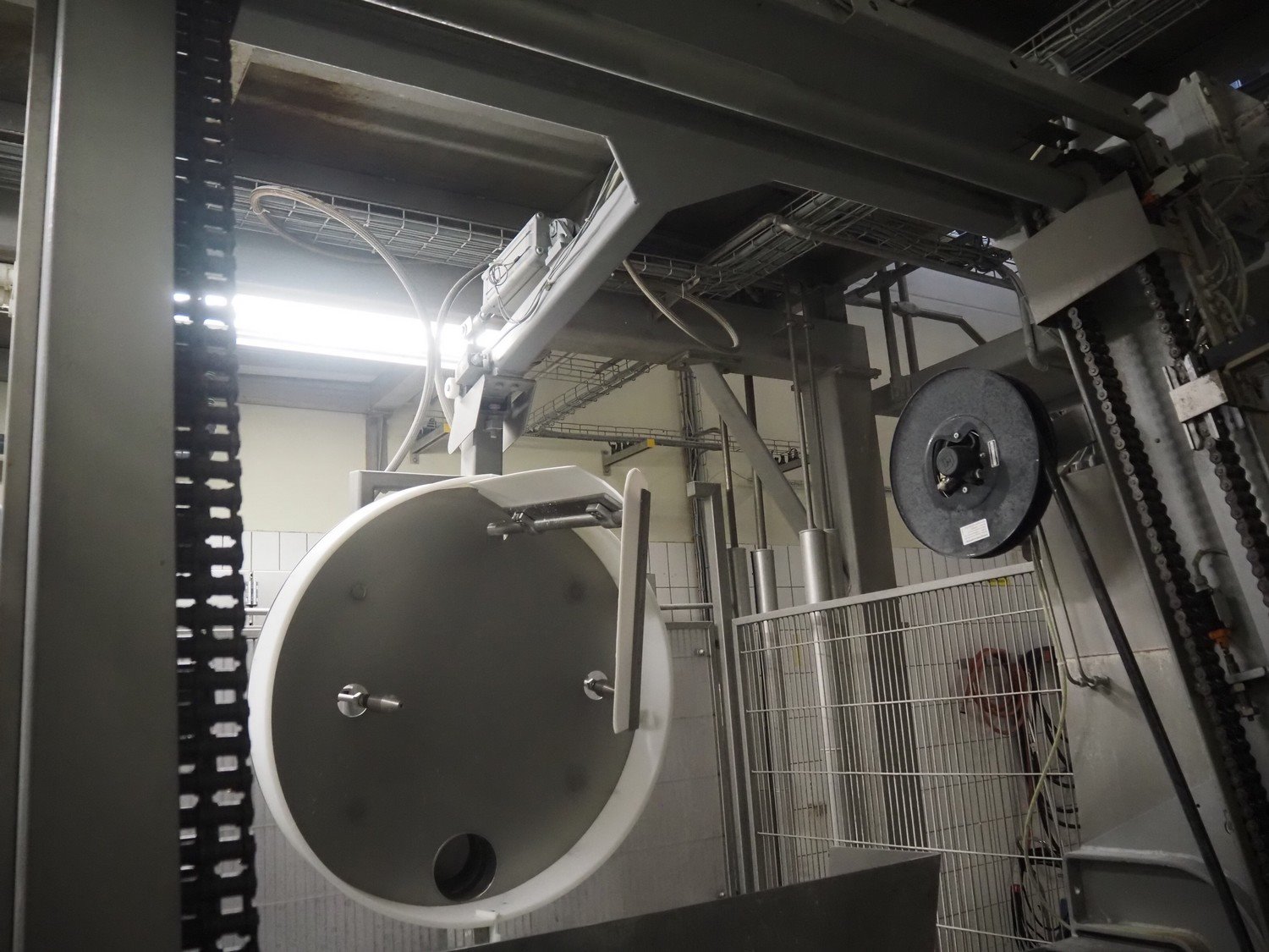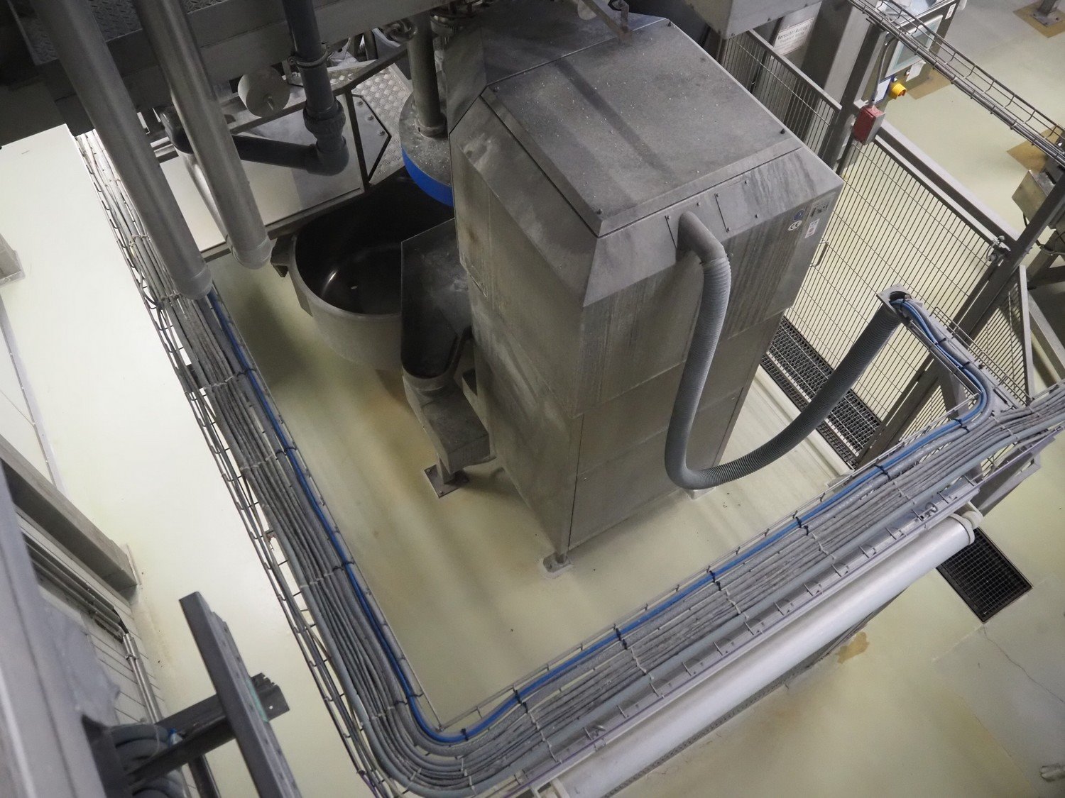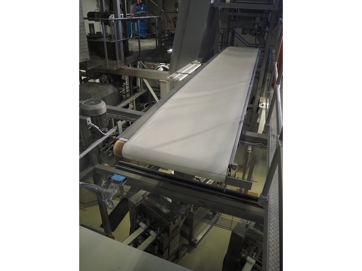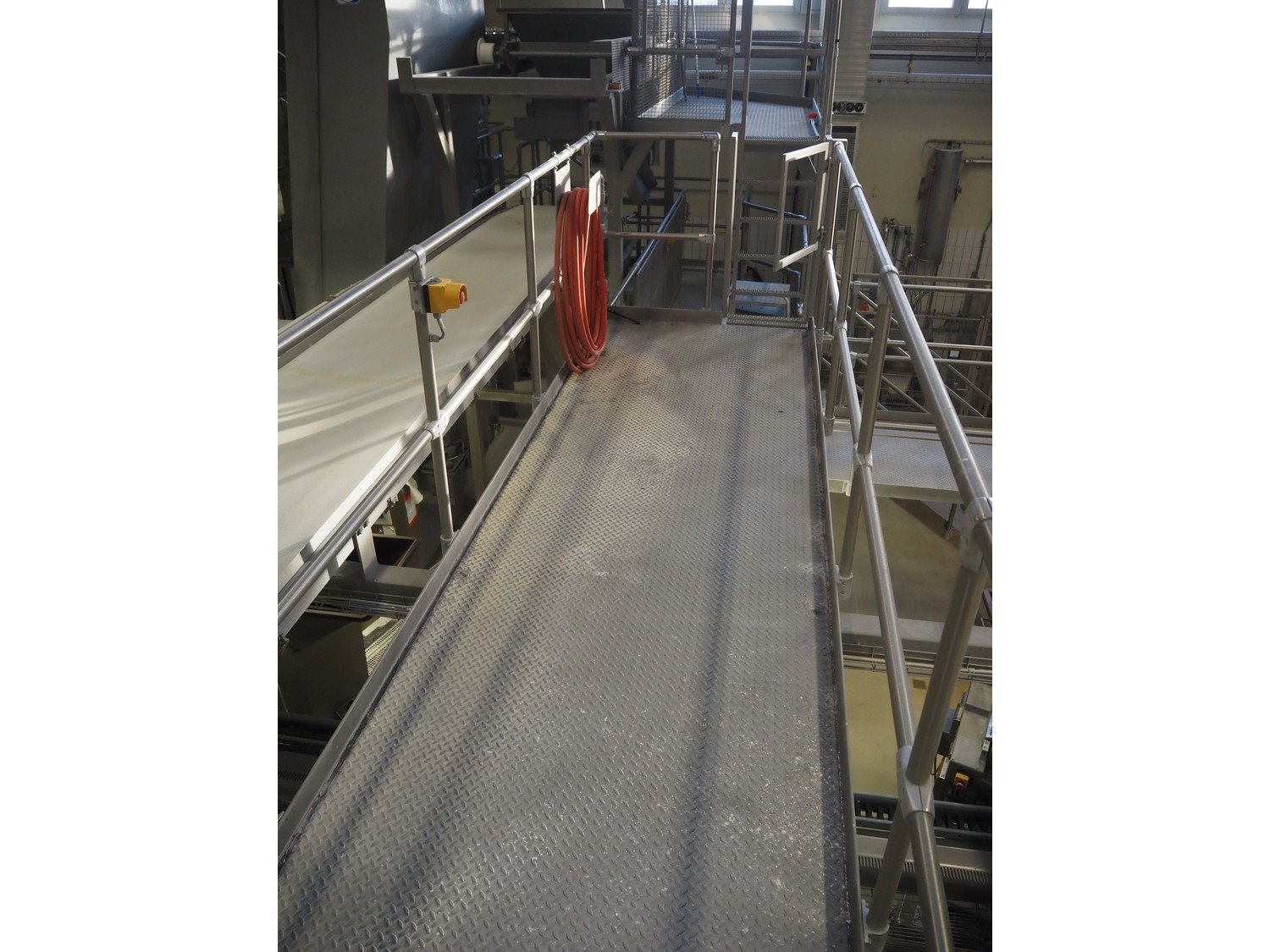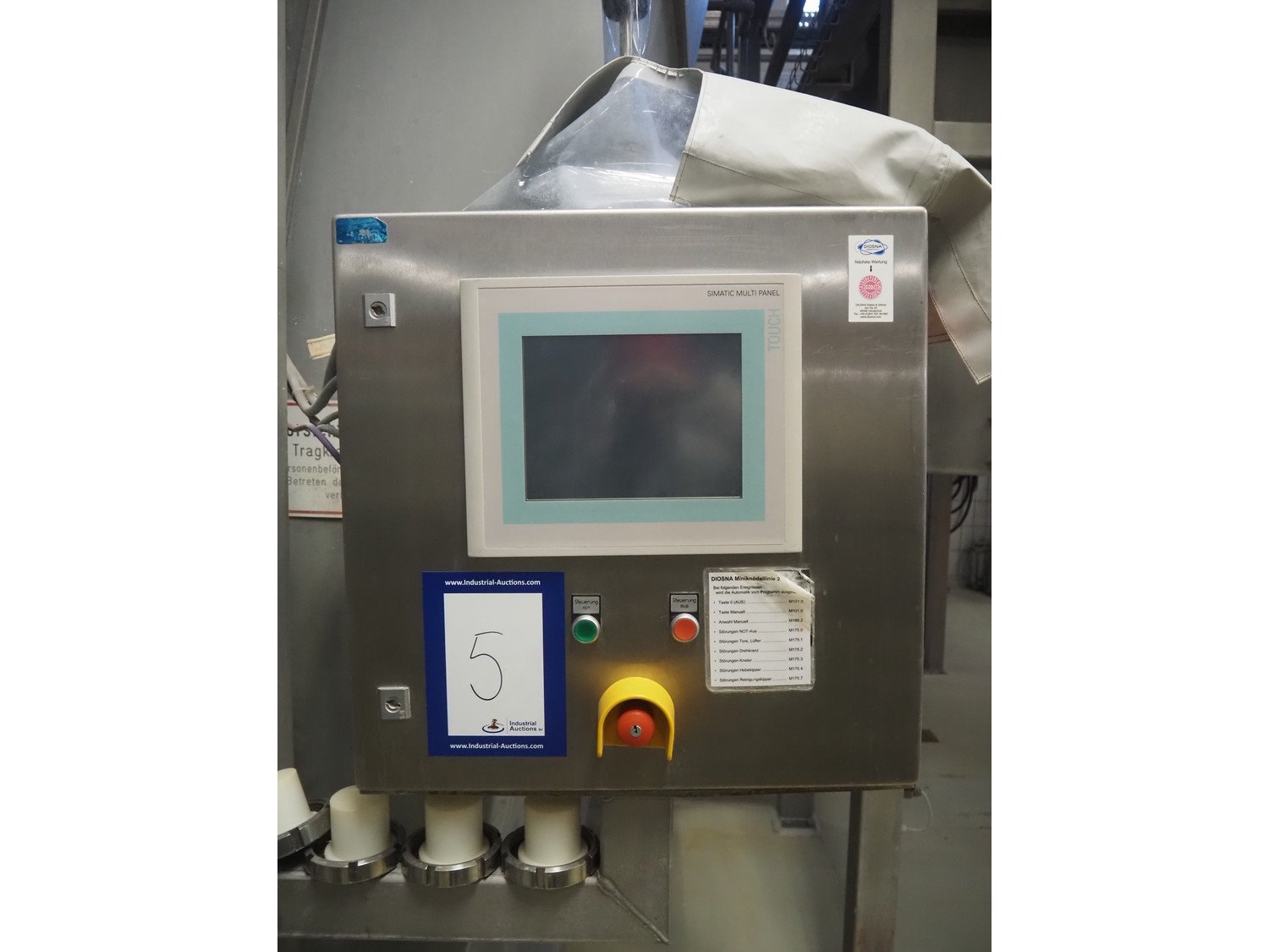 Diosna Dierks & Söhne GmbH carousel dough kneading installation consisting of: Diosna Dierks & Söhne GmbH wendel mixer with rotating carousel, type: WV 240 A, number: 974-056, 400 V, 3 Ph, 50 Hz, 34 kW, 63 A, 4 s/s tubs, inside dimensions: (4x) Ø 1000 mm x 500 mm, volume each tub: 370 liter / 240 kg, total dimensions: 3900 mm x 3100 mm x 2550 mm, Diosna Dierks & Söhne GmbH lifter with mobile outfeed hopper, type: HK 300, number: 3400-286, year of construction: 2006, 400 V, 3 Ph, 50 Hz, 7.9 A, 3.15 kW, dimensions: 2100 mm x 2300 mm x 7000 mm, Diosna Dierks & Söhne GmbH washing station, type: HK-300, number: 3400-291, year of construction: 2006, 400 V, 3 Ph, 50 Hz, 4.4 A, 2.8 kW, dimensions: 2700 mm x 2400 mm x 2900 mm, Rosoma water preparation unit for washing station, Diosna Dierks & Söhne GmbH outfeed belt, plastic belt, belt width: 850 mm, total dimensions: 6500 mm x 900 mm x 400 mm, Diosna Dierks & Söhne GmbH mobile outfeed dividing belt, plastic belt, belt width: 850 mm, total dimensions: 3500 mm x 1350 mm x 900 mm, S/s platform, dimensions: 11000 mm x 11000 mm x 7150 mm, S/s switch cabinet, dimensions: 3650 mm x 550 mm x 2300 mm. Kavel locatie: Schultetusstraße 37, 17153 Stavenhagen, Duitsland