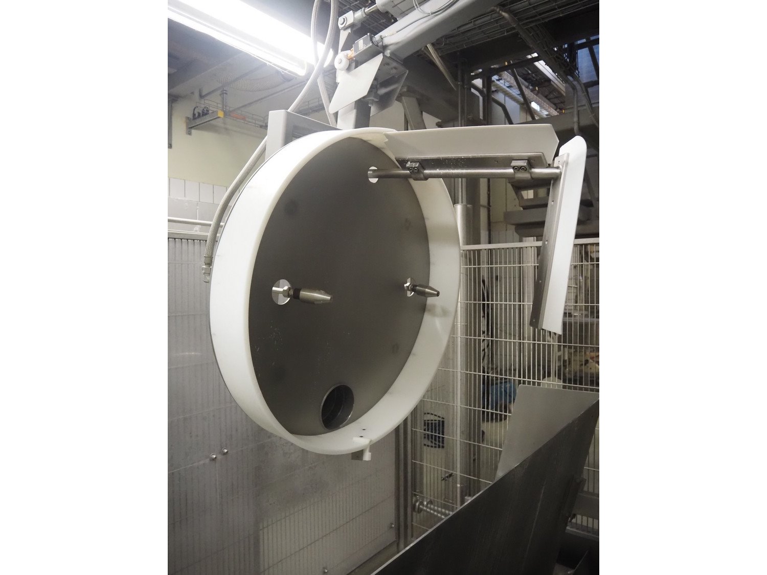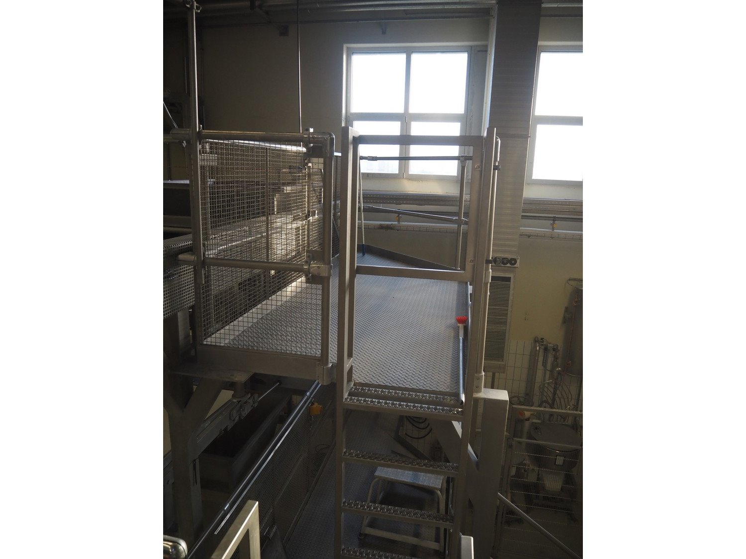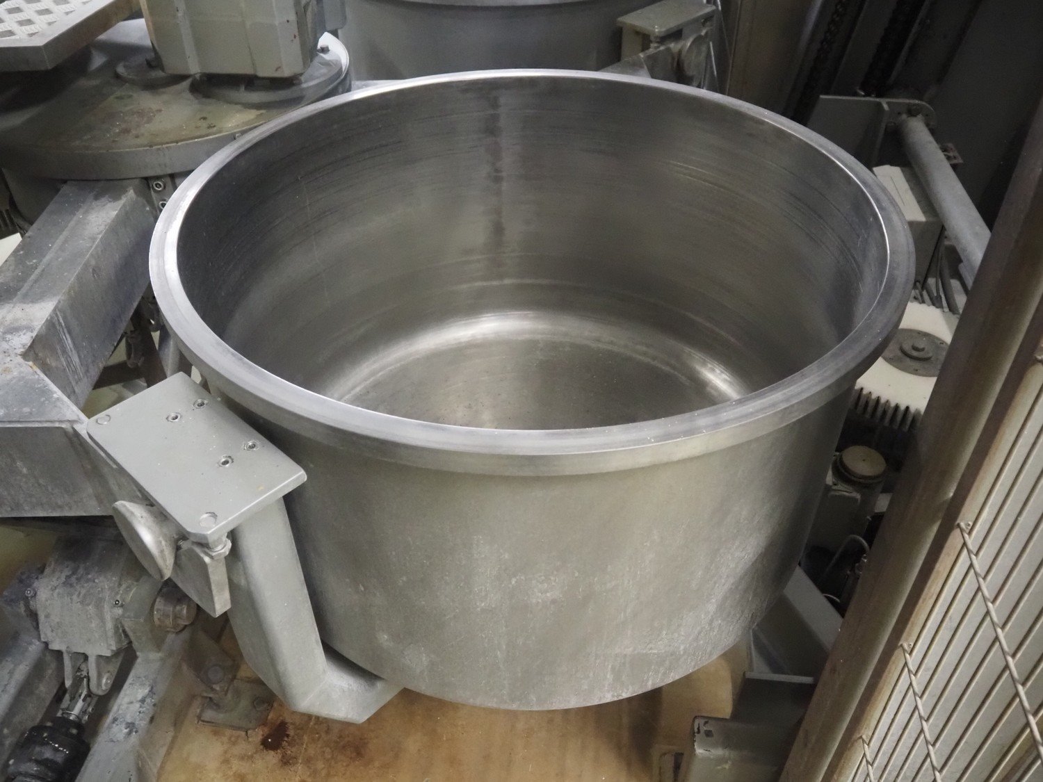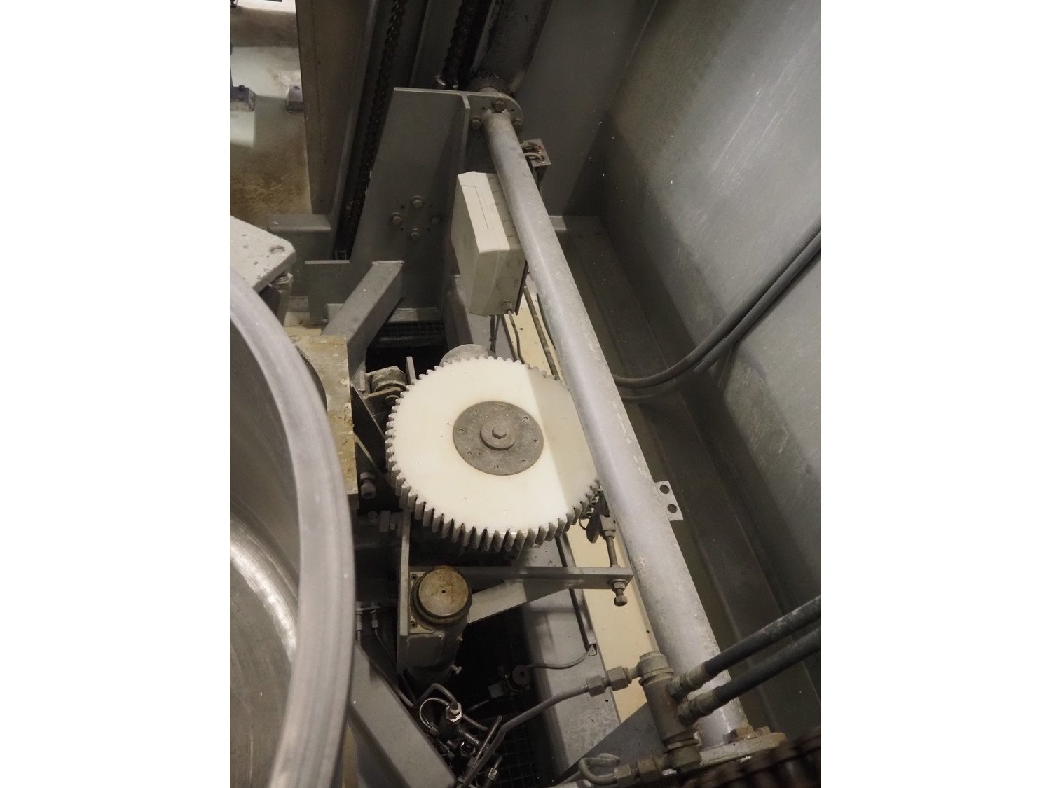 Diosna Dierks & Söhne GmbH carousel dough kneading installation consisting of: Diosna Dierks & Söhne GmbH wendel mixer with rotating carousel, type: WV 240 A, number: 974-056, 400 V, 3 Ph, 50 Hz, 34 kW, 63 A, 4 s/s tubs, inside dimensions: (4x) Ø 1000 mm x 500 mm, volume each tub: 370 liter / 240 kg, total dimensions: 3900 mm x 3100 mm x 2550 mm, Diosna Dierks & Söhne GmbH lifter with mobile outfeed hopper, type: HK 300, number: 3400-286, year of construction: 2006, 400 V, 3 Ph, 50 Hz, 7.9 A, 3.15 kW, dimensions: 2100 mm x 2300 mm x 7000 mm, Diosna Dierks & Söhne GmbH washing station, type: HK-300, number: 3400-291, year of construction: 2006, 400 V, 3 Ph, 50 Hz, 4.4 A, 2.8 kW, dimensions: 2700 mm x 2400 mm x 2900 mm, Rosoma water preparation unit for washing station, Diosna Dierks & Söhne GmbH outfeed belt, plastic belt, belt width: 850 mm, total dimensions: 6500 mm x 900 mm x 400 mm, Diosna Dierks & Söhne GmbH mobile outfeed dividing belt, plastic belt, belt width: 850 mm, total dimensions: 3500 mm x 1350 mm x 900 mm, S/s platform, dimensions: 11000 mm x 11000 mm x 7150 mm, S/s switch cabinet, dimensions: 3650 mm x 550 mm x 2300 mm. Kavel locatie: Schultetusstraße 37, 17153 Stavenhagen, Duitsland