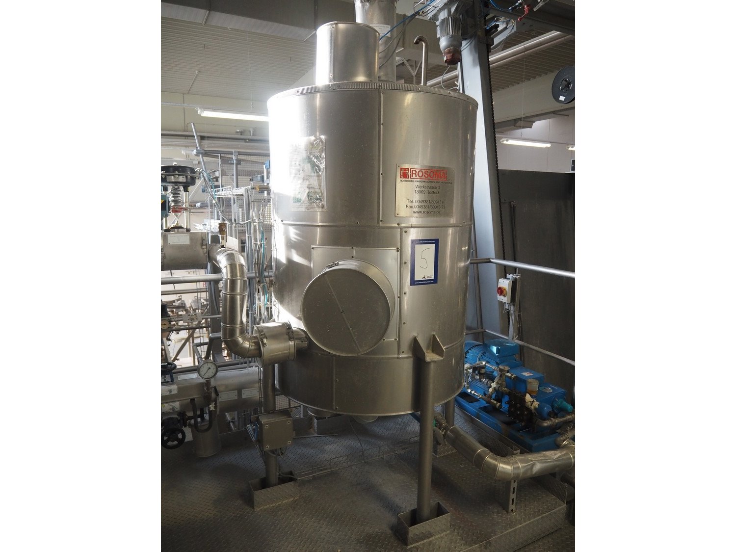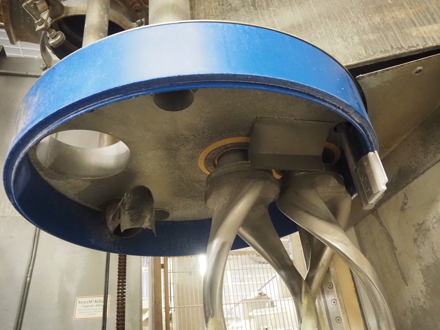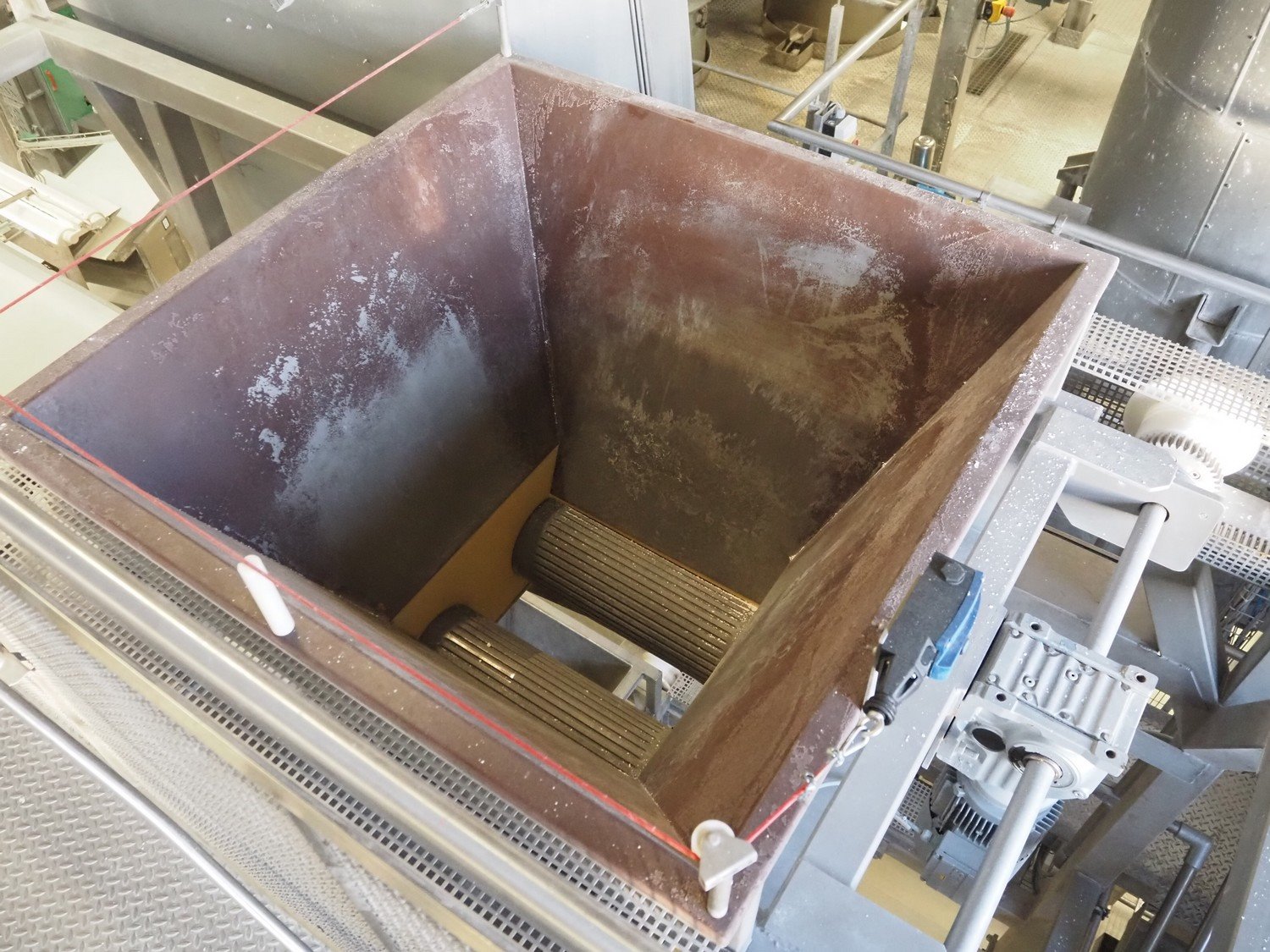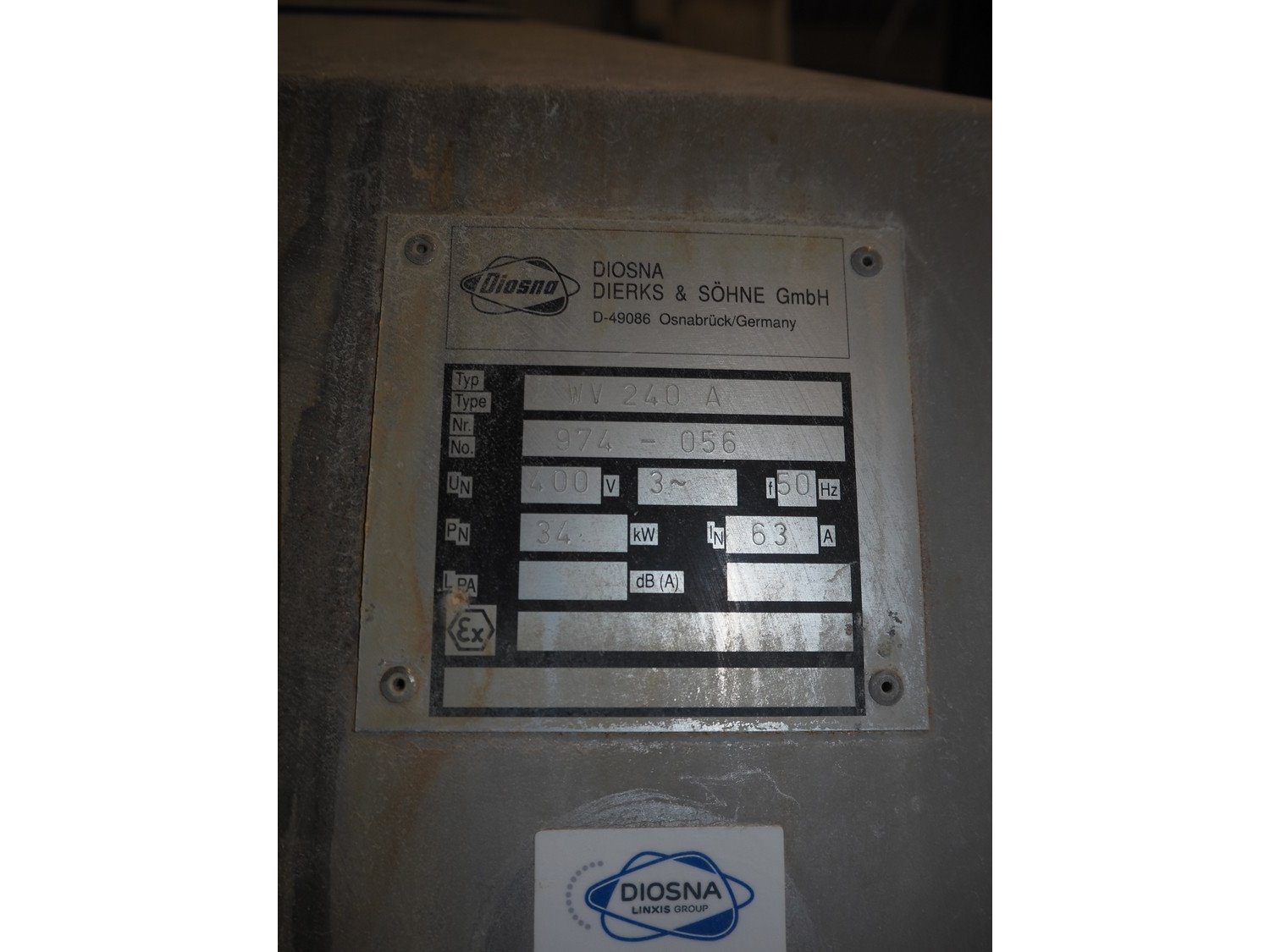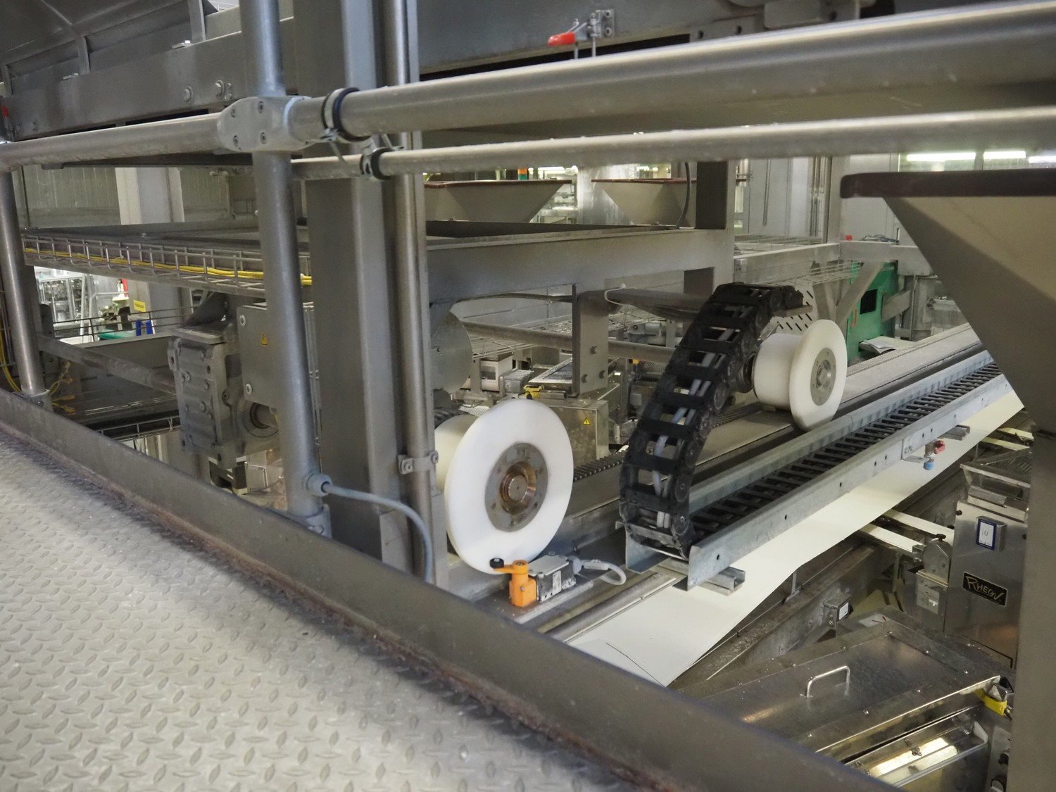 Diosna Dierks & Söhne GmbH carousel dough kneading installation consisting of: Diosna Dierks & Söhne GmbH wendel mixer with rotating carousel, type: WV 240 A, number: 974-056, 400 V, 3 Ph, 50 Hz, 34 kW, 63 A, 4 s/s tubs, inside dimensions: (4x) Ø 1000 mm x 500 mm, volume each tub: 370 liter / 240 kg, total dimensions: 3900 mm x 3100 mm x 2550 mm, Diosna Dierks & Söhne GmbH lifter with mobile outfeed hopper, type: HK 300, number: 3400-286, year of construction: 2006, 400 V, 3 Ph, 50 Hz, 7.9 A, 3.15 kW, dimensions: 2100 mm x 2300 mm x 7000 mm, Diosna Dierks & Söhne GmbH washing station, type: HK-300, number: 3400-291, year of construction: 2006, 400 V, 3 Ph, 50 Hz, 4.4 A, 2.8 kW, dimensions: 2700 mm x 2400 mm x 2900 mm, Rosoma water preparation unit for washing station, Diosna Dierks & Söhne GmbH outfeed belt, plastic belt, belt width: 850 mm, total dimensions: 6500 mm x 900 mm x 400 mm, Diosna Dierks & Söhne GmbH mobile outfeed dividing belt, plastic belt, belt width: 850 mm, total dimensions: 3500 mm x 1350 mm x 900 mm, S/s platform, dimensions: 11000 mm x 11000 mm x 7150 mm, S/s switch cabinet, dimensions: 3650 mm x 550 mm x 2300 mm. Kavel locatie: Schultetusstraße 37, 17153 Stavenhagen, Duitsland