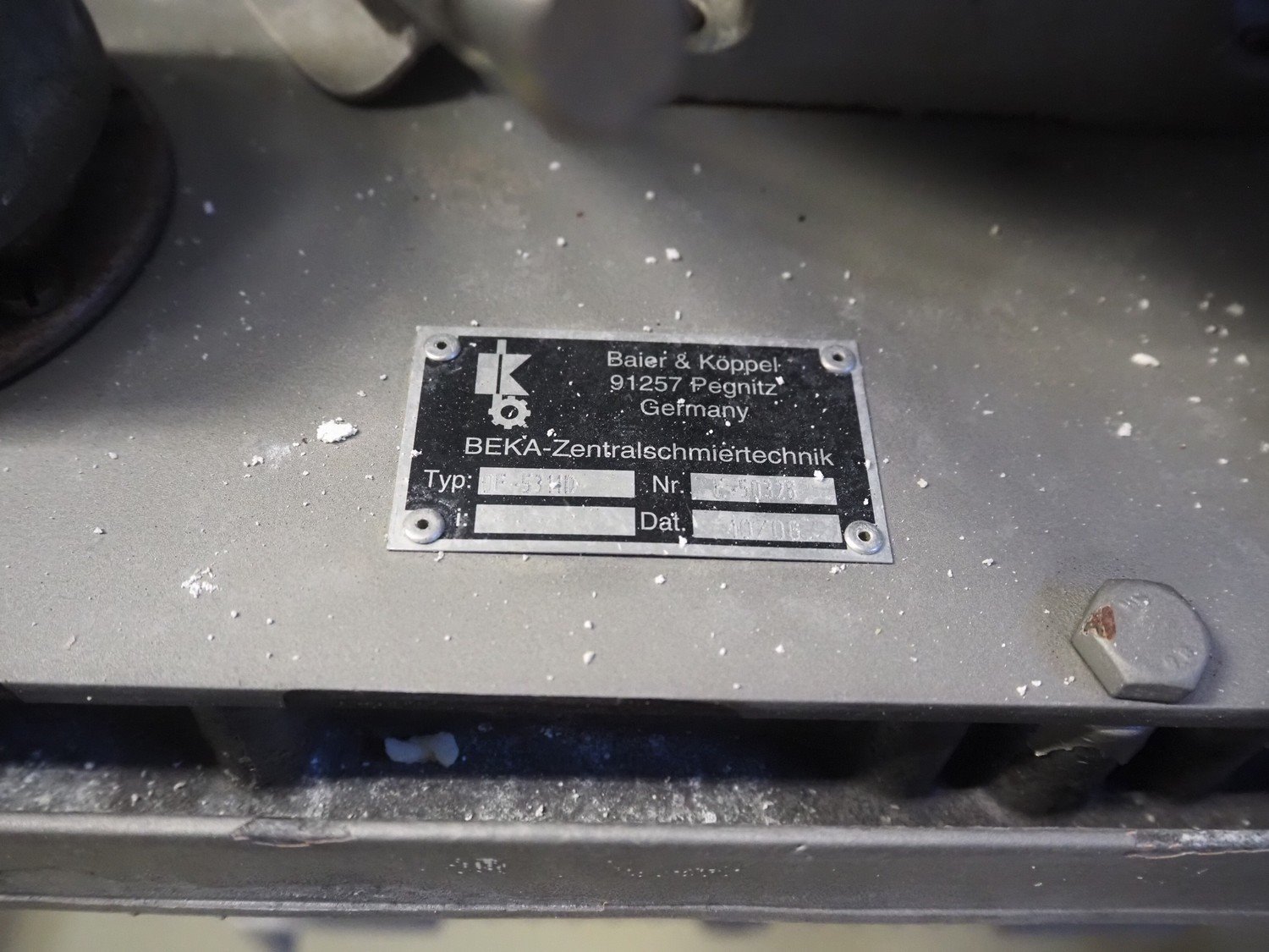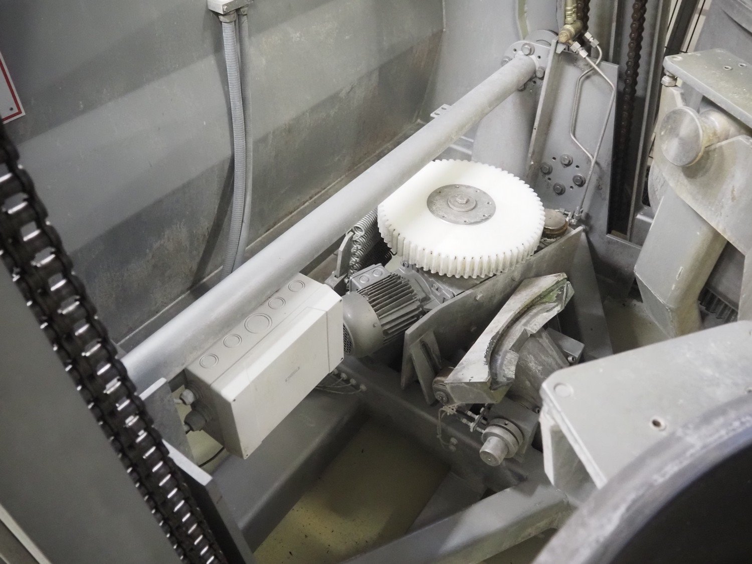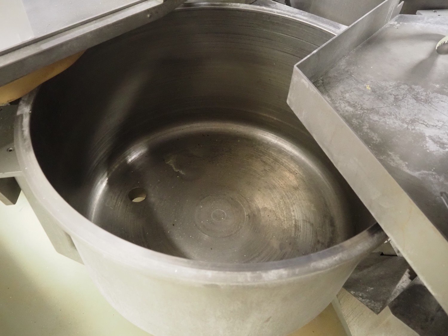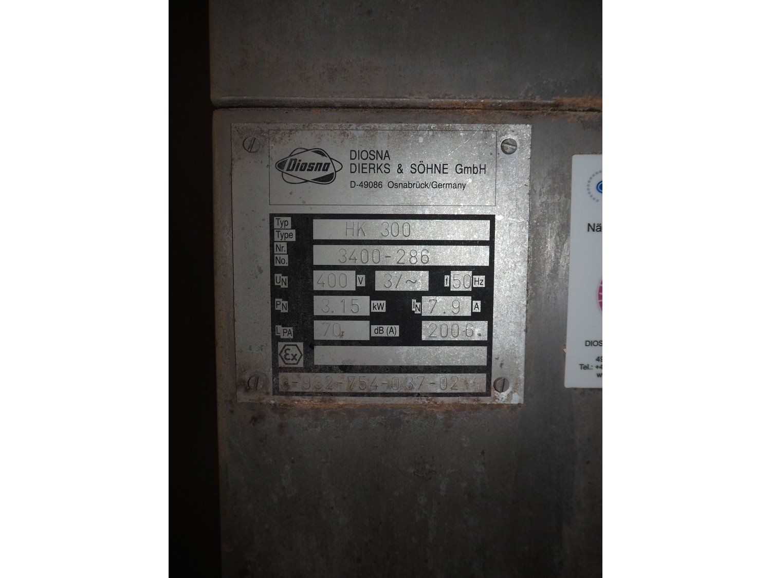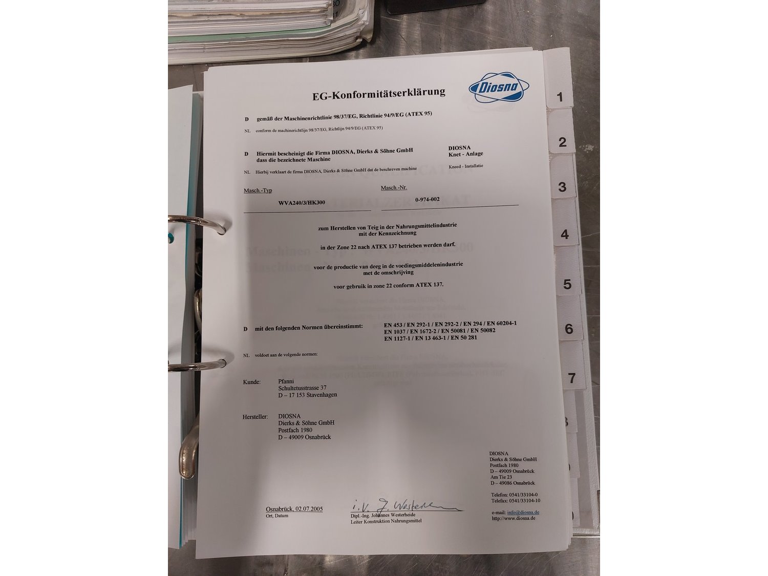 Diosna Dierks & Söhne GmbH carousel dough kneading installation consisting of: Diosna Dierks & Söhne GmbH wendel mixer with rotating carousel, type: WV 240 A, number: 974-056, 400 V, 3 Ph, 50 Hz, 34 kW, 63 A, 4 s/s tubs, inside dimensions: (4x) Ø 1000 mm x 500 mm, volume each tub: 370 liter / 240 kg, total dimensions: 3900 mm x 3100 mm x 2550 mm, Diosna Dierks & Söhne GmbH lifter with mobile outfeed hopper, type: HK 300, number: 3400-286, year of construction: 2006, 400 V, 3 Ph, 50 Hz, 7.9 A, 3.15 kW, dimensions: 2100 mm x 2300 mm x 7000 mm, Diosna Dierks & Söhne GmbH washing station, type: HK-300, number: 3400-291, year of construction: 2006, 400 V, 3 Ph, 50 Hz, 4.4 A, 2.8 kW, dimensions: 2700 mm x 2400 mm x 2900 mm, Rosoma water preparation unit for washing station, Diosna Dierks & Söhne GmbH outfeed belt, plastic belt, belt width: 850 mm, total dimensions: 6500 mm x 900 mm x 400 mm, Diosna Dierks & Söhne GmbH mobile outfeed dividing belt, plastic belt, belt width: 850 mm, total dimensions: 3500 mm x 1350 mm x 900 mm, S/s platform, dimensions: 11000 mm x 11000 mm x 7150 mm, S/s switch cabinet, dimensions: 3650 mm x 550 mm x 2300 mm. Kavel locatie: Schultetusstraße 37, 17153 Stavenhagen, Duitsland