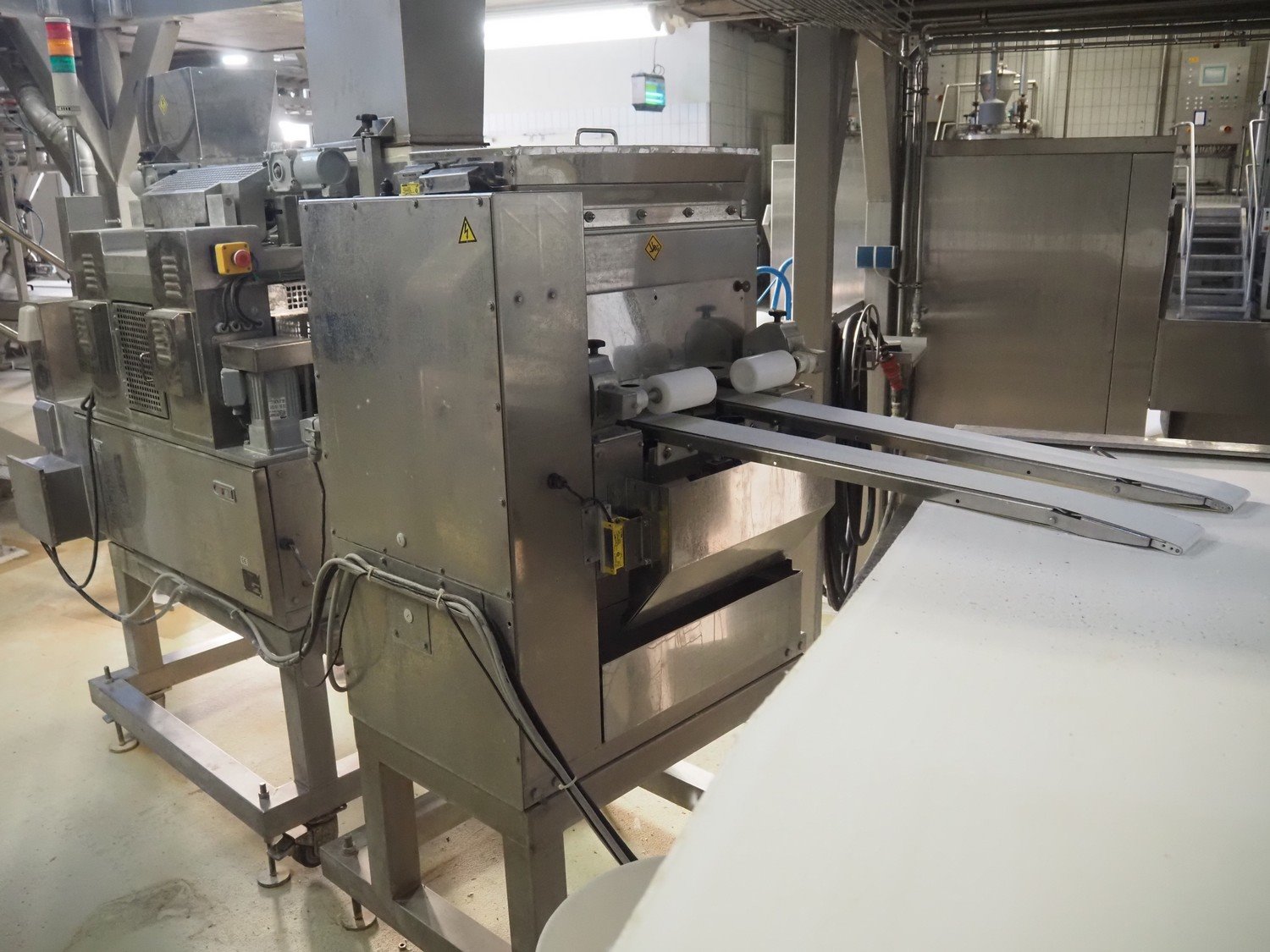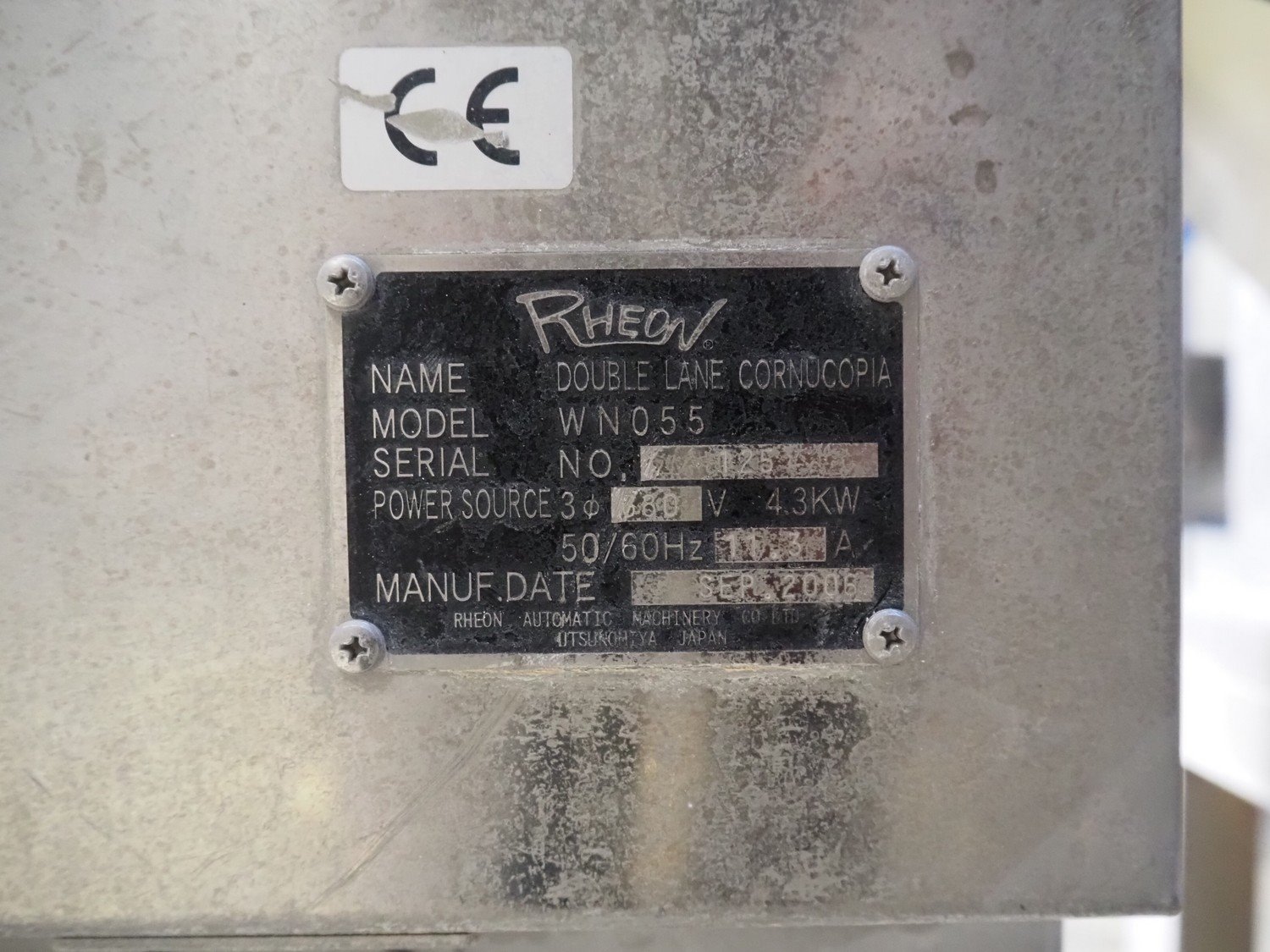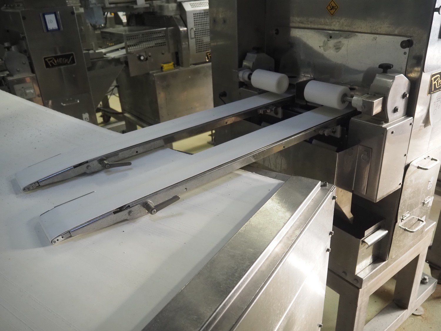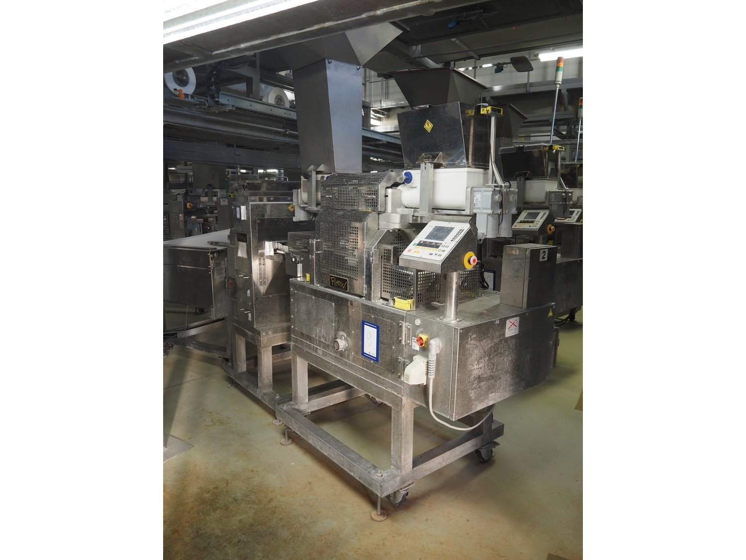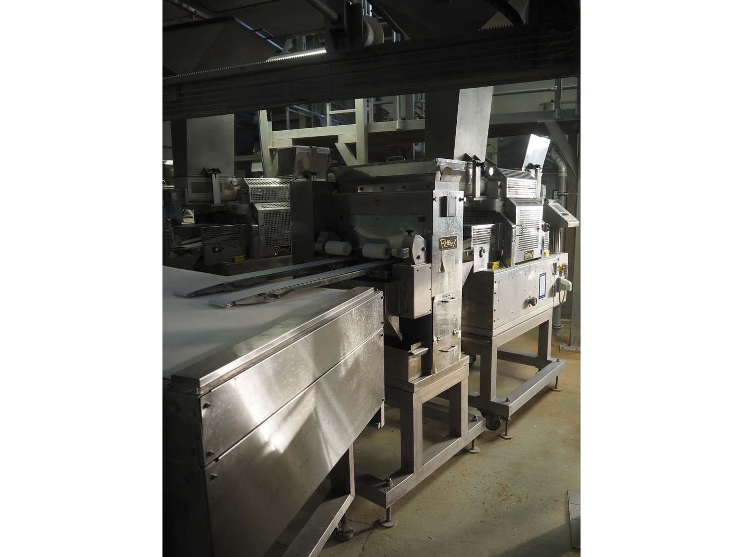 Rheon double lane encrusting machine with flour covering device, model encrusting machine: WN055, serial number: 125, year of construction: sep. 2006, 380 V, 3 Ph, 50/60 Hz, 11.3 A, 4.3 kW, plastic belt, belt width: (2x) 130 mm, total dimensions: 1700 mm x 1000 mm x 2750 mm, model flour covering device: DU220, serial number: 220, year of construction: oct. 2008, 200 V, 3 Ph, 50 Hz, 2.6 A, 0.28 kW, plastic belt, belt width: (2x) 100 mm, total dimensions: 1600 mm x 900 mm x 1750 mm. Kavel locatie: Schultetusstraße 37, 17153 Stavenhagen, Duitsland