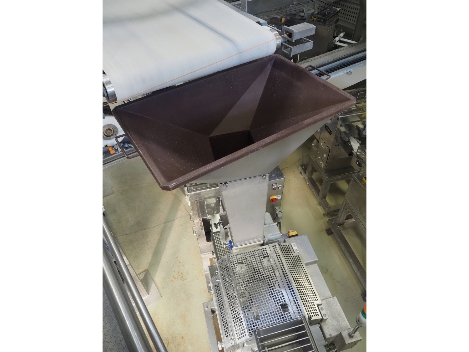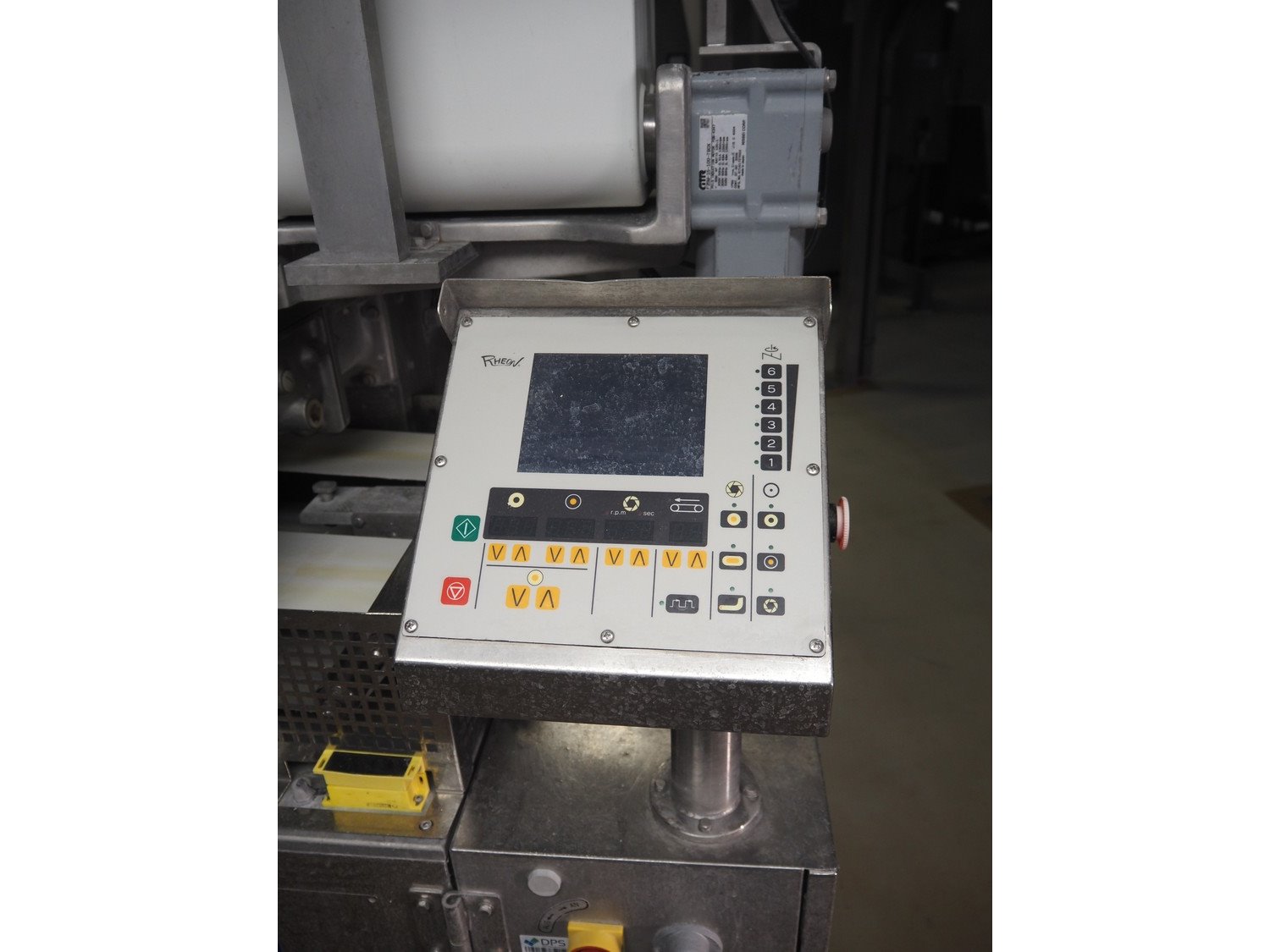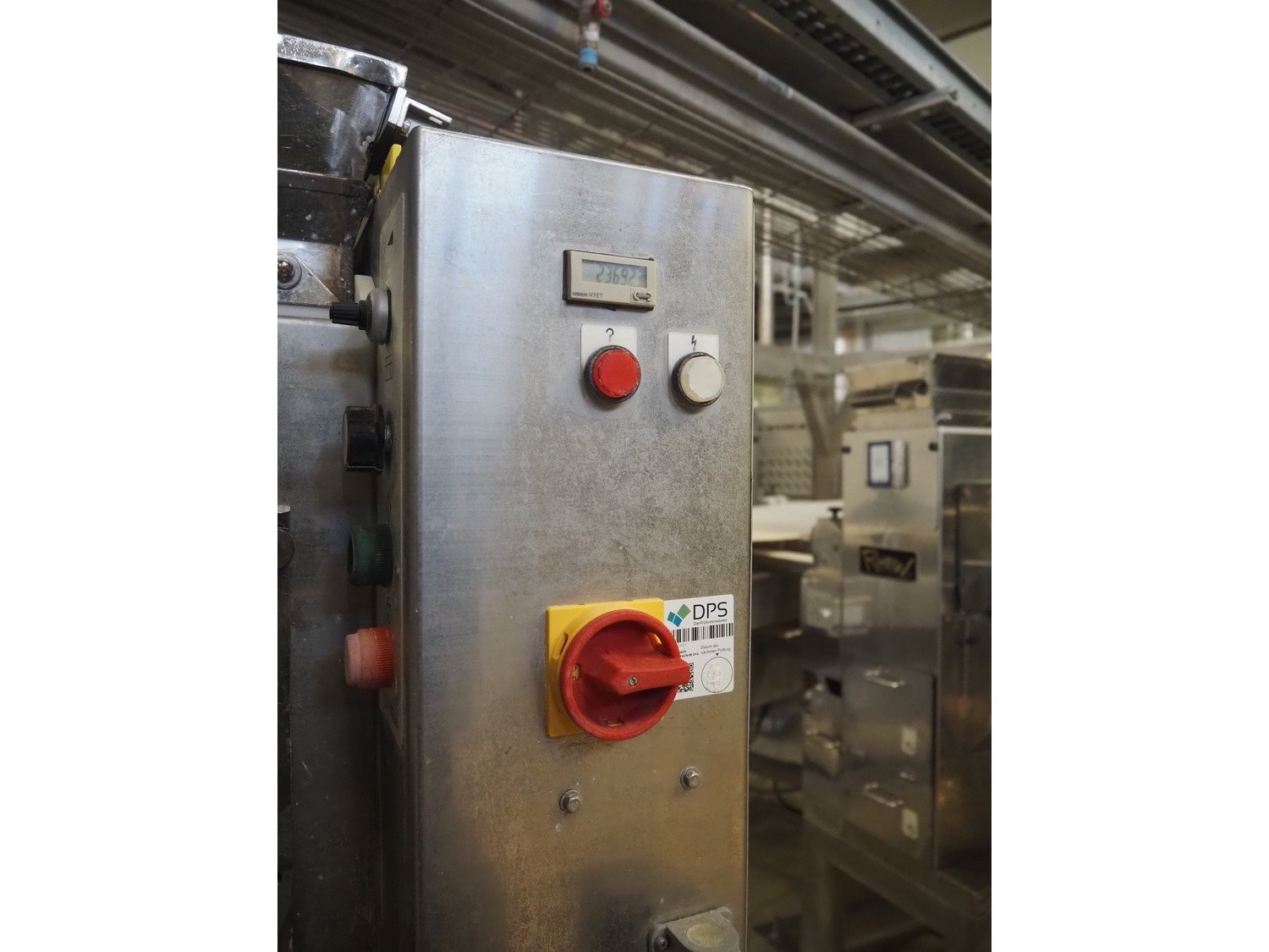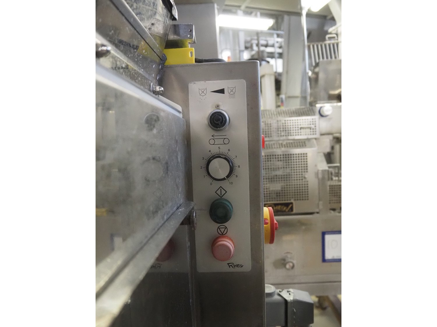 Rheon double lane encrusting machine with flour covering device, model encrusting machine: WN055, serial number: 125, year of construction: sep. 2006, 380 V, 3 Ph, 50/60 Hz, 11.3 A, 4.3 kW, plastic belt, belt width: (2x) 130 mm, total dimensions: 1700 mm x 1000 mm x 2750 mm, model flour covering device: DU220, serial number: 220, year of construction: oct. 2008, 200 V, 3 Ph, 50 Hz, 2.6 A, 0.28 kW, plastic belt, belt width: (2x) 100 mm, total dimensions: 1600 mm x 900 mm x 1750 mm. Kavel locatie: Schultetusstraße 37, 17153 Stavenhagen, Duitsland