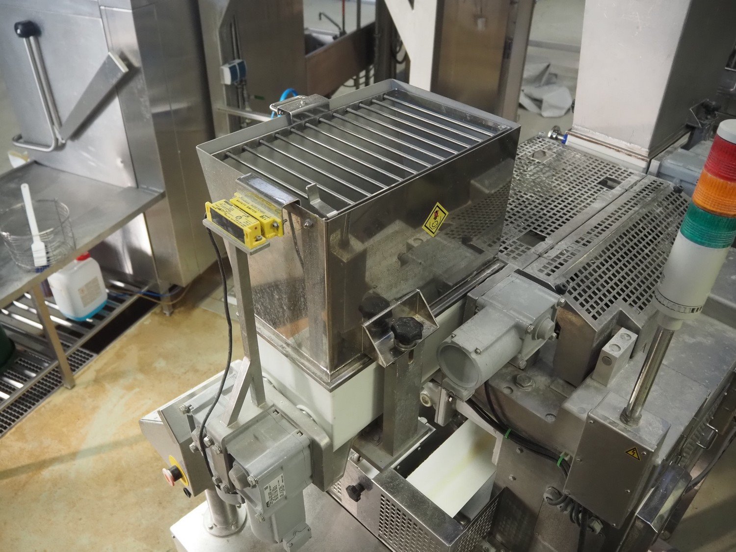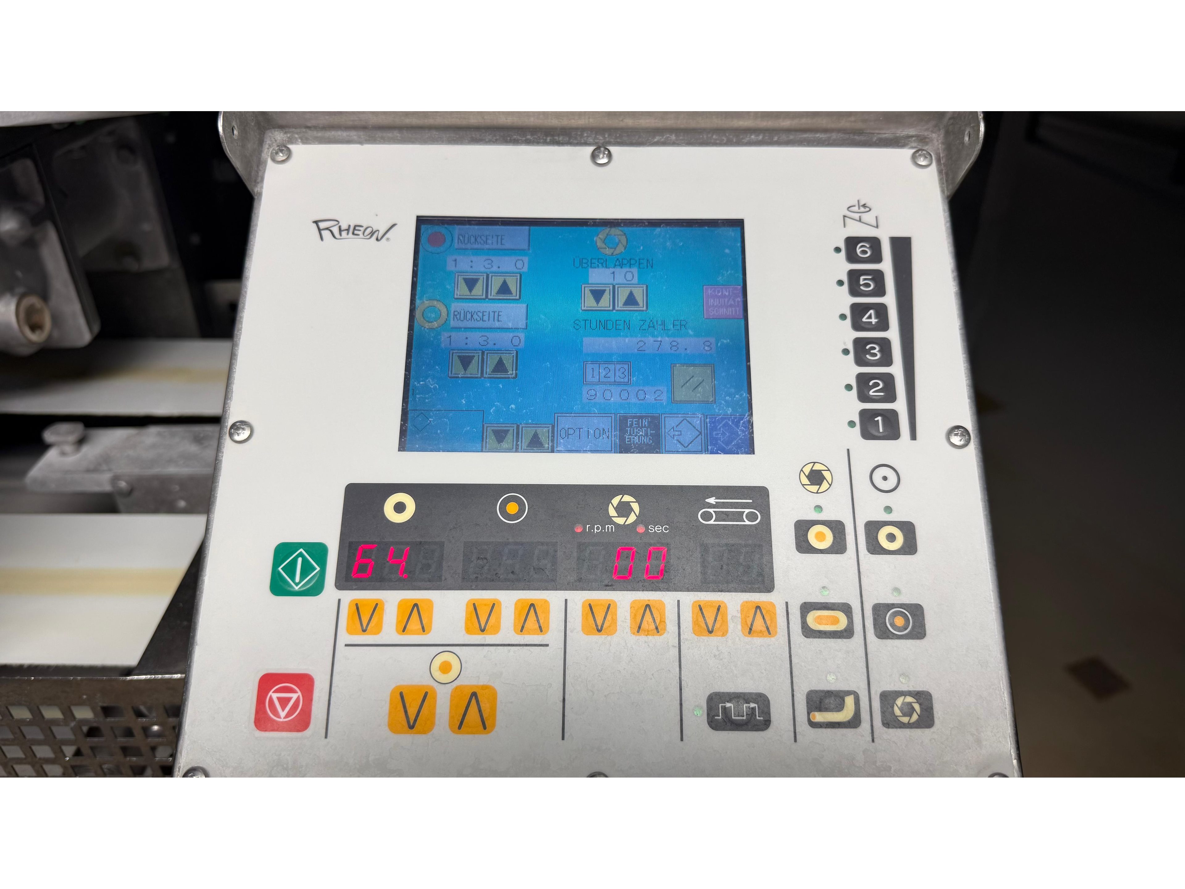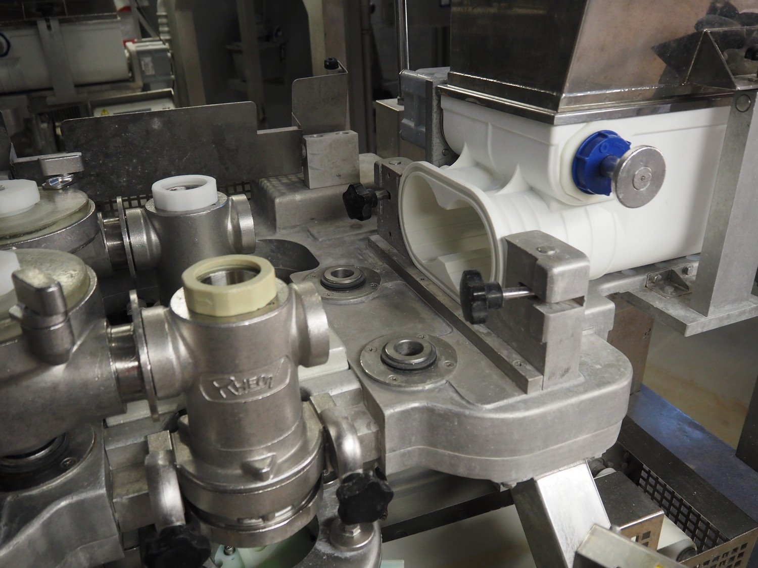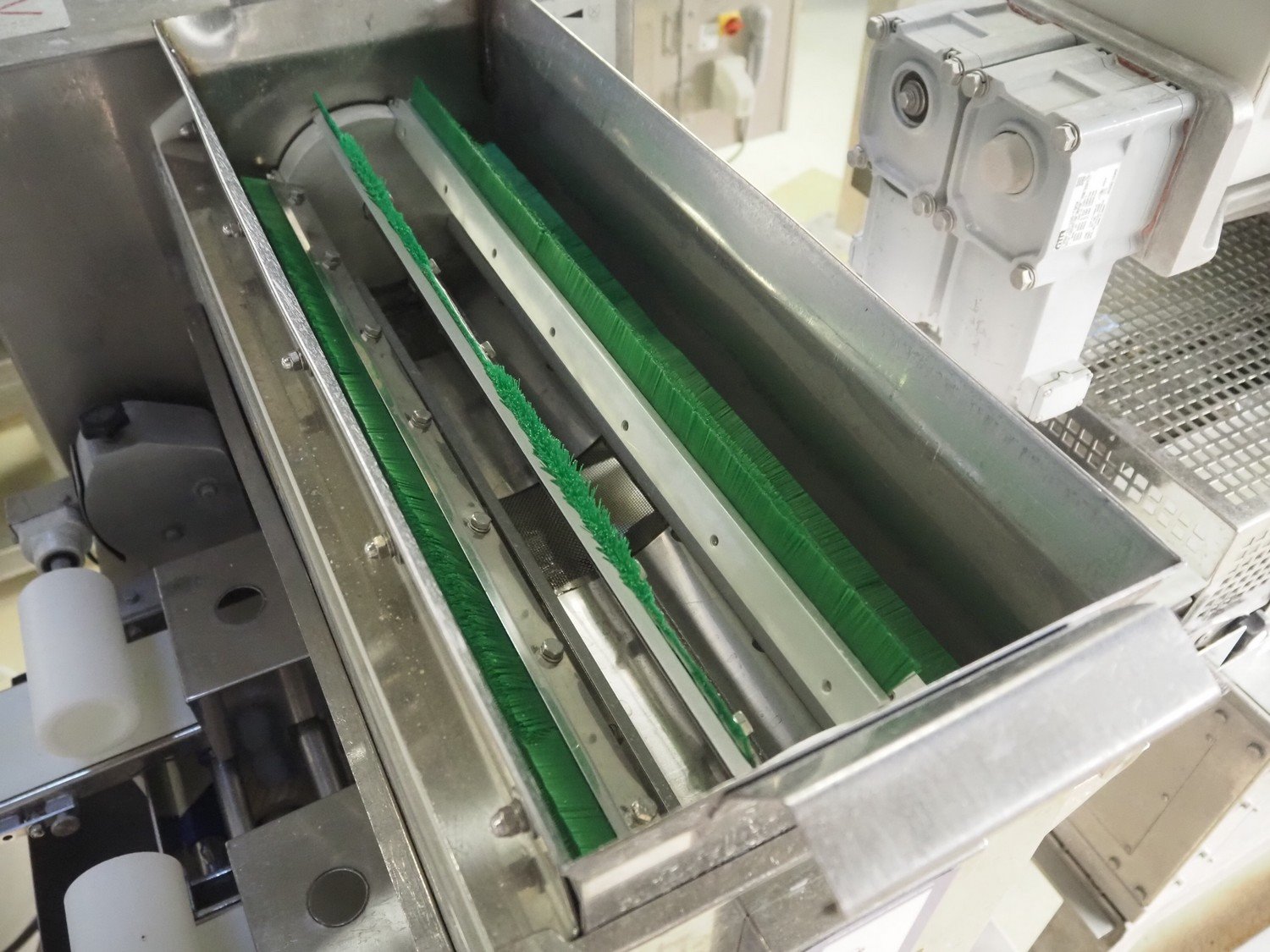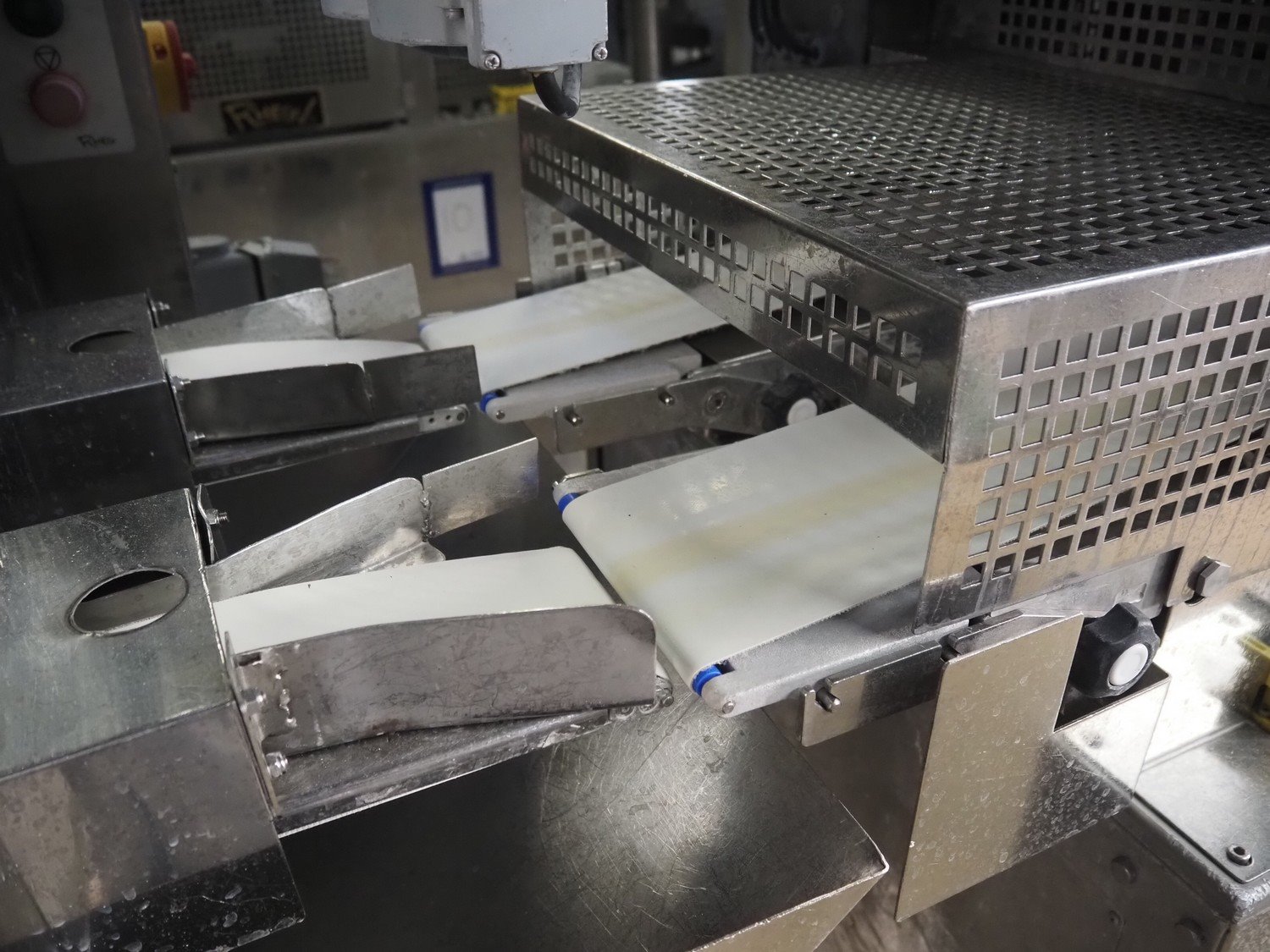 Rheon double lane encrusting machine with flour covering device, model encrusting machine: WN055, serial number: 125, year of construction: sep. 2006, 380 V, 3 Ph, 50/60 Hz, 11.3 A, 4.3 kW, plastic belt, belt width: (2x) 130 mm, total dimensions: 1700 mm x 1000 mm x 2750 mm, model flour covering device: DU220, serial number: 220, year of construction: oct. 2008, 200 V, 3 Ph, 50 Hz, 2.6 A, 0.28 kW, plastic belt, belt width: (2x) 100 mm, total dimensions: 1600 mm x 900 mm x 1750 mm. Kavel locatie: Schultetusstraße 37, 17153 Stavenhagen, Duitsland