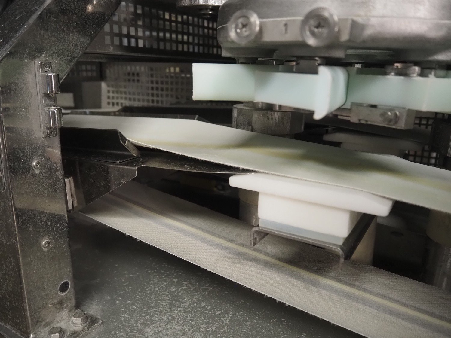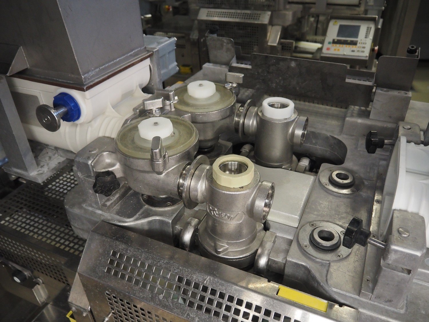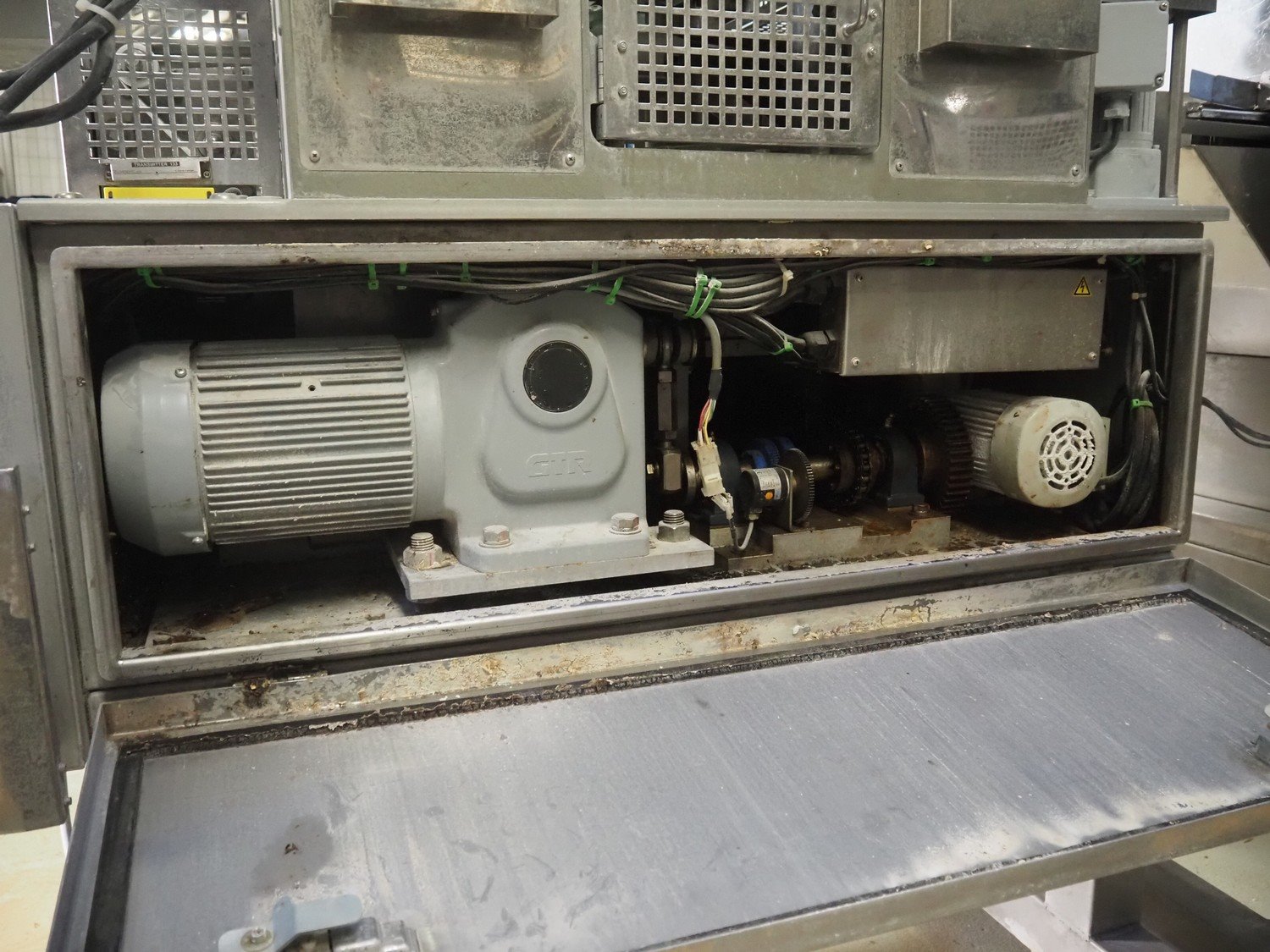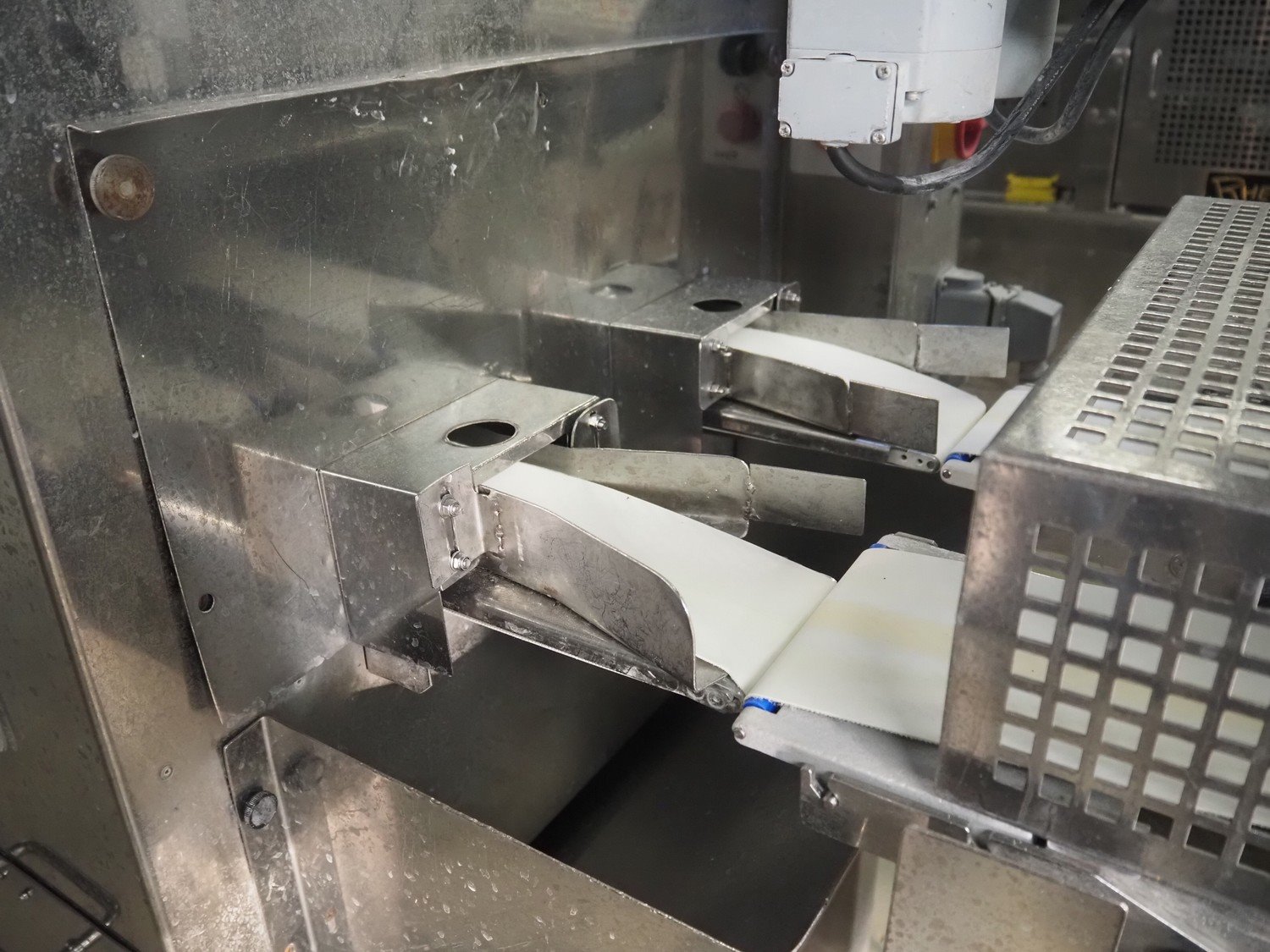 Rheon double lane encrusting machine with flour covering device, model encrusting machine: WN055, serial number: 125, year of construction: sep. 2006, 380 V, 3 Ph, 50/60 Hz, 11.3 A, 4.3 kW, plastic belt, belt width: (2x) 130 mm, total dimensions: 1700 mm x 1000 mm x 2750 mm, model flour covering device: DU220, serial number: 220, year of construction: oct. 2008, 200 V, 3 Ph, 50 Hz, 2.6 A, 0.28 kW, plastic belt, belt width: (2x) 100 mm, total dimensions: 1600 mm x 900 mm x 1750 mm. Kavel locatie: Schultetusstraße 37, 17153 Stavenhagen, Duitsland