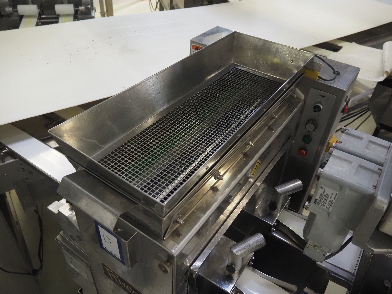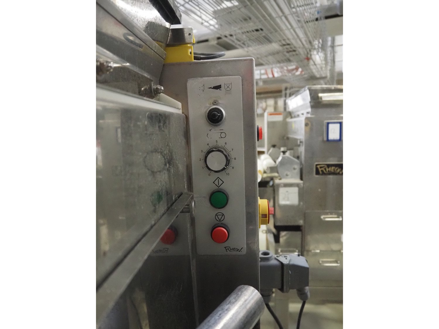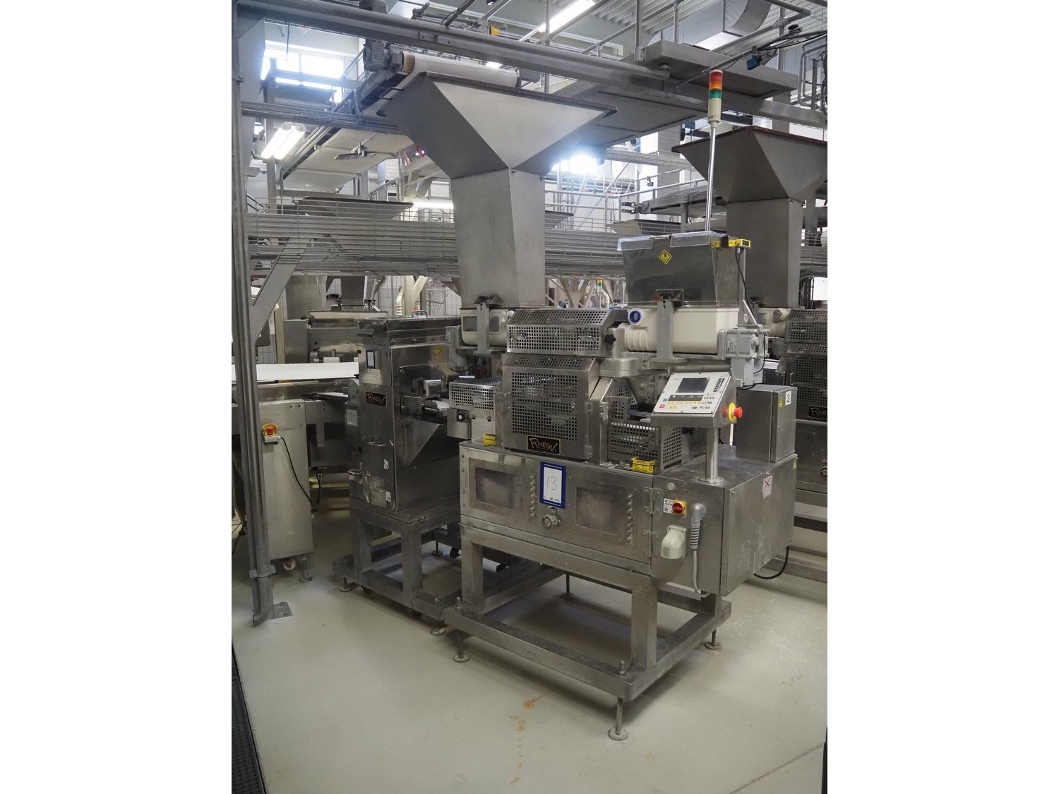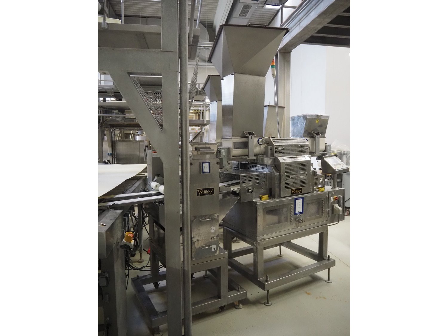 Rheon double lane encrusting machine with flour covering device, model encrusting machine: WN055, serial number: 172, year of construction: oct. 2008, 380 V, 3 Ph, 50/60 Hz, 11.3 A, 4.3 kW, plastic belt, belt width: (2x) 130 mm, total dimensions: 1700 mm x 1000 mm x 2750 mm, model flour covering device: DU220, serial number: 041, year of construction: sep. 2006, 200 V, 3 Ph, 50 Hz, 2.6 A, 0.28 kW, plastic belt, belt width: (2x) 100 mm, total dimensions: 1600 mm x 900 mm x 1750 mm. Kavel locatie: Schultetusstraße 37, 17153 Stavenhagen, Duitsland