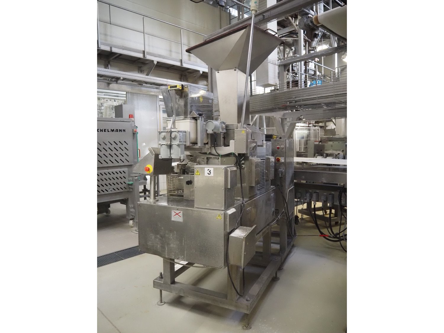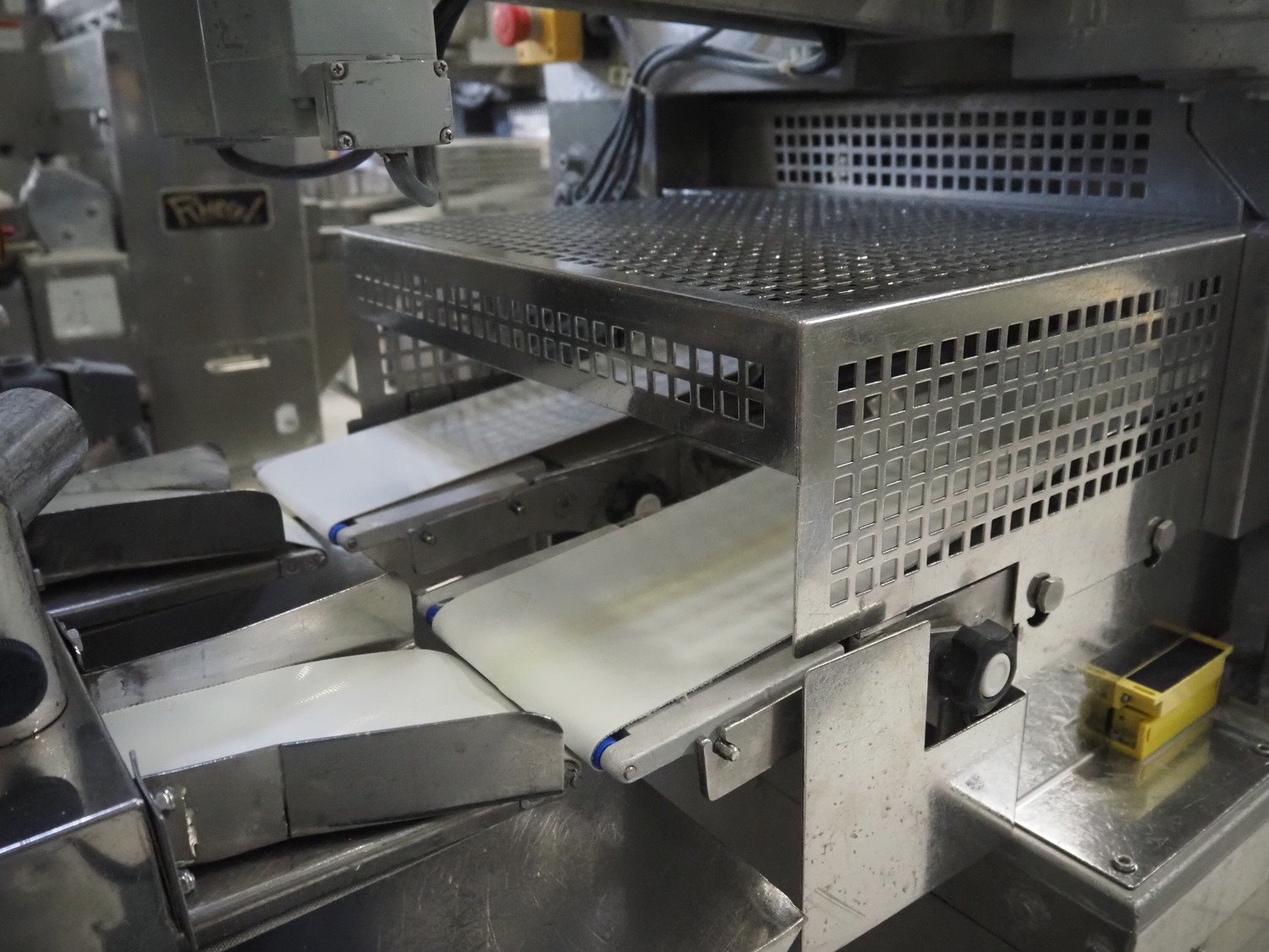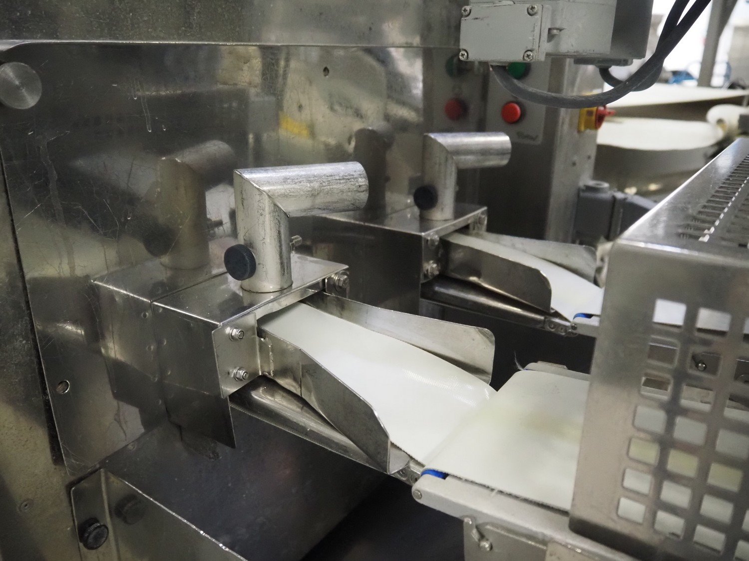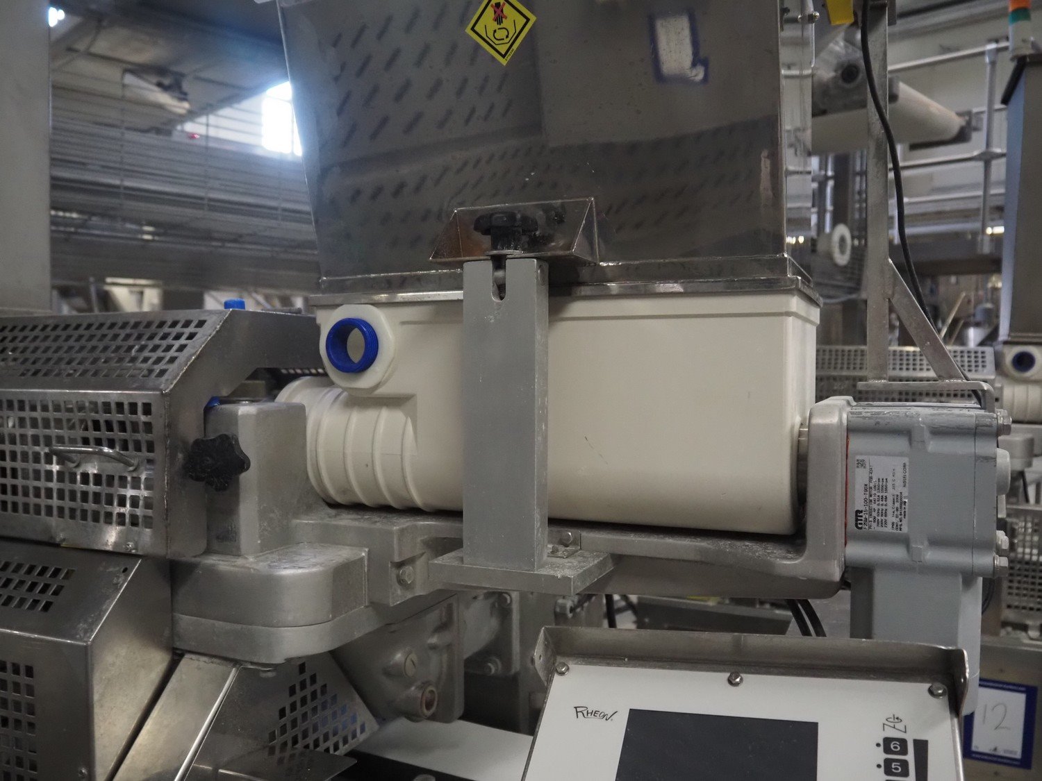 Rheon double lane encrusting machine with flour covering device, model encrusting machine: WN055, serial number: 172, year of construction: oct. 2008, 380 V, 3 Ph, 50/60 Hz, 11.3 A, 4.3 kW, plastic belt, belt width: (2x) 130 mm, total dimensions: 1700 mm x 1000 mm x 2750 mm, model flour covering device: DU220, serial number: 041, year of construction: sep. 2006, 200 V, 3 Ph, 50 Hz, 2.6 A, 0.28 kW, plastic belt, belt width: (2x) 100 mm, total dimensions: 1600 mm x 900 mm x 1750 mm. Kavel locatie: Schultetusstraße 37, 17153 Stavenhagen, Duitsland