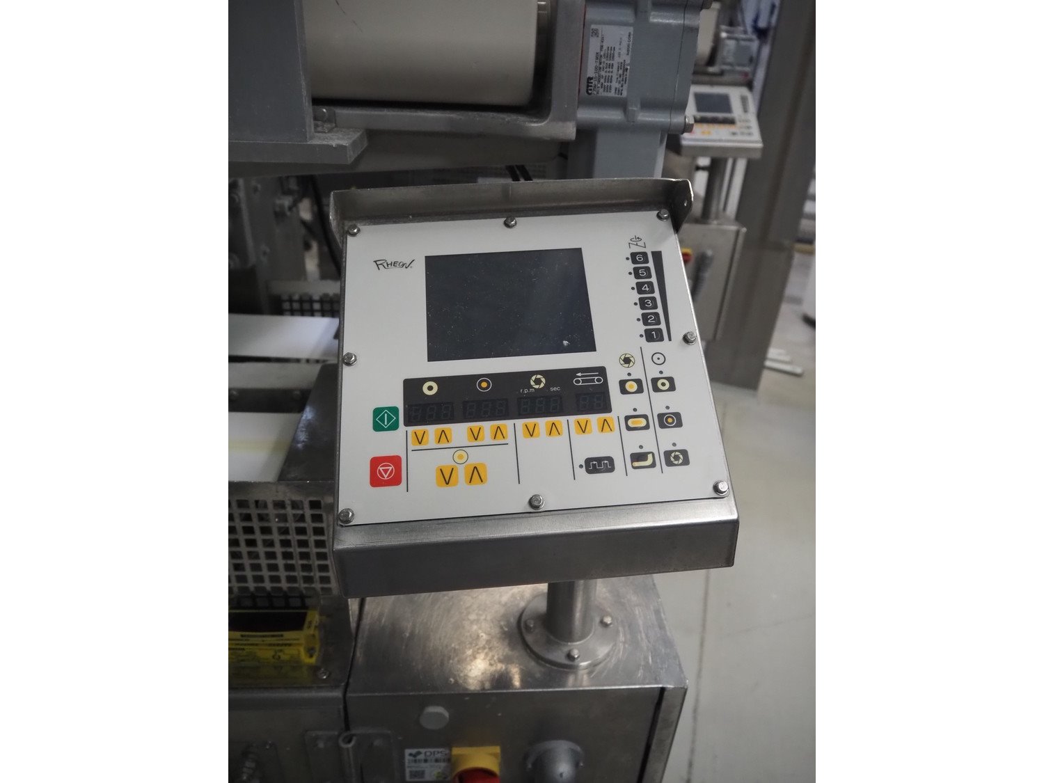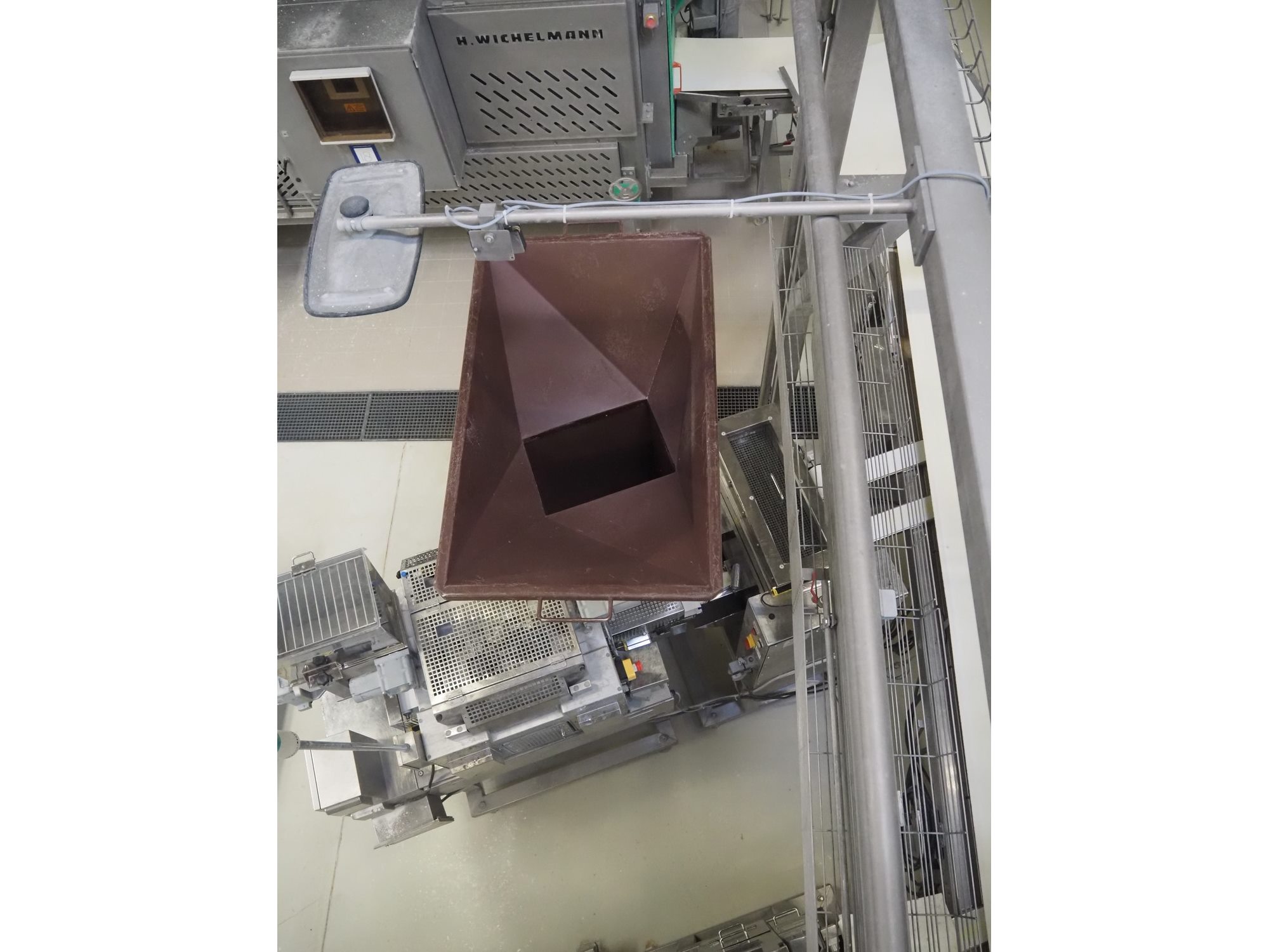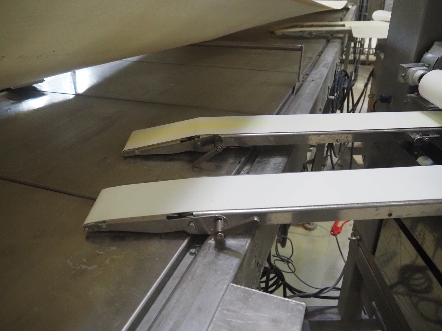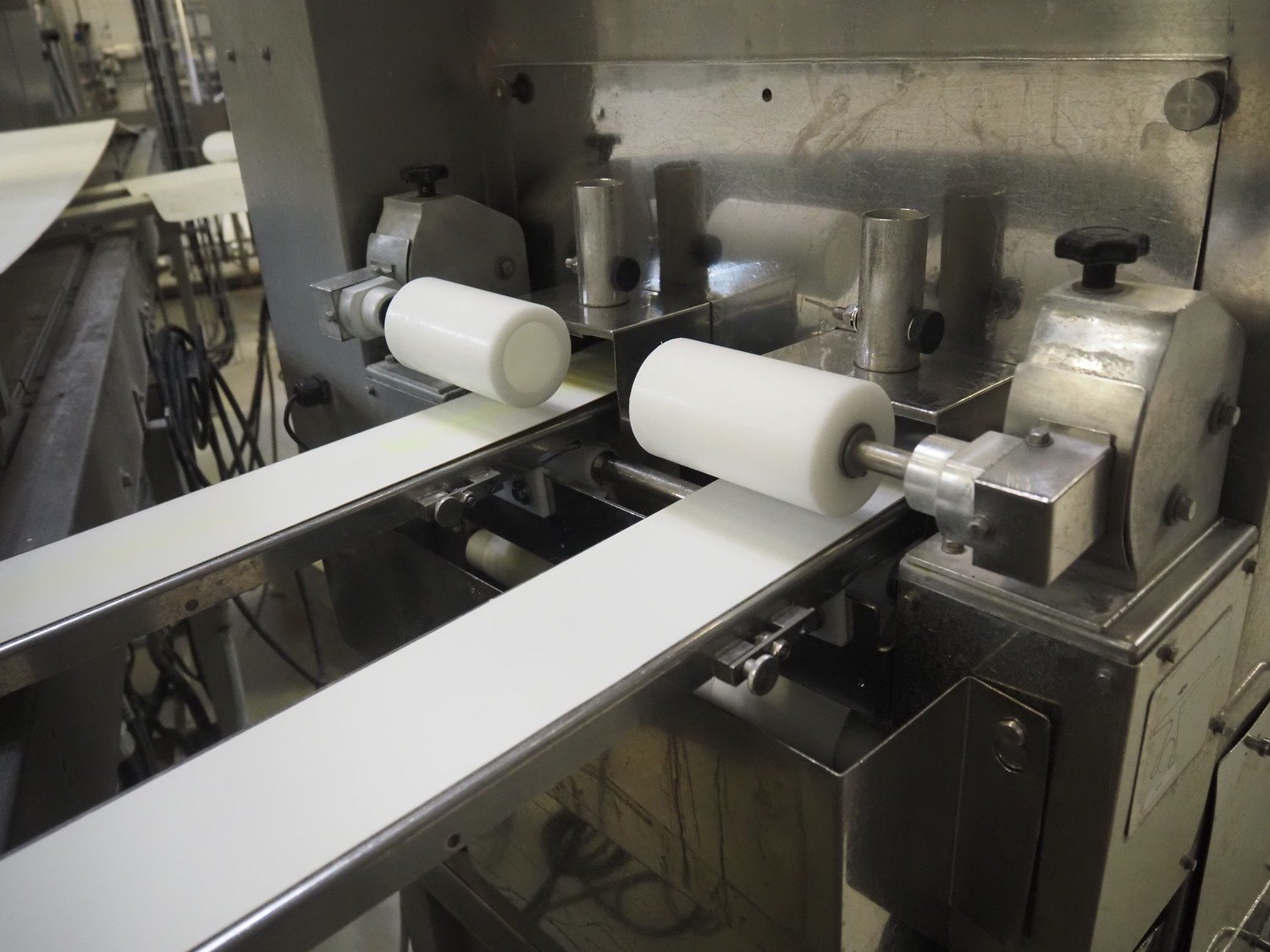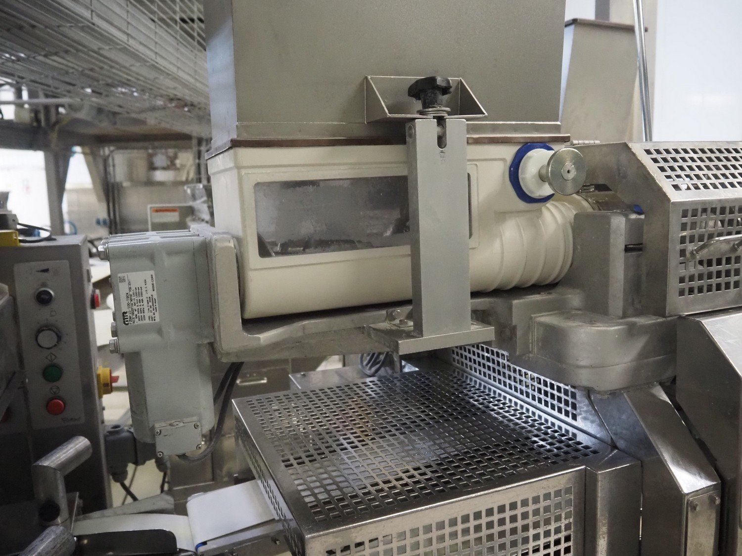 Rheon double lane encrusting machine with flour covering device, model encrusting machine: WN055, serial number: 172, year of construction: oct. 2008, 380 V, 3 Ph, 50/60 Hz, 11.3 A, 4.3 kW, plastic belt, belt width: (2x) 130 mm, total dimensions: 1700 mm x 1000 mm x 2750 mm, model flour covering device: DU220, serial number: 041, year of construction: sep. 2006, 200 V, 3 Ph, 50 Hz, 2.6 A, 0.28 kW, plastic belt, belt width: (2x) 100 mm, total dimensions: 1600 mm x 900 mm x 1750 mm. Kavel locatie: Schultetusstraße 37, 17153 Stavenhagen, Duitsland