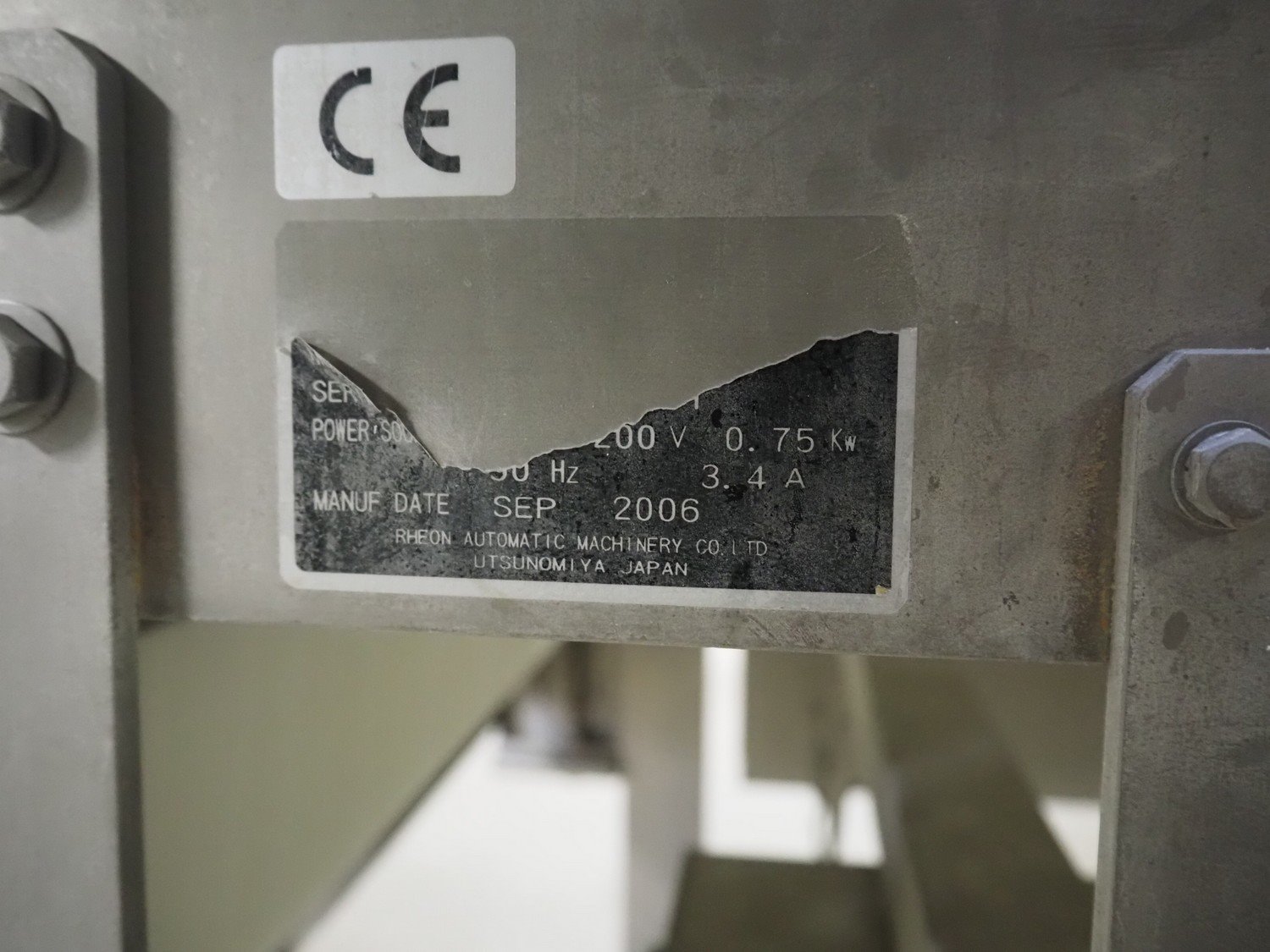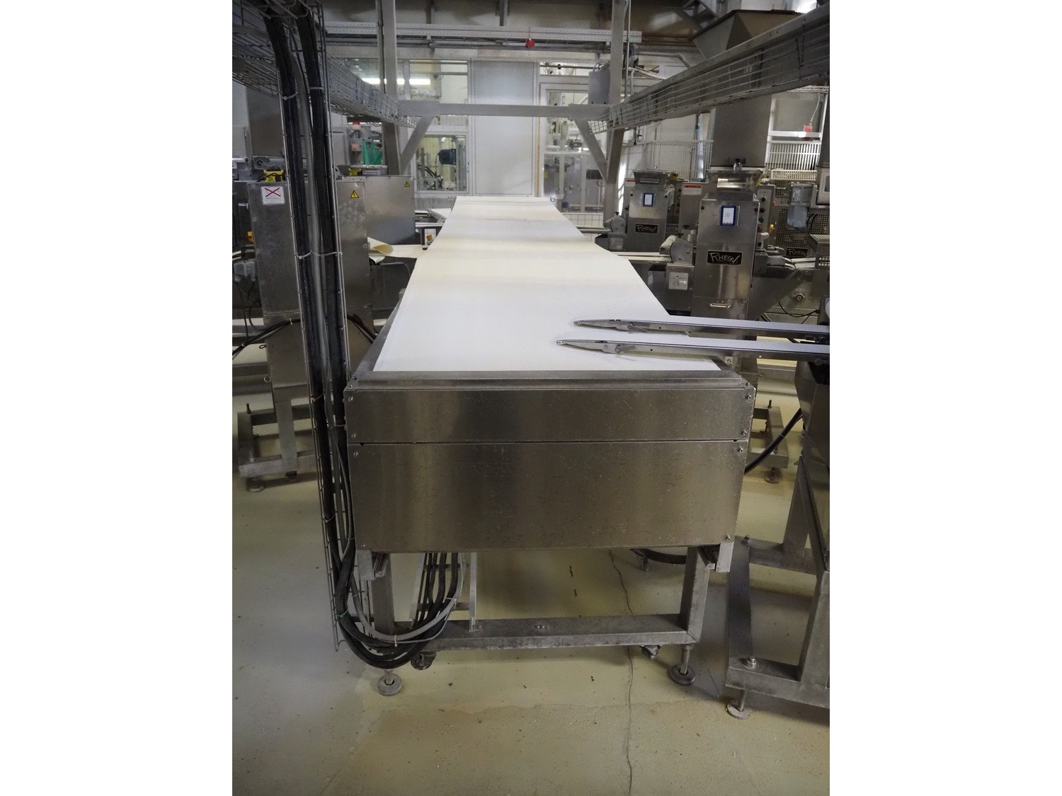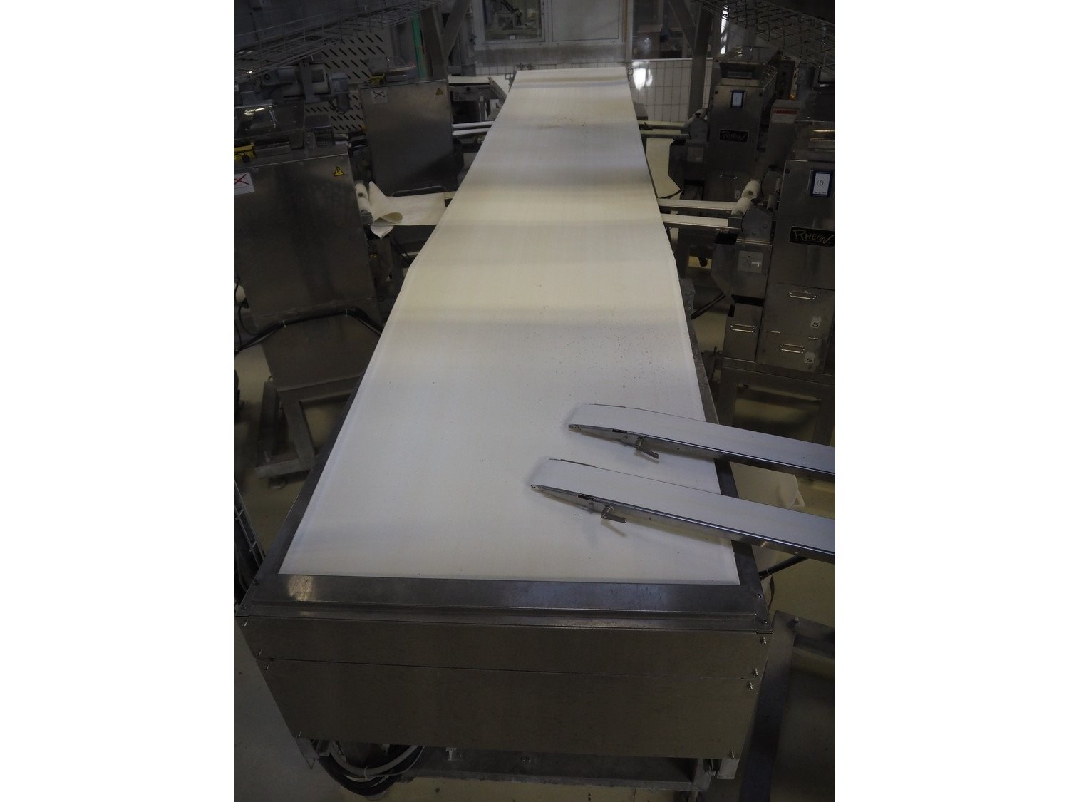 Rheon transport belt, year of construction: sep 2006, 200 V, 50 Hz, 3.4 A, 0.75 kW, plastic belt, belt width: 1000 mm, total dimensions: 6000 mm x 1100 mm x 1200 mm. Kavel locatie: Schultetusstraße 37, 17153 Stavenhagen, Duitsland